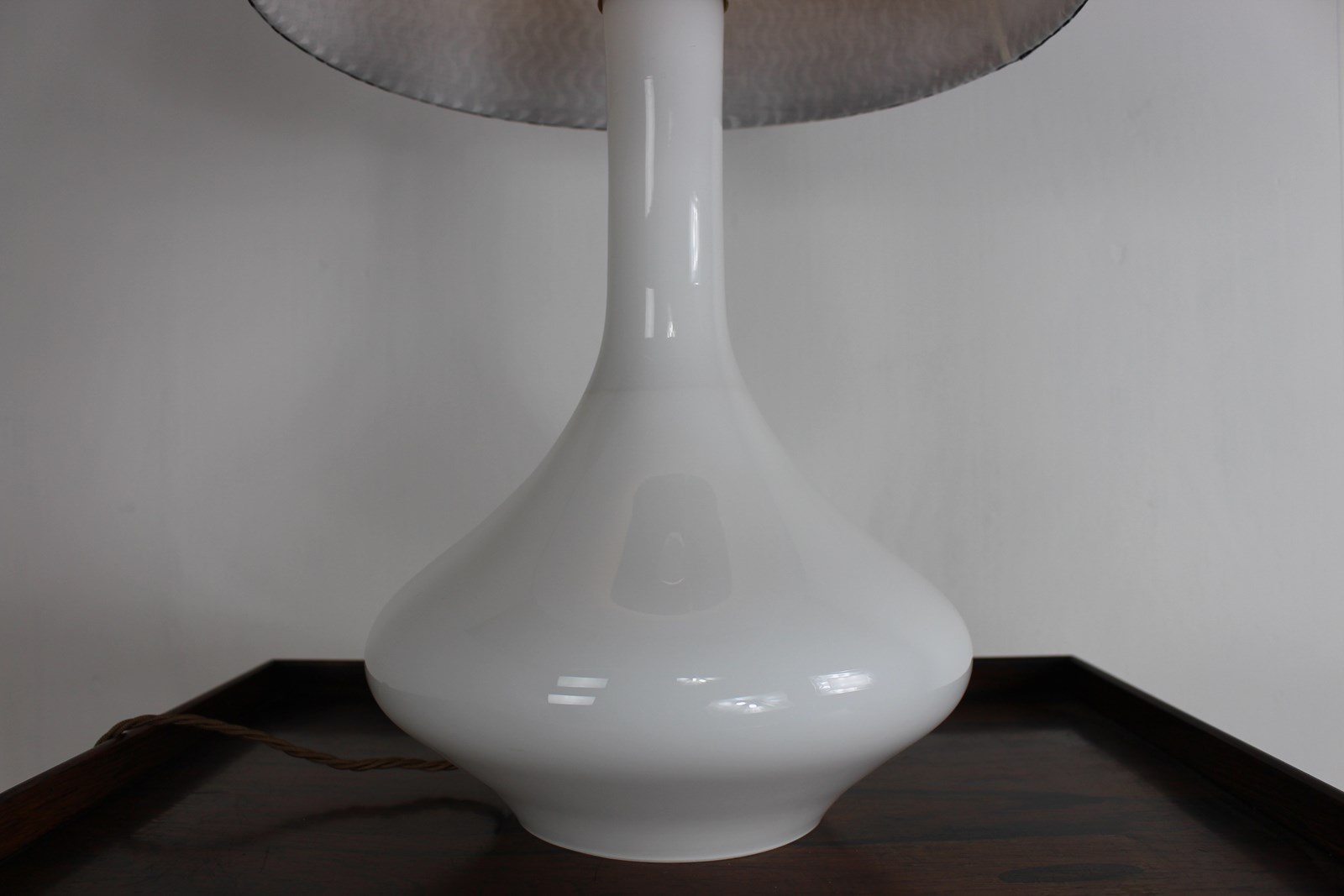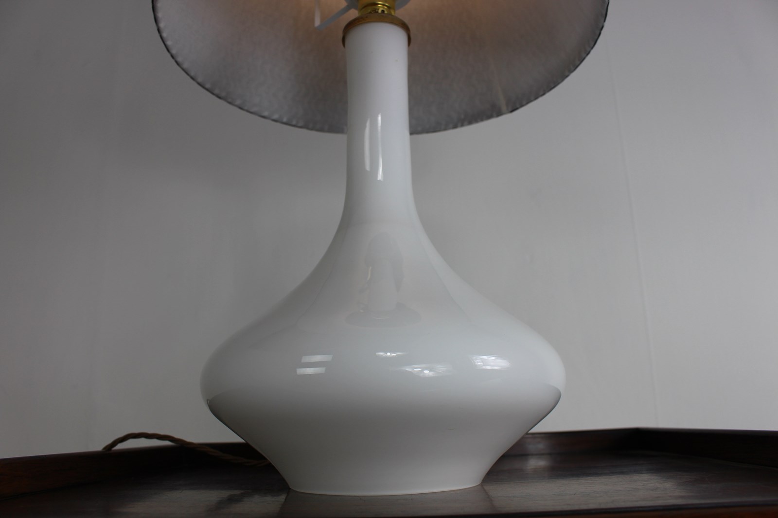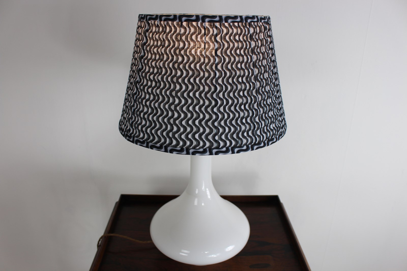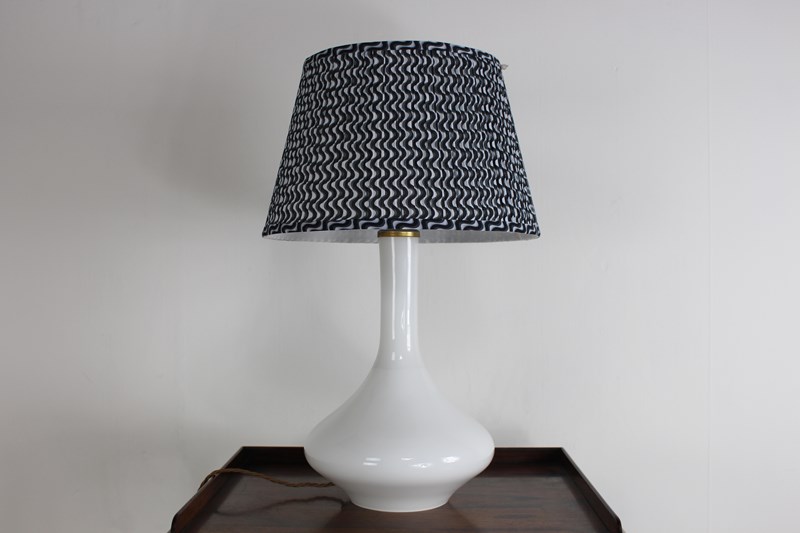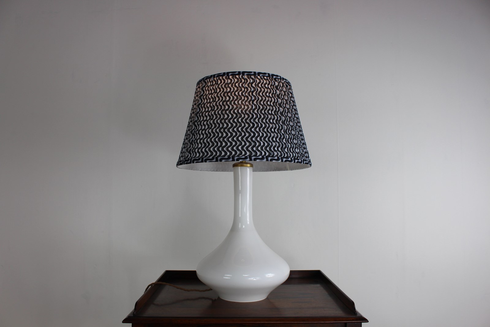 A nice simple stylish shape in white glass with a brass top . Newly rewired with a new brass fitting and twisted cord wiring to current UK standards and PAT tested so ready to use safely .