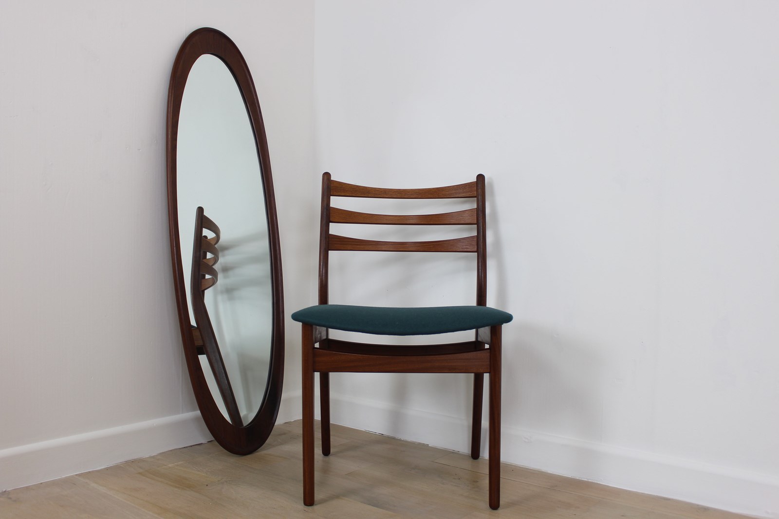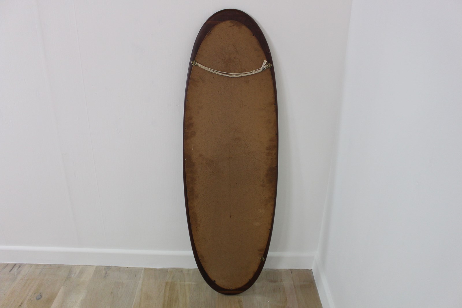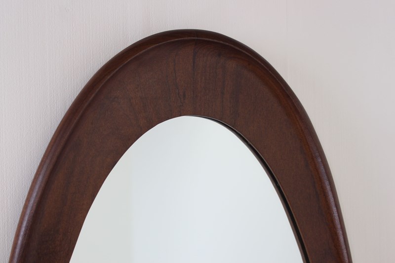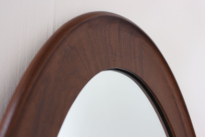 Nicer quality and noticeably larger than the usual Danish teak mirrors we usually get. Of elongated oval dished frame form we think it dates to about 1960 as the teak is darker than usual and also because we bought it with a lovely late 1950’s kitchen table and a Vanson trolley also from the late 1950’s.