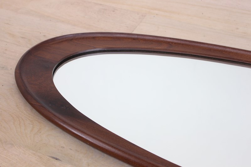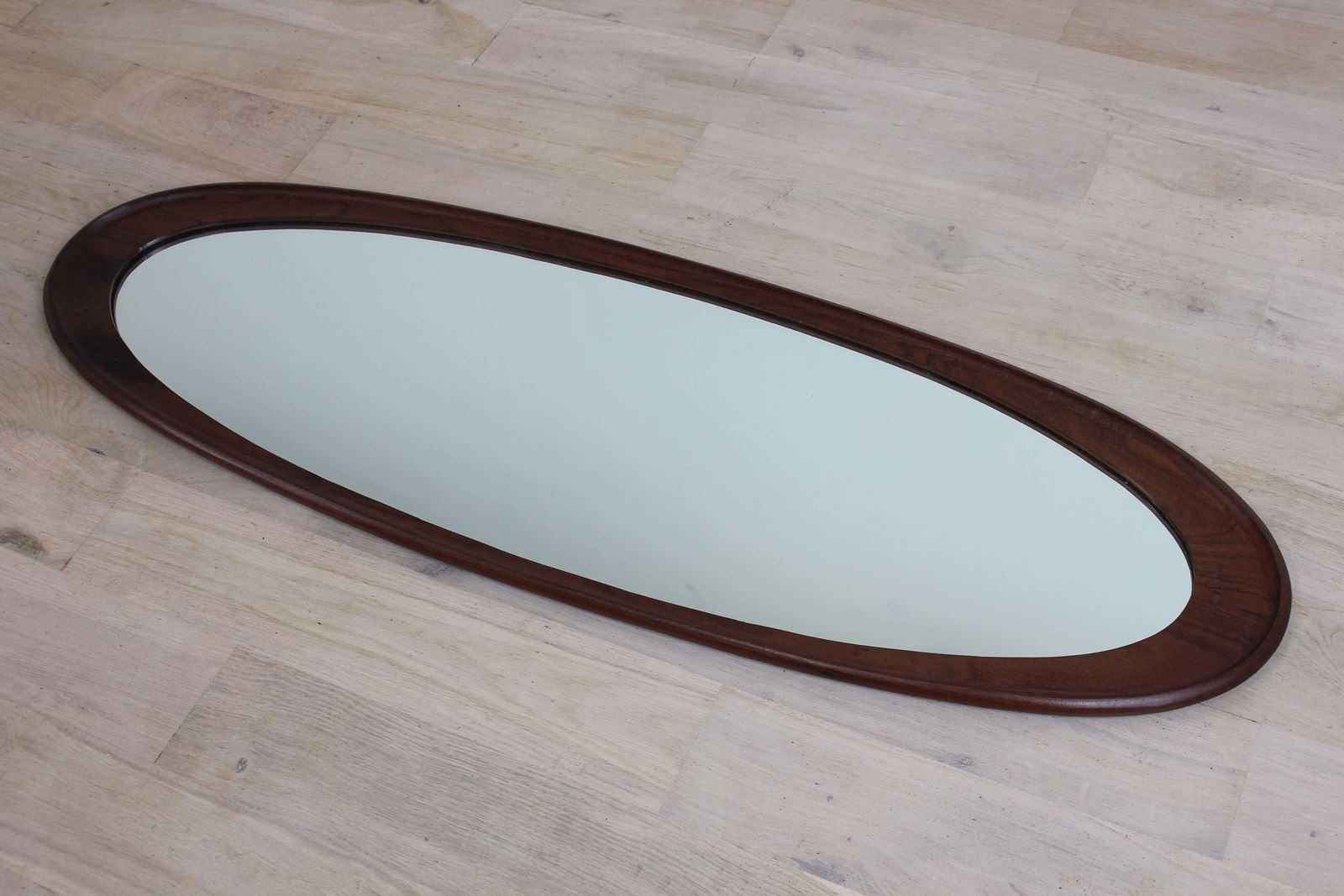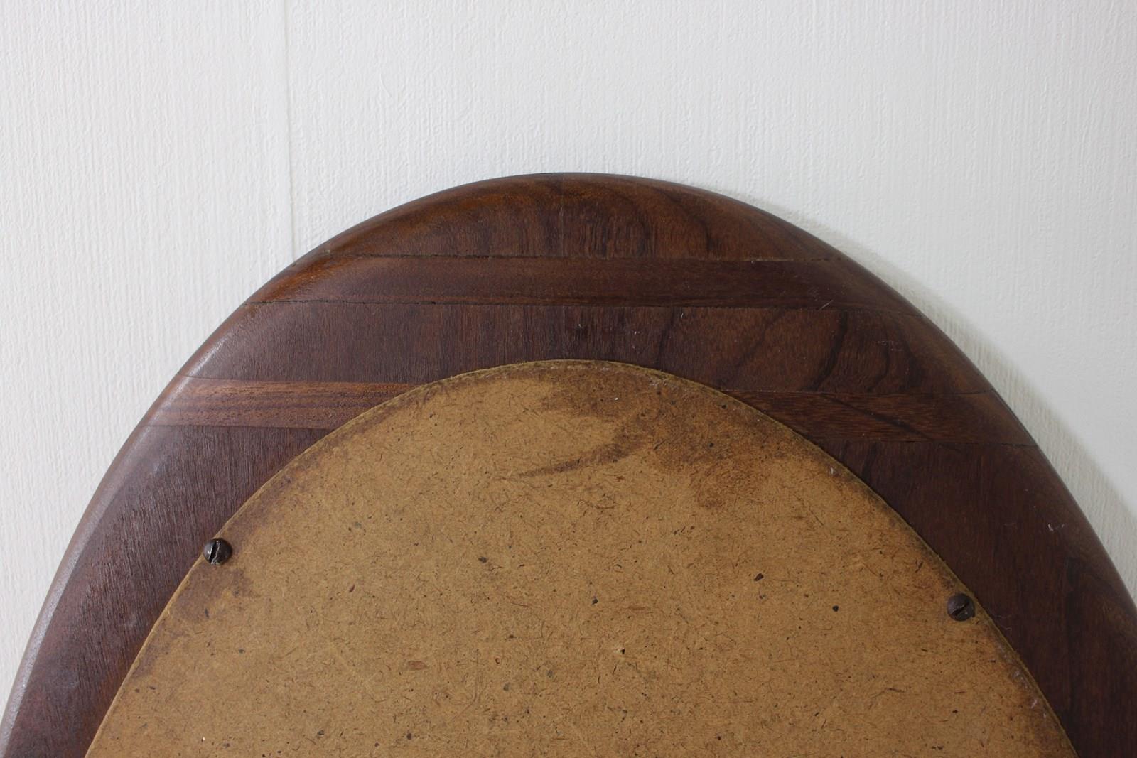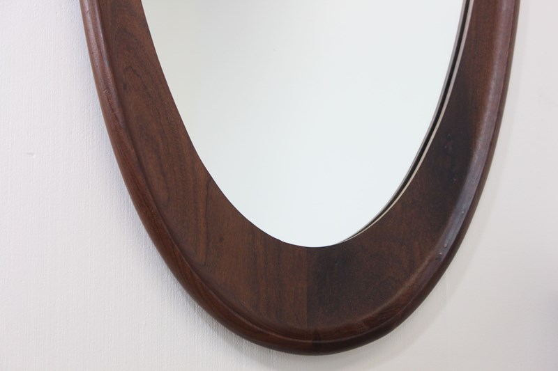 Nicer quality and noticeably larger than the usual Danish teak mirrors we usually get. Of elongated oval dished frame form we think it dates to about 1960 as the teak is darker than usual and also because we bought it with a lovely late 1950’s kitchen table and a Vanson trolley also from the late 1950’s.