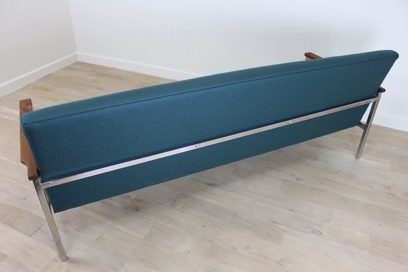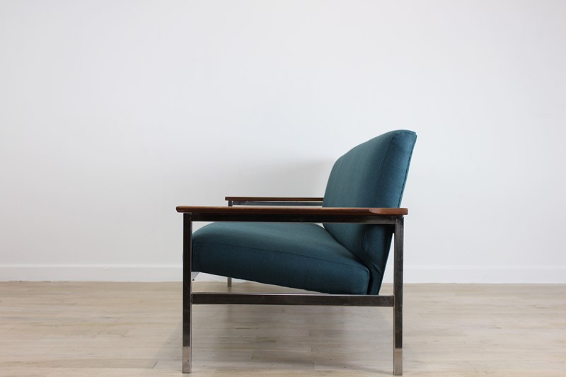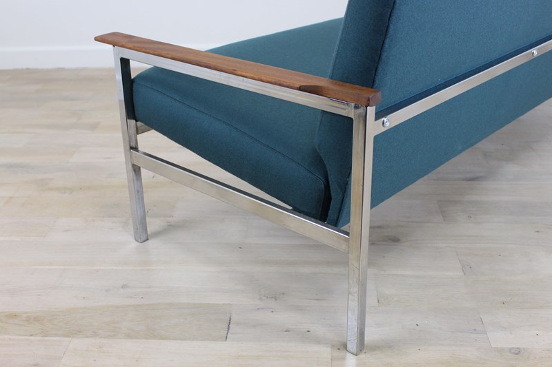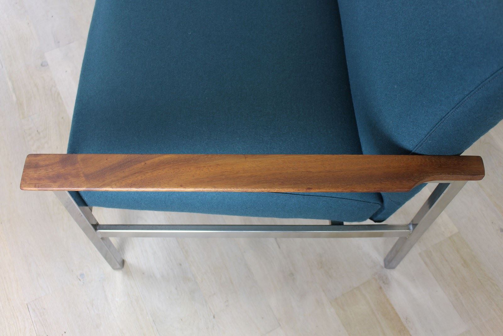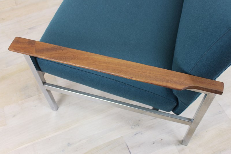 Teak arms cleaned and oiled and looking good. The chrome with a few age related marks. Totally re-upholstered by our in-house upholsterer in a lovely petrol green wool fabric. As with all vintage furniture you must expect to see some minor signs of wear if you look very closely.