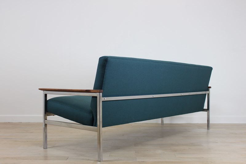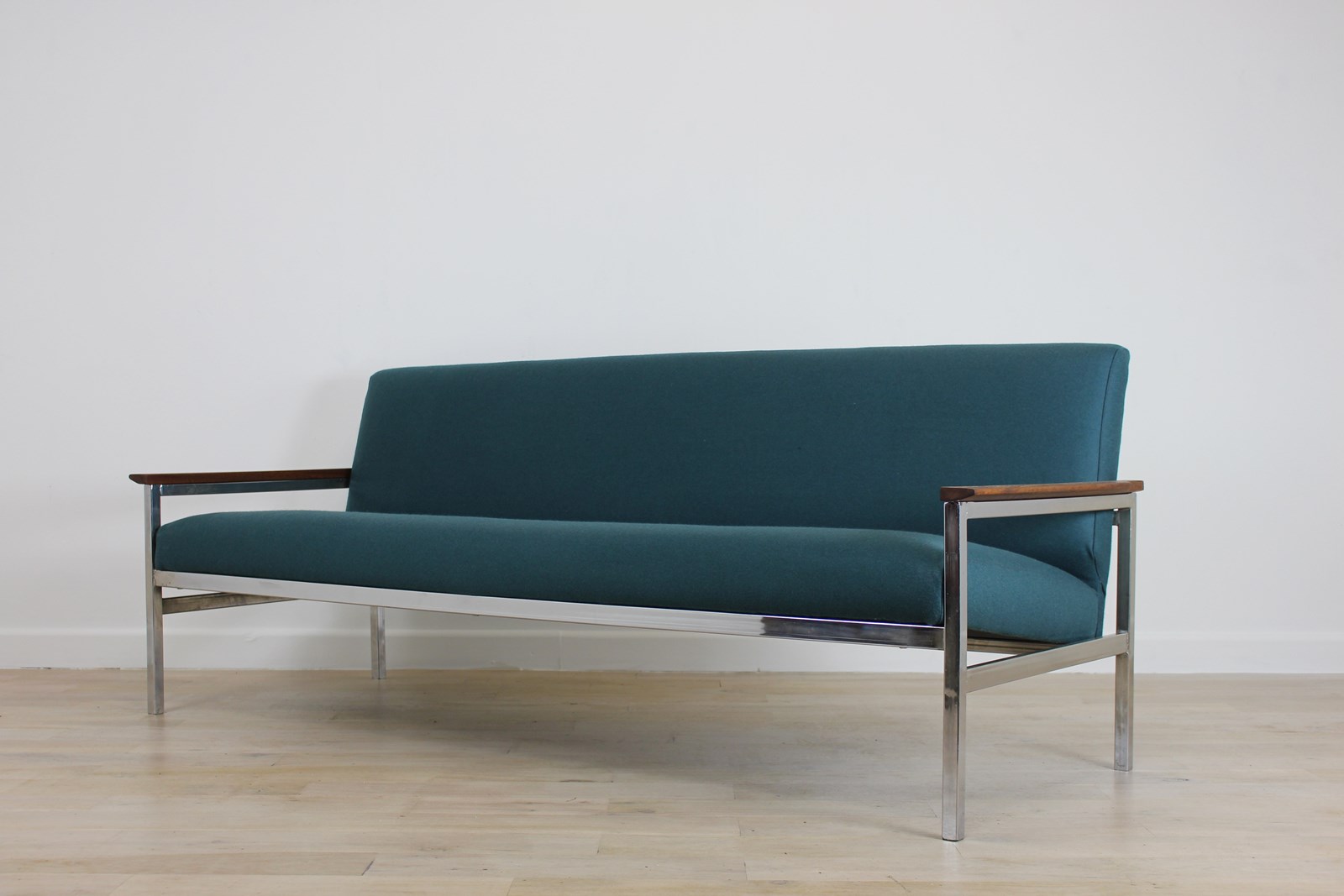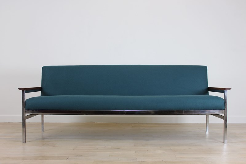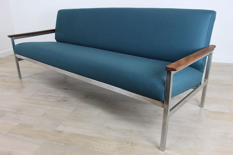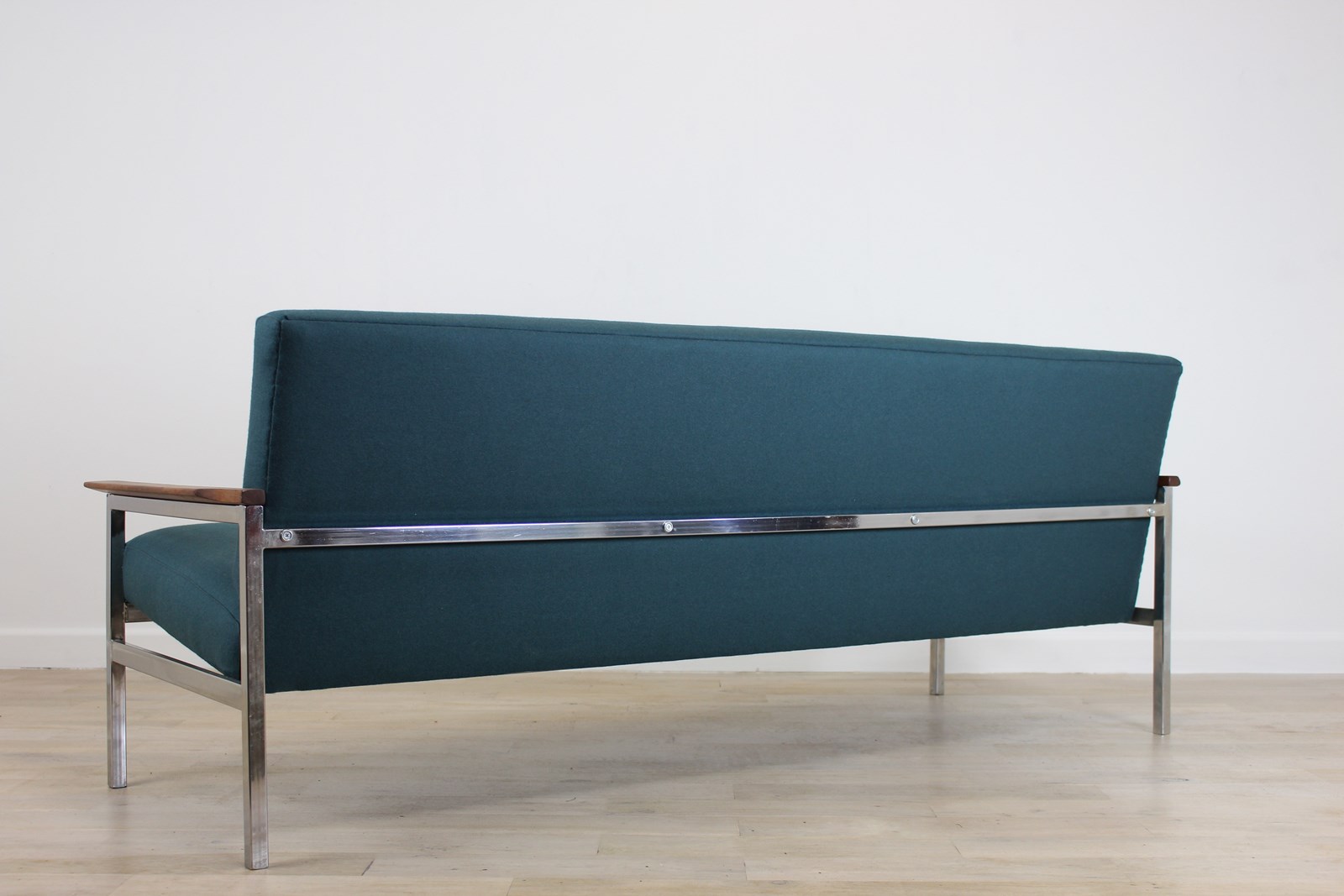 Teak arms cleaned and oiled and looking good. The chrome with a few age related marks. Totally re-upholstered by our in-house upholsterer in a lovely petrol green wool fabric. As with all vintage furniture you must expect to see some minor signs of wear if you look very closely.