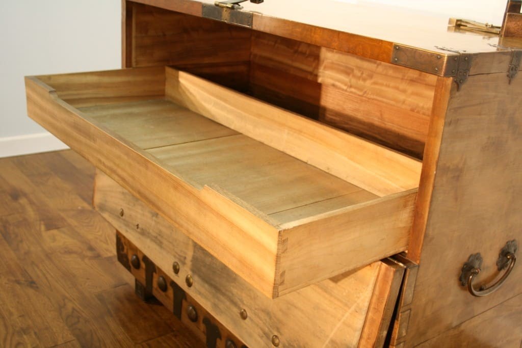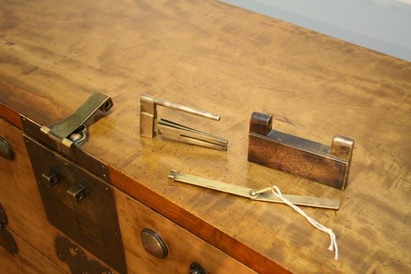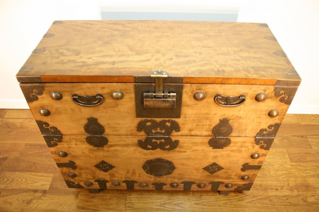 Bandaji is the term for these Front opening hinged chests. This one is a particularly nice colour and has amazing decorative metal work.