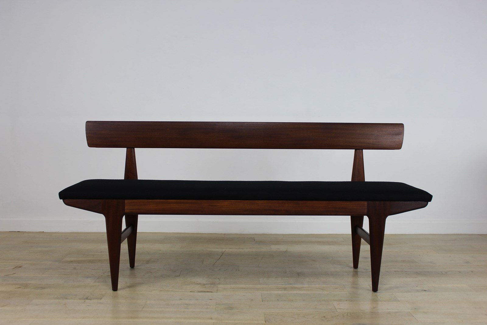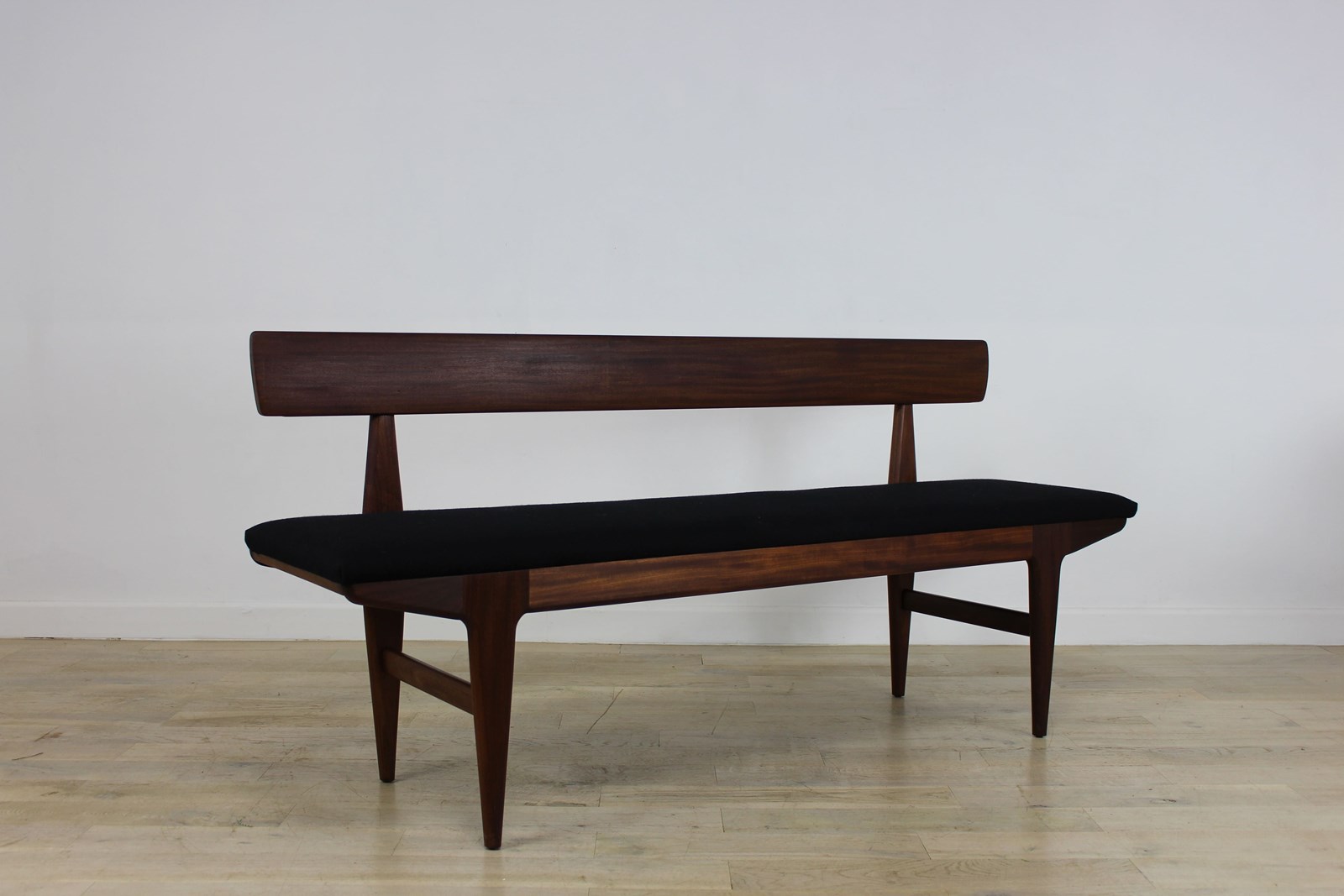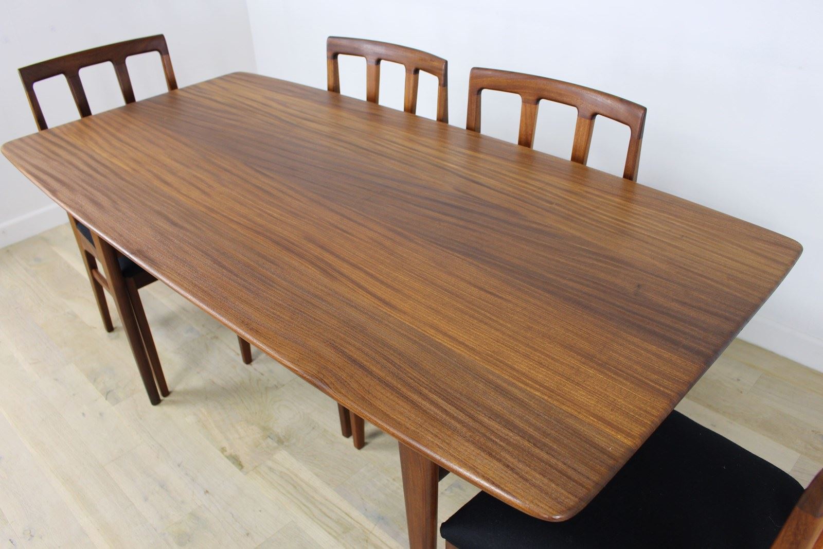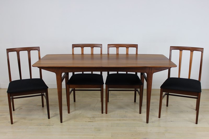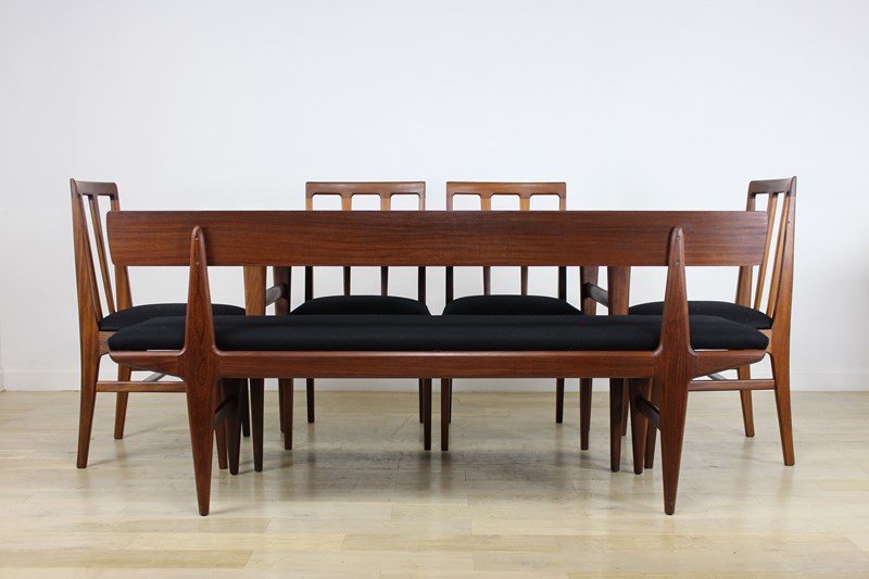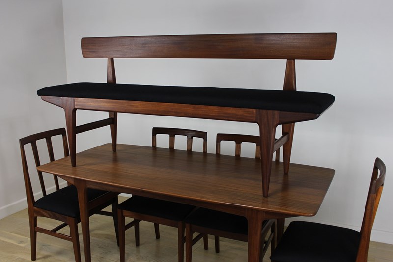 A Younger were one of the best British makers of contemporary furniture from around 1955 to the late 1960’s. Their design director John Herbert was very talented and came up with some really stylish designs. This set is from the Volnay range which was introduced in 1956 and made for over a decade such was it’s lasting popularity. You’ll see lots of Volnay sideboards for sale today, but not so many of the tables which were made in this size and a slightly longer one also. The bench was a later addition to the range, but we don’t know when it was first made but it was last shown in their 1964 catalogue whilst the table and chairs were still being made in 196, but not in 1968.