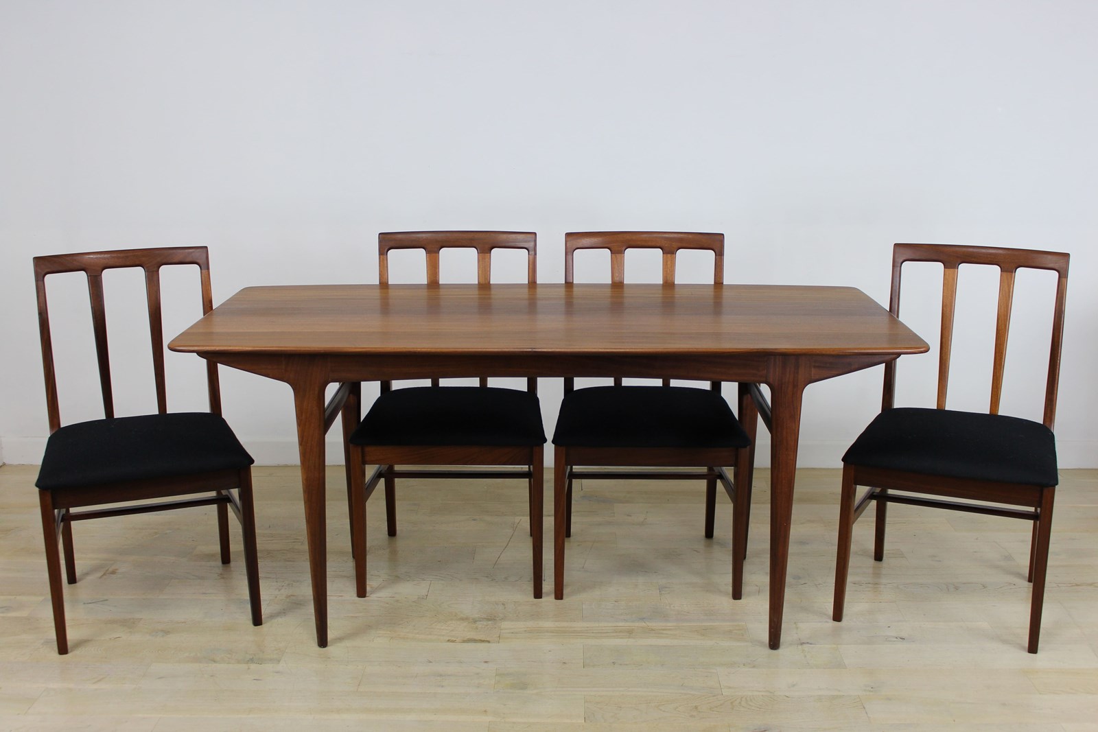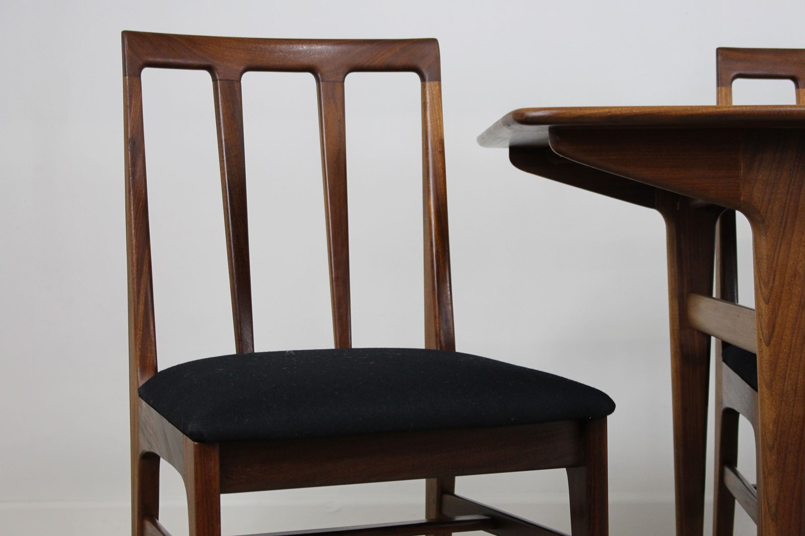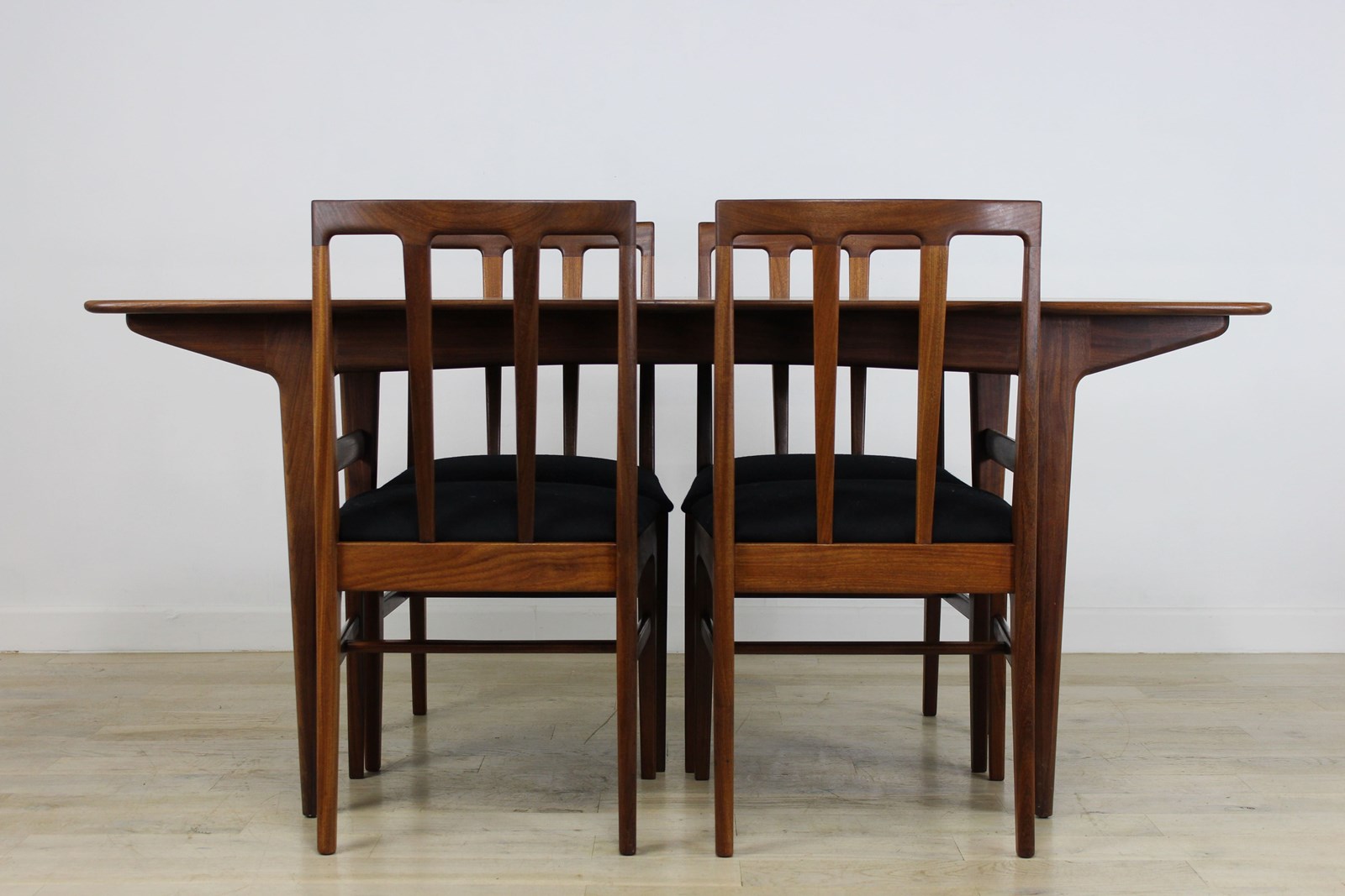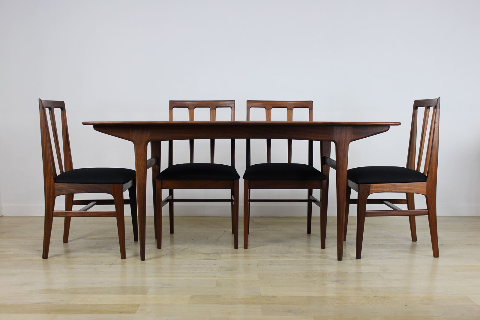 All the wood has been cleaned and oiled and is looking good with no obvious marks or damage. The seats have all been re-upholstered in a nice smart black wool. As with all vintage furniture you must expect to see some small signs of wear if you look very closely.