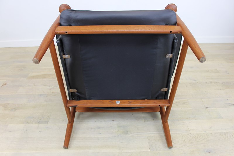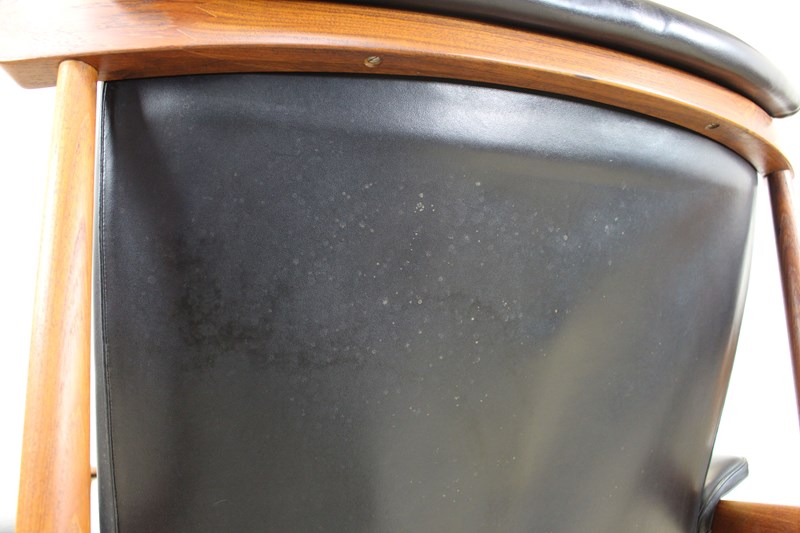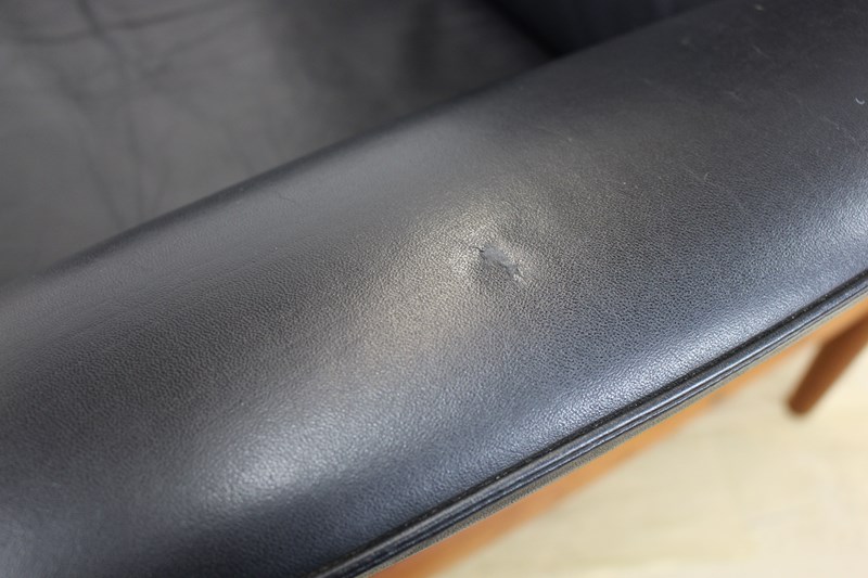 We’ve cleaned and oiled the teak frame and buffed up the original black leather. The frame is looking really nice with no obvious marks or damage. There is one slight blemish to the surface of the leather on one arm (see photo). The sprung seat base has had a new leather and cloth covering as this was looking a little tired. The back leather panel has some mottled discoloration (see photo)