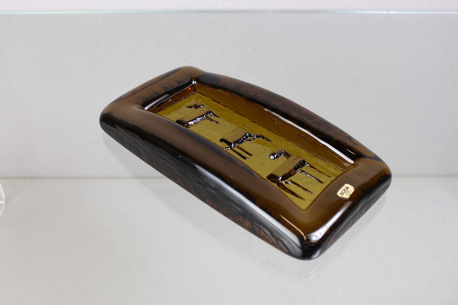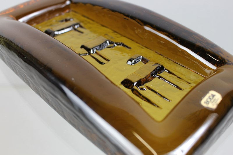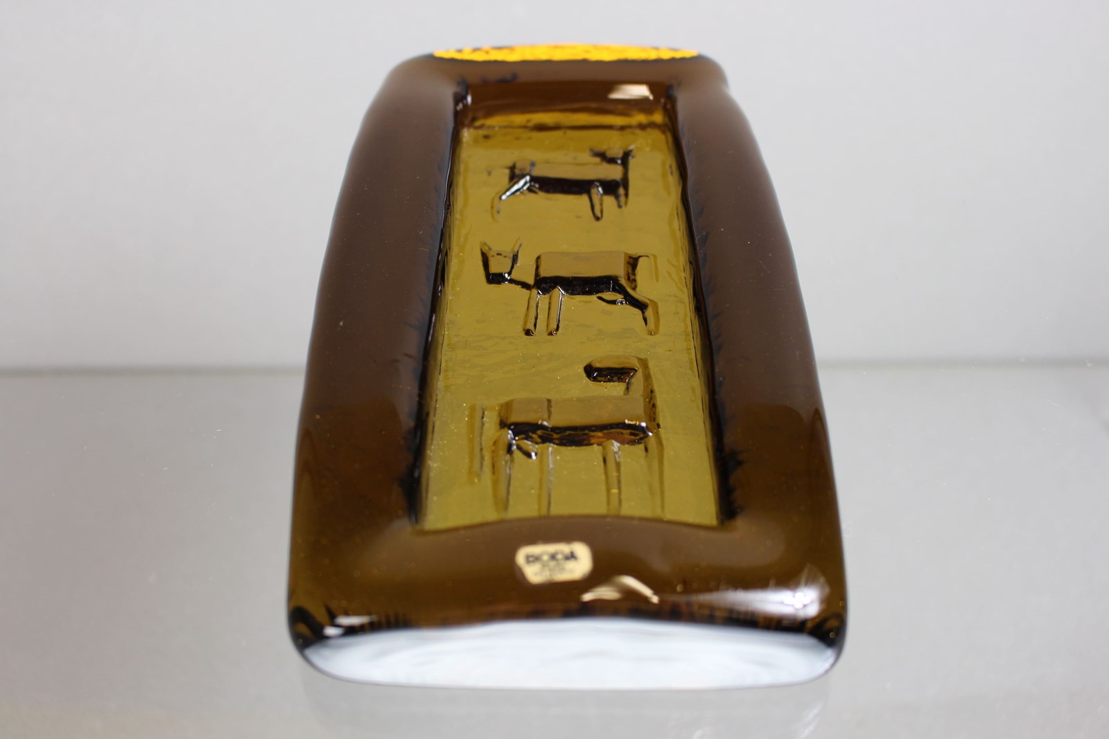 This one in a yellow amber colour with 3 stylised horses. A typical Hoglund design in what we think is the largest size of the various dishes of this type.