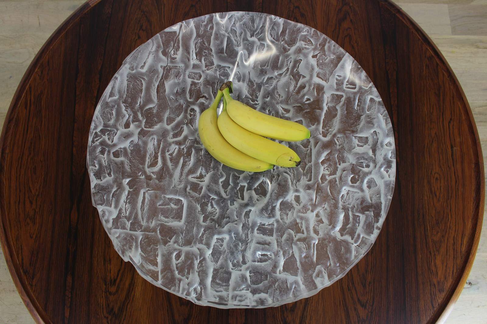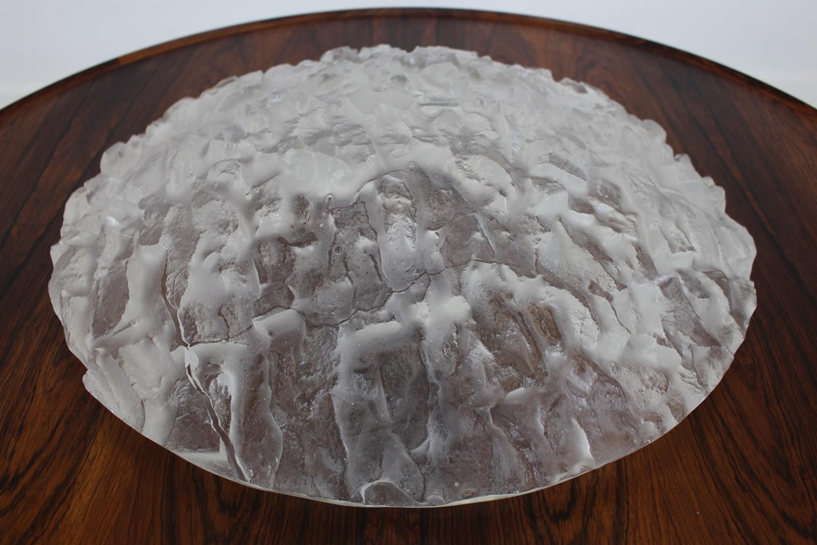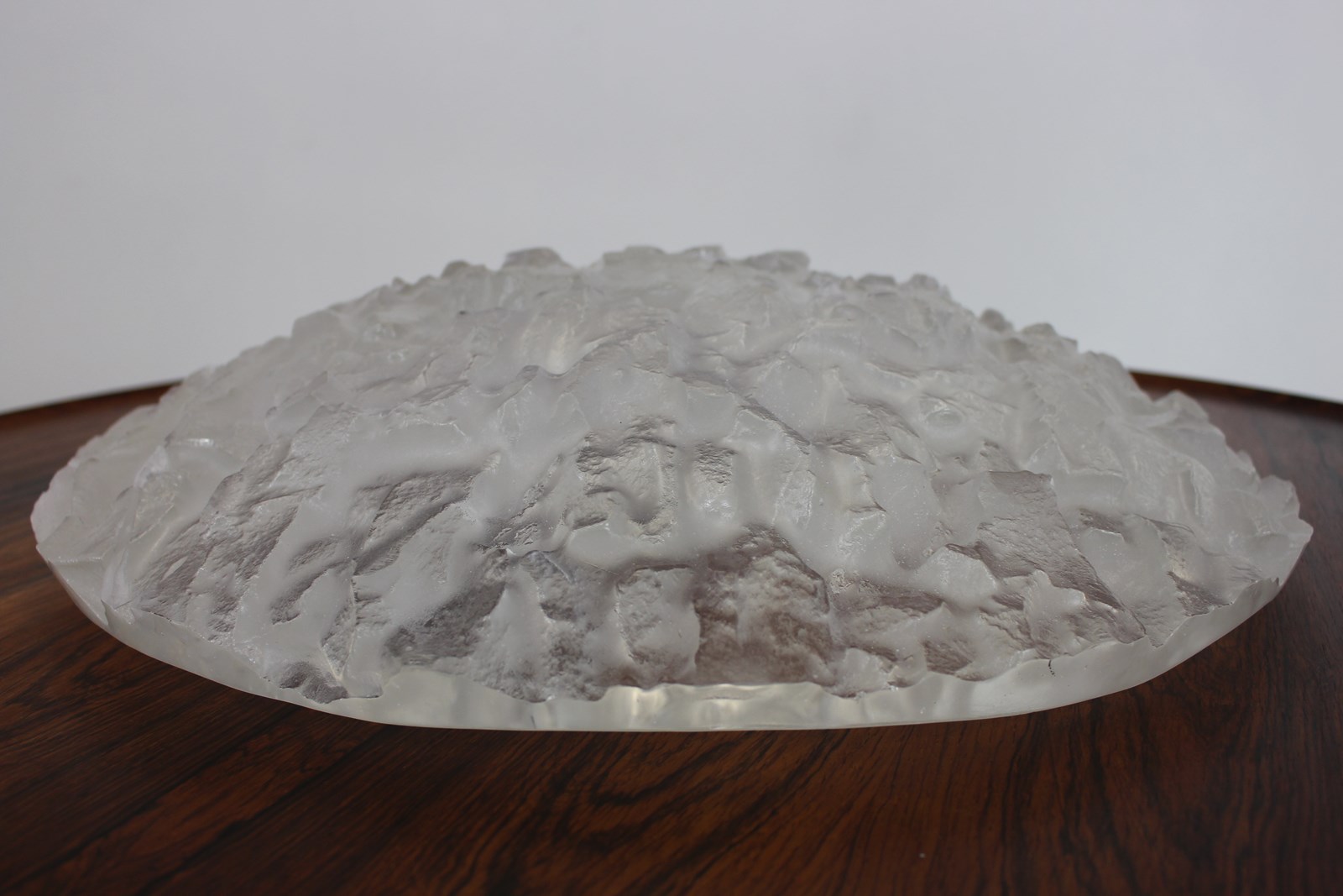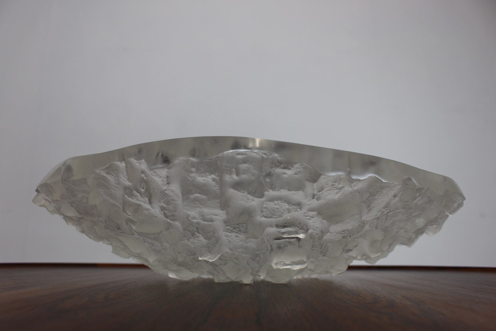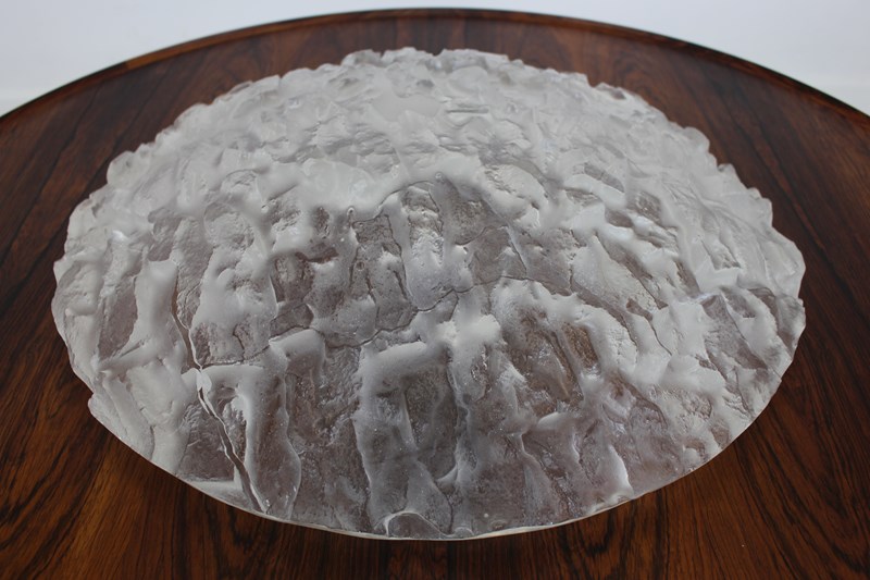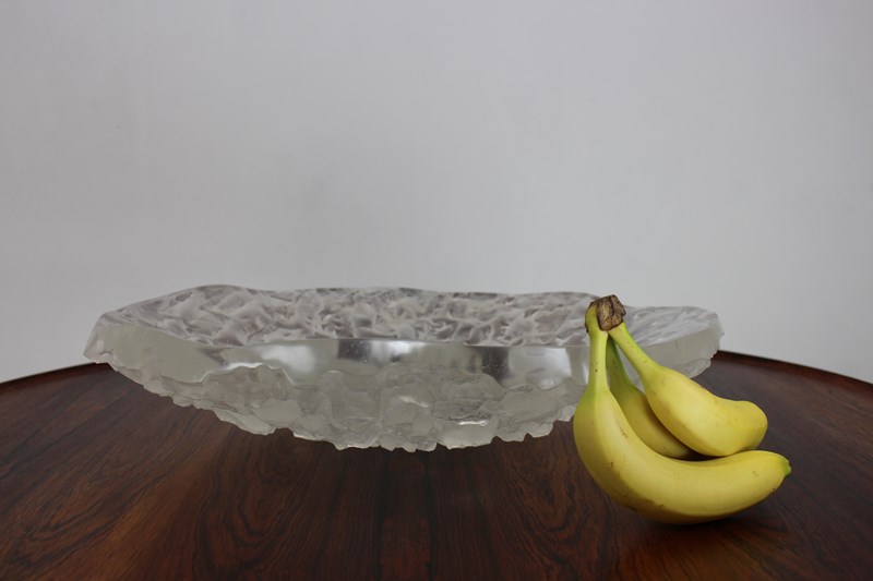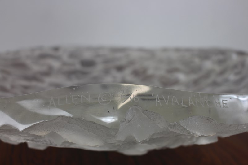 This stunning design makes a great statement centrepiece , great with fruit in it . Sarah Allen is a contemporary artist who along with her partner Nick makes small edition cast glass pieces as well as other pieces in wood or metal . This one is titled “Avalanche” with it’s icy textured finish . You can see their current work on their website .