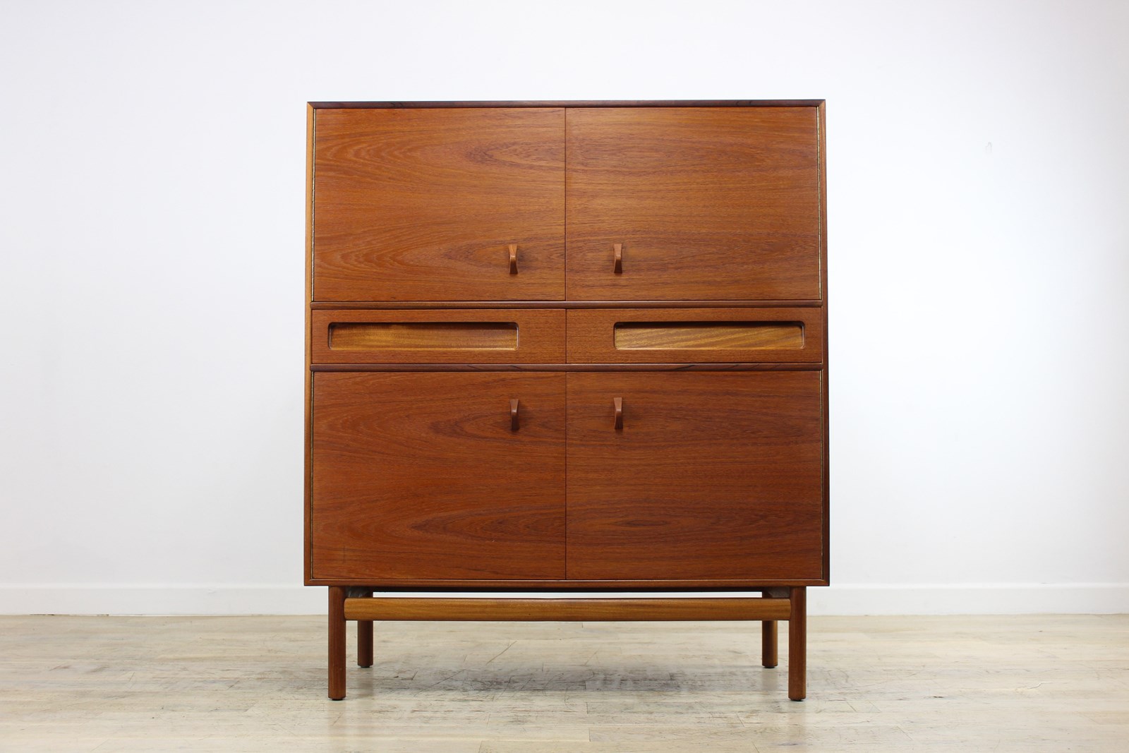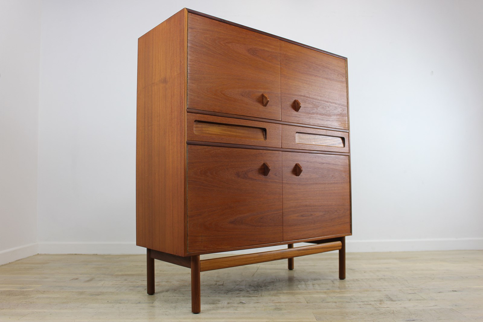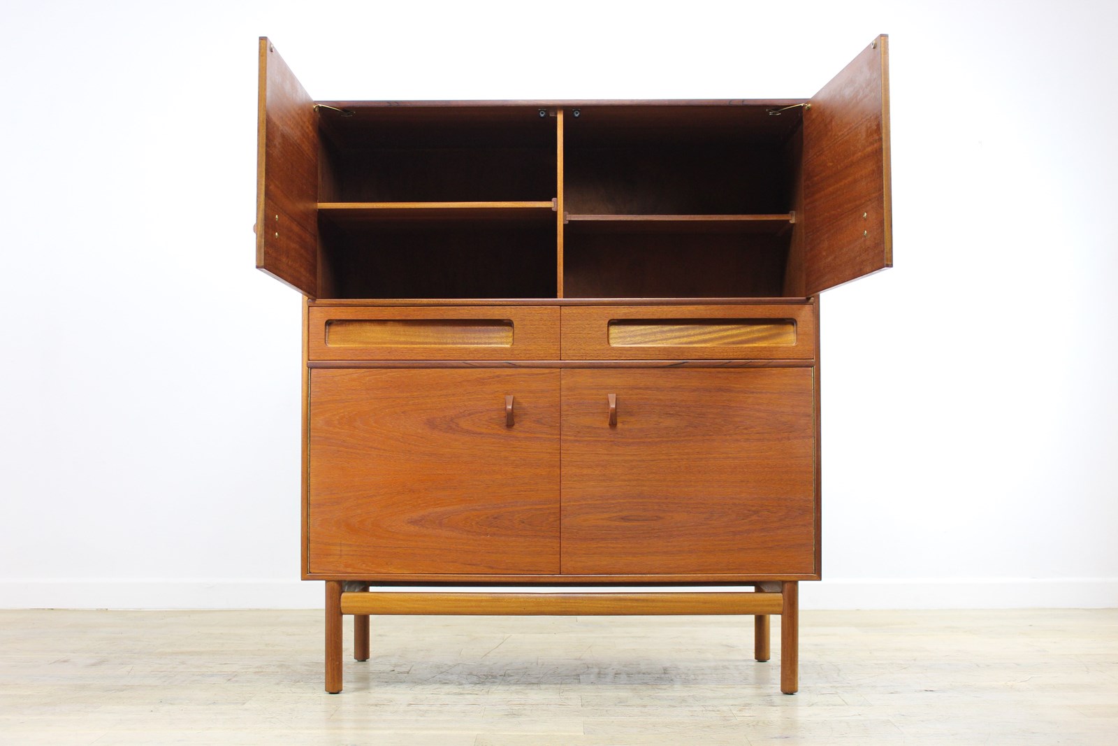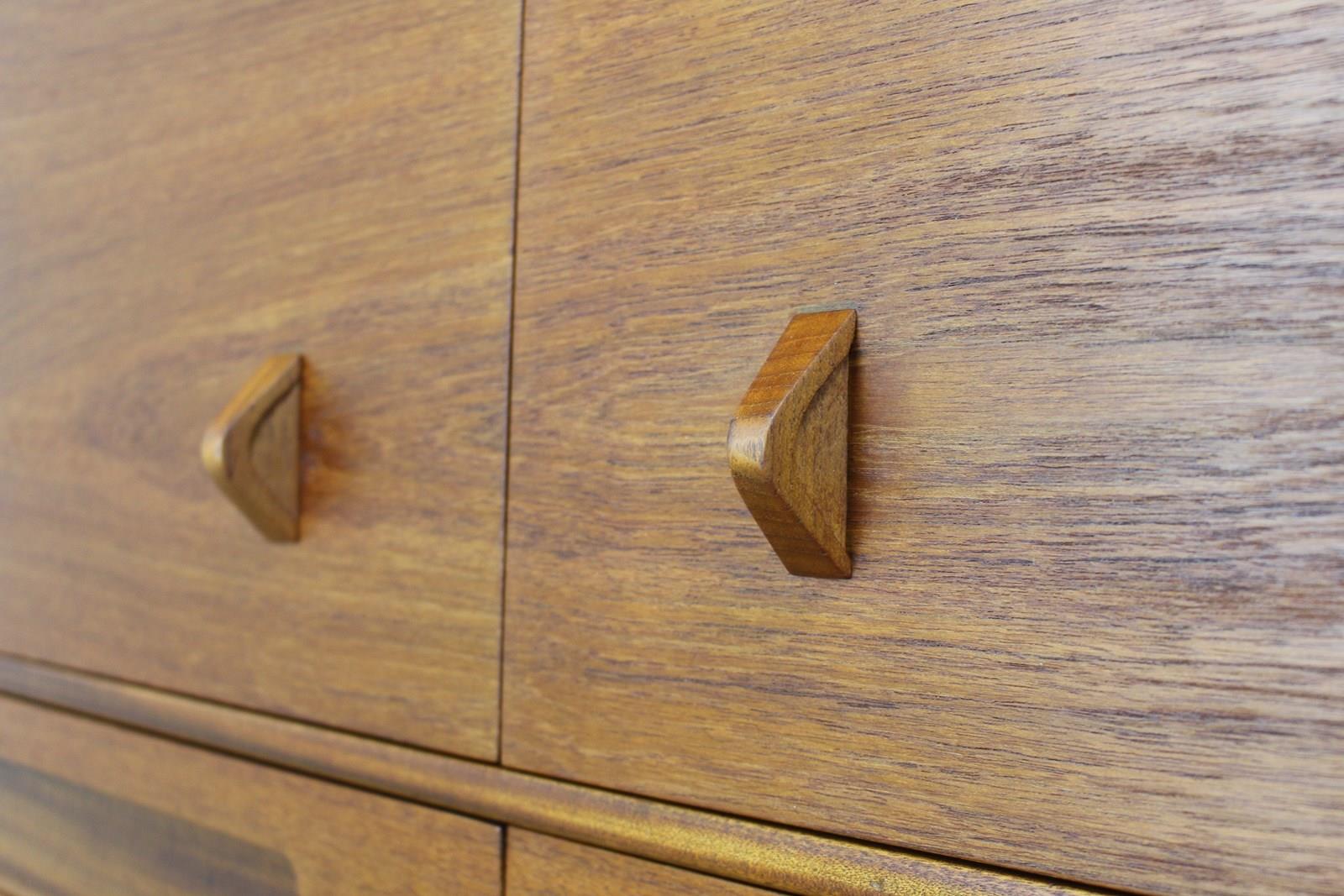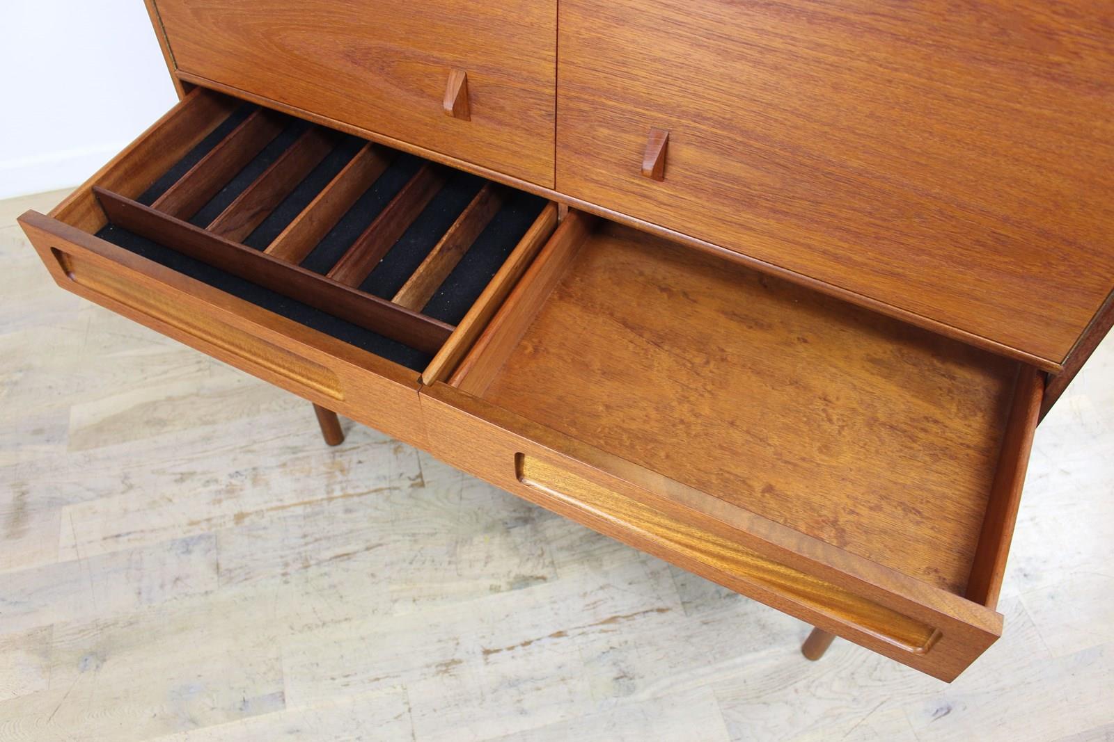 These lovely cabinets by McIntosh were made for a short time in the mid-1960s having been introduced in 1965. This version in teak was called the Dundas, but they also produced a more expensive version in rosewood called the Dunsyre. In their 1966 catalogue it was described as a sideboard, but we do think it’s more a cabinet than a sideboard. It’s cross between a dining room sideboard and a living room cocktail cabinet. It doesn’t appear in any of the late 1960s catalogues we have so we don’t think it was made for more than 2 or 3 years.