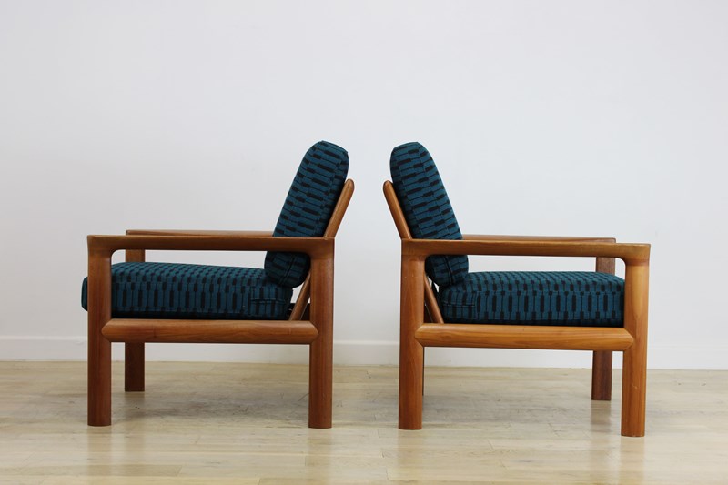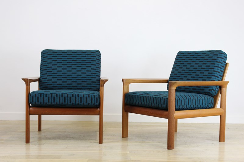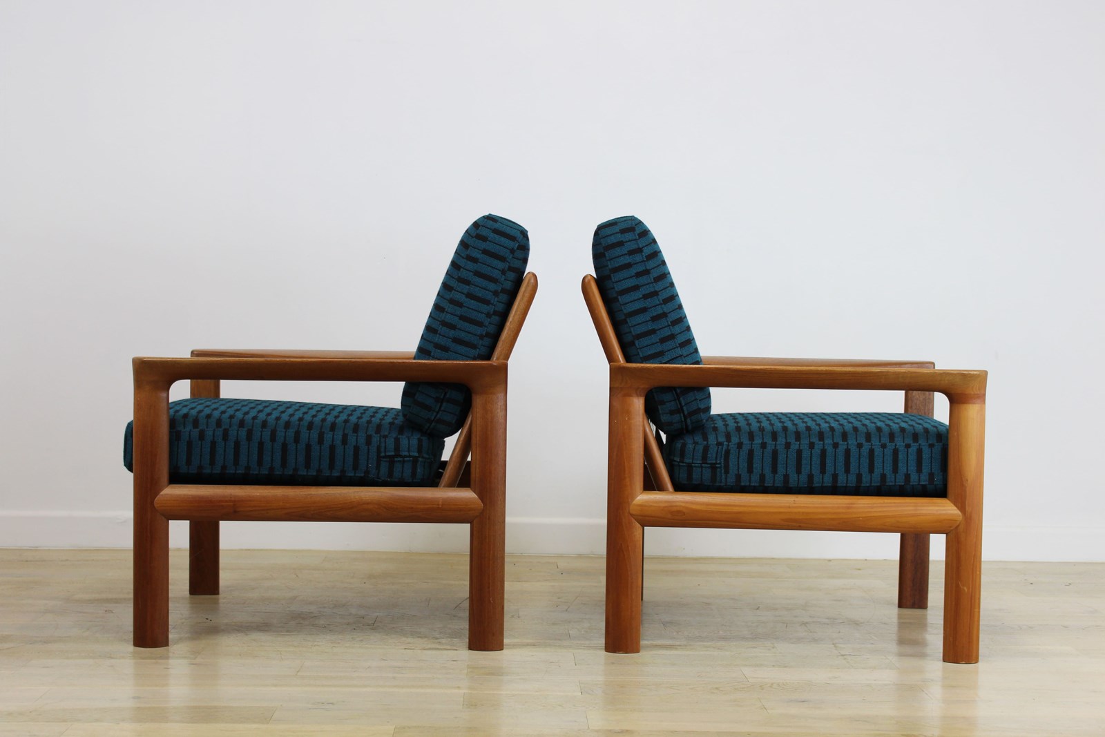 A stylish and great quality pair of solid teak framed armchairs with new zipped cushions in a woven petrol and black wool fabric from Eleanor Pritchard. Unfortunately this lovely top quality fabric is no longer available which is a great shame as it works so well with Mid-Century pieces.