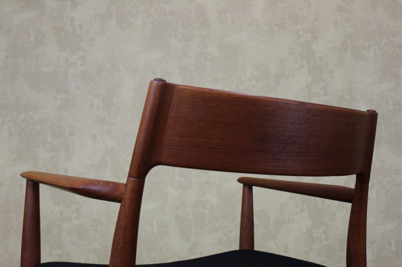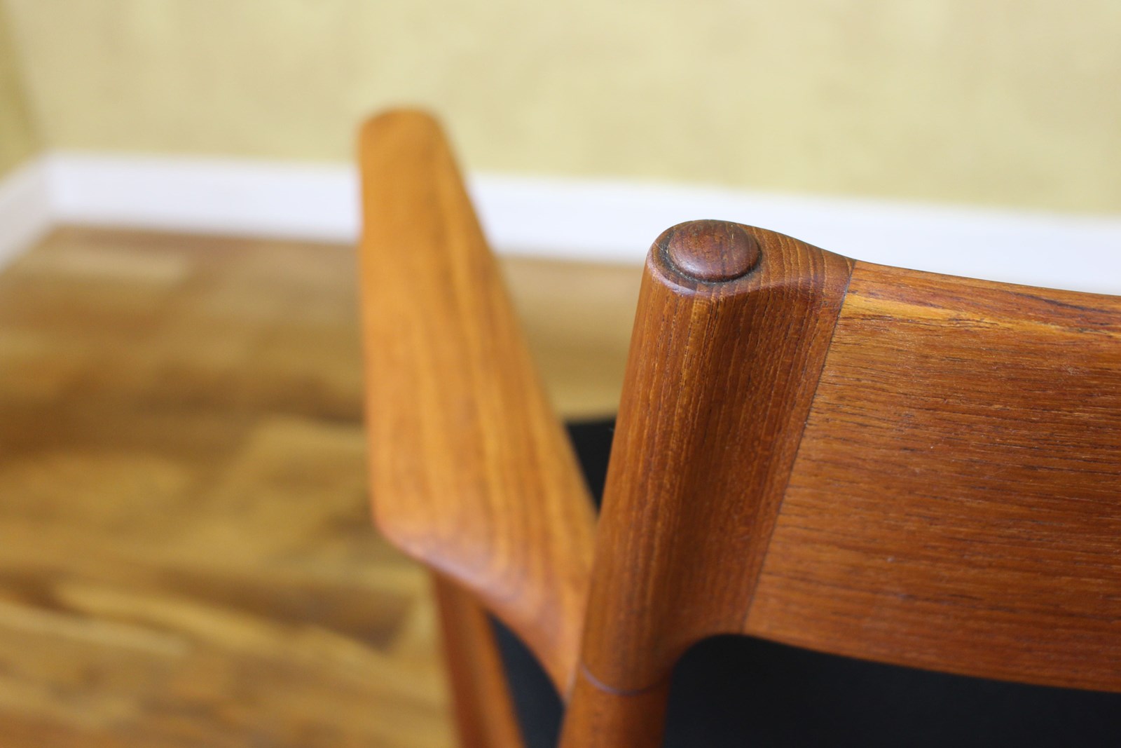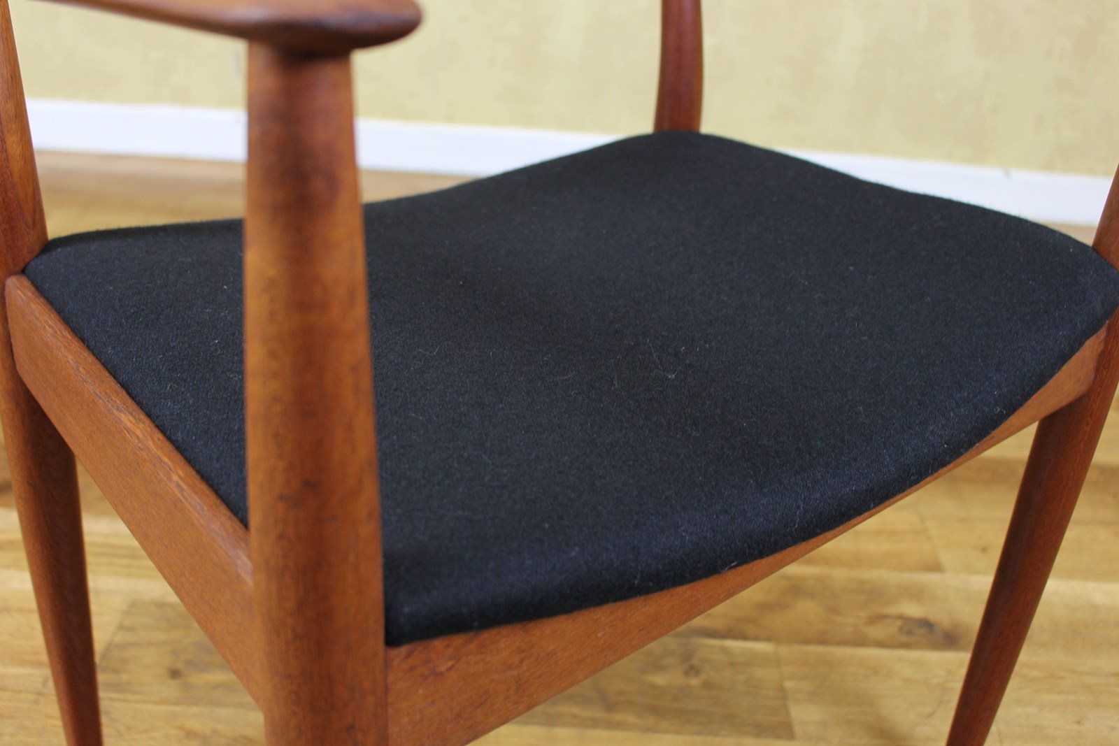As with all Mogens Kold pieces the detailing is excellent and they would have been very expensive when new. When we bought them they were upholstered in a worn black vinyl which along with papercord was the go-to finish for most 1960’s dining chairs. Today the use of vinyl rather than leather seems a bit odd, but at the time artificial materials were the norm. We’ve had them re-upholstered in a lovely jet black wool which suits the design and is so much nicer than vinyl.