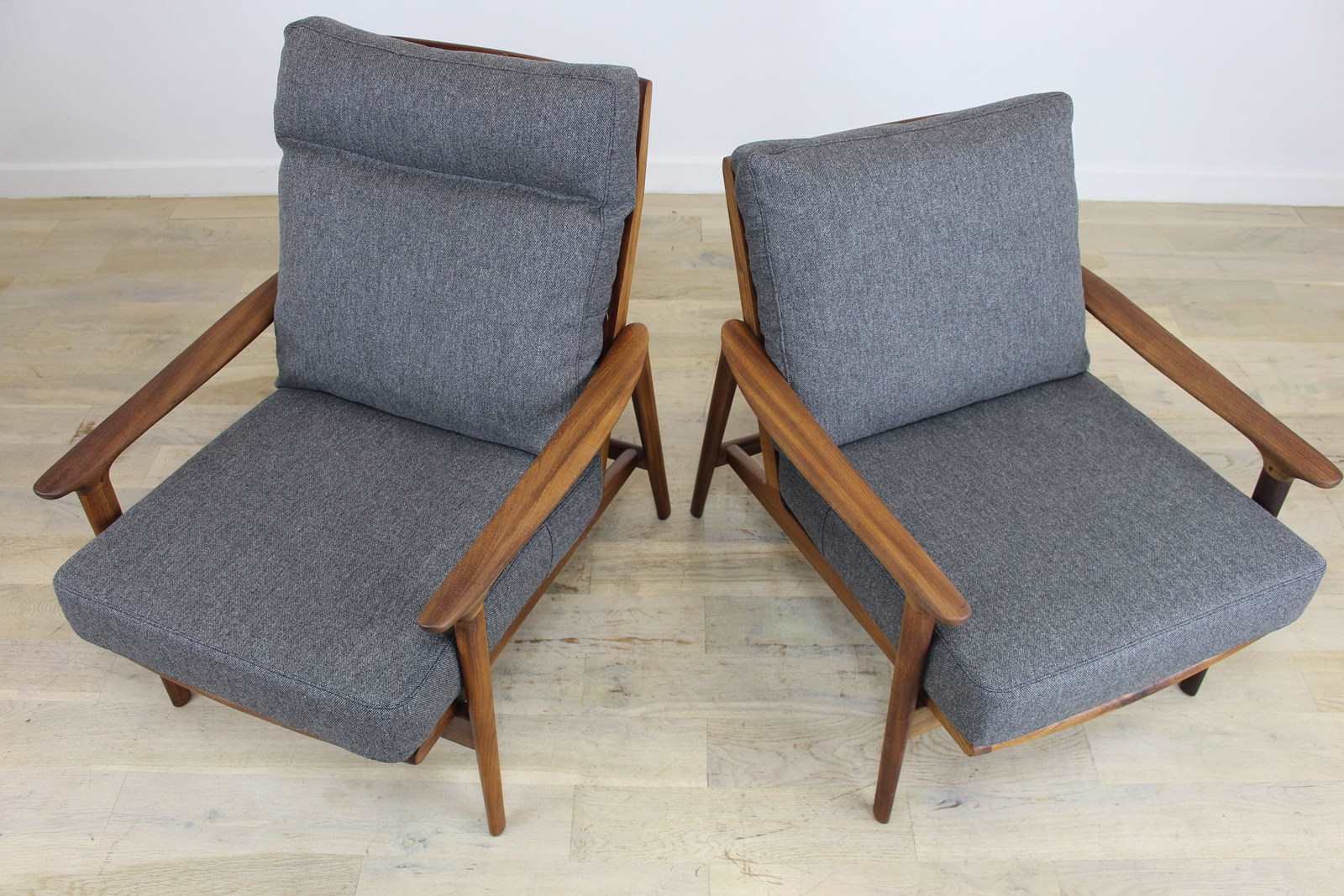 A lovely pair of 1960’s Danish style solid afrormosia armchairs with new upholstery . Afrormosia is sometimes called African teak but is a slightly darker wood that was used by good British makers in the early and Mid 1960’s.