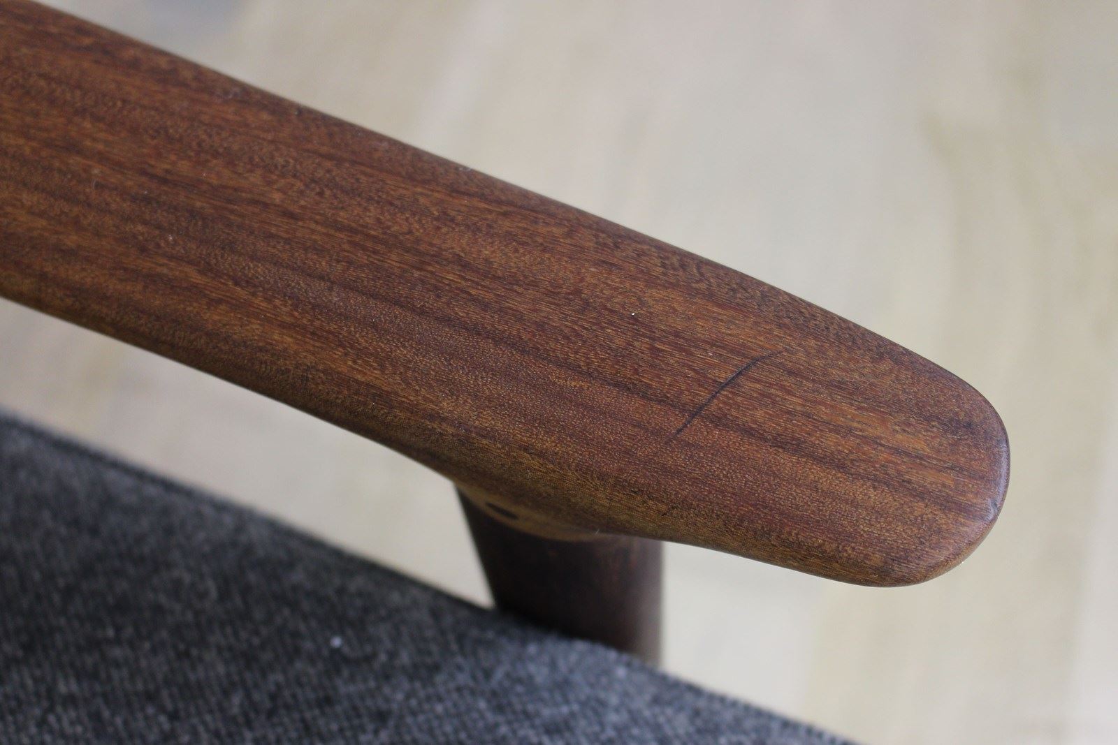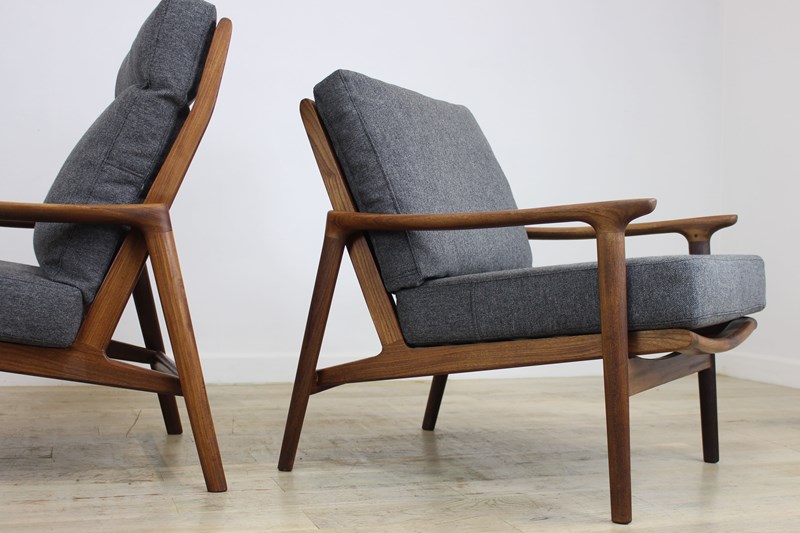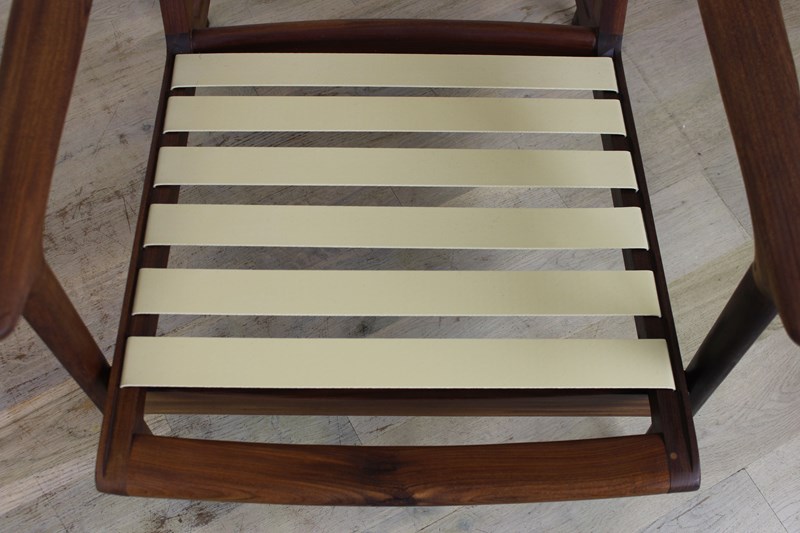 The frames have been fully cleaned and oiled and are in great condition. There is one scratch on an arm which is shown in one of the photos.The webbing is new Pirelli rubber webbing as per used originally. Pirelli webbing is a lot more expensive than normal upholstery webbing but it usually lasts 40 to 50 years. The seats have foam fillers and the backs are fiber filled which give a softer feel and look. New zipped cushions covers are in a Camira Mainline Flax.