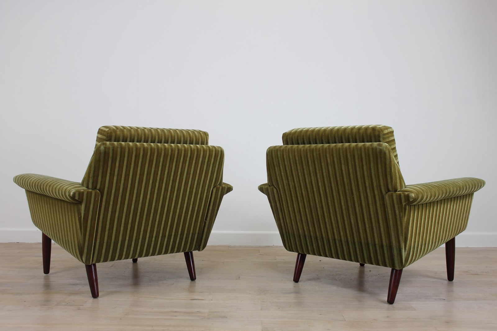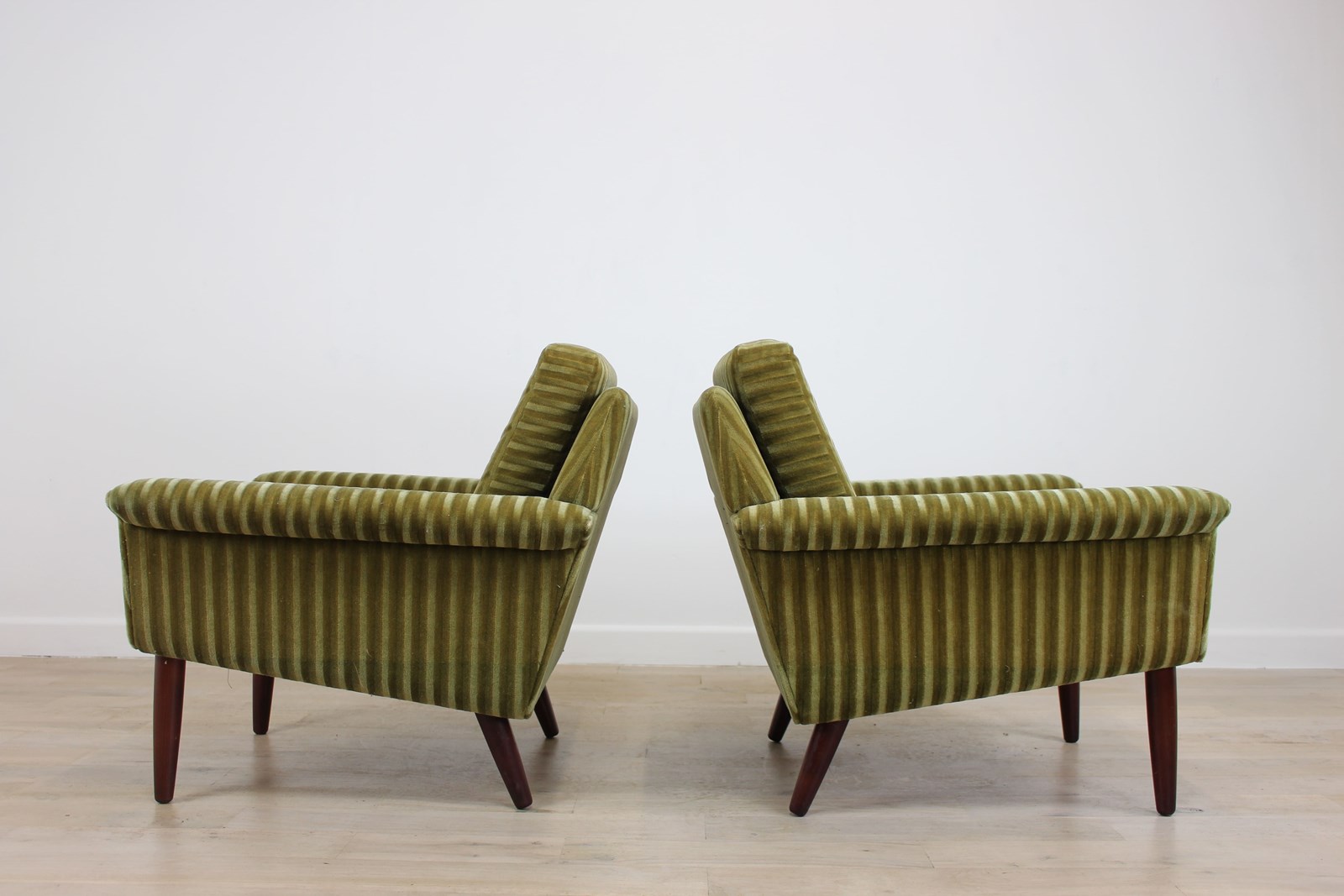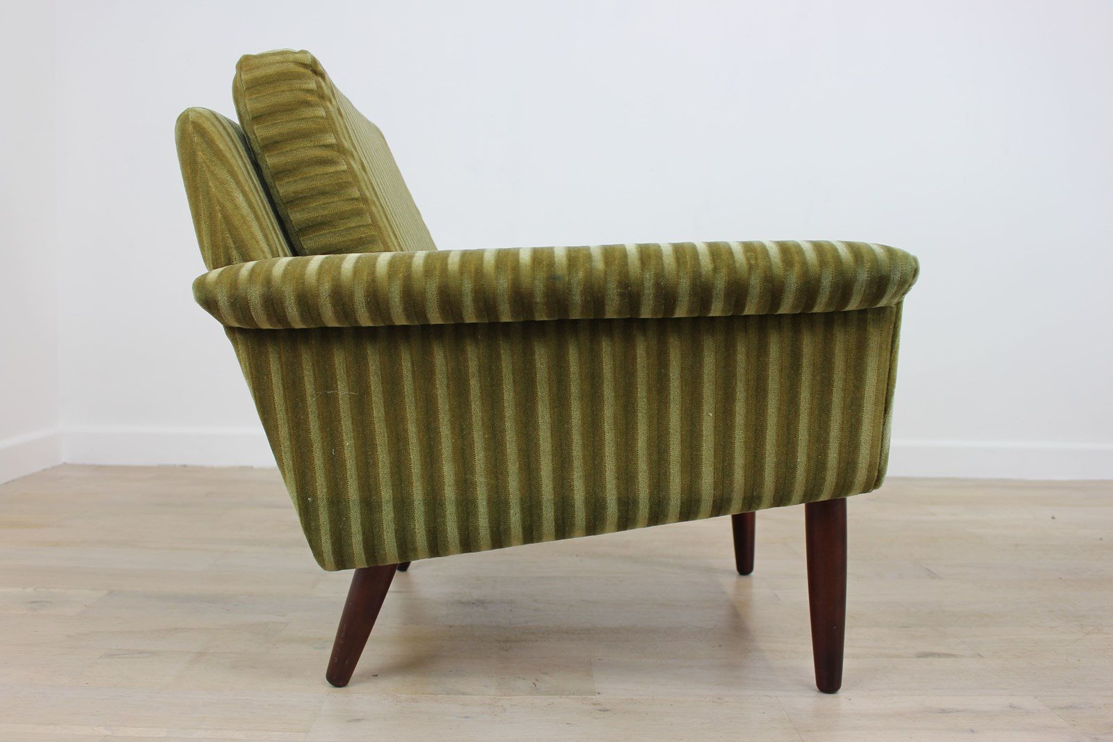 A lovely pair of Danish armchairs from the early 1960’s that are currently in their original upholstery. They need to be re-done to current UK Fire Regulation standards but this gives you the opportunity to have them redone in the colour and fabric of your choice. On original turned teak legs which as with so many Danish upholstery unscrew .