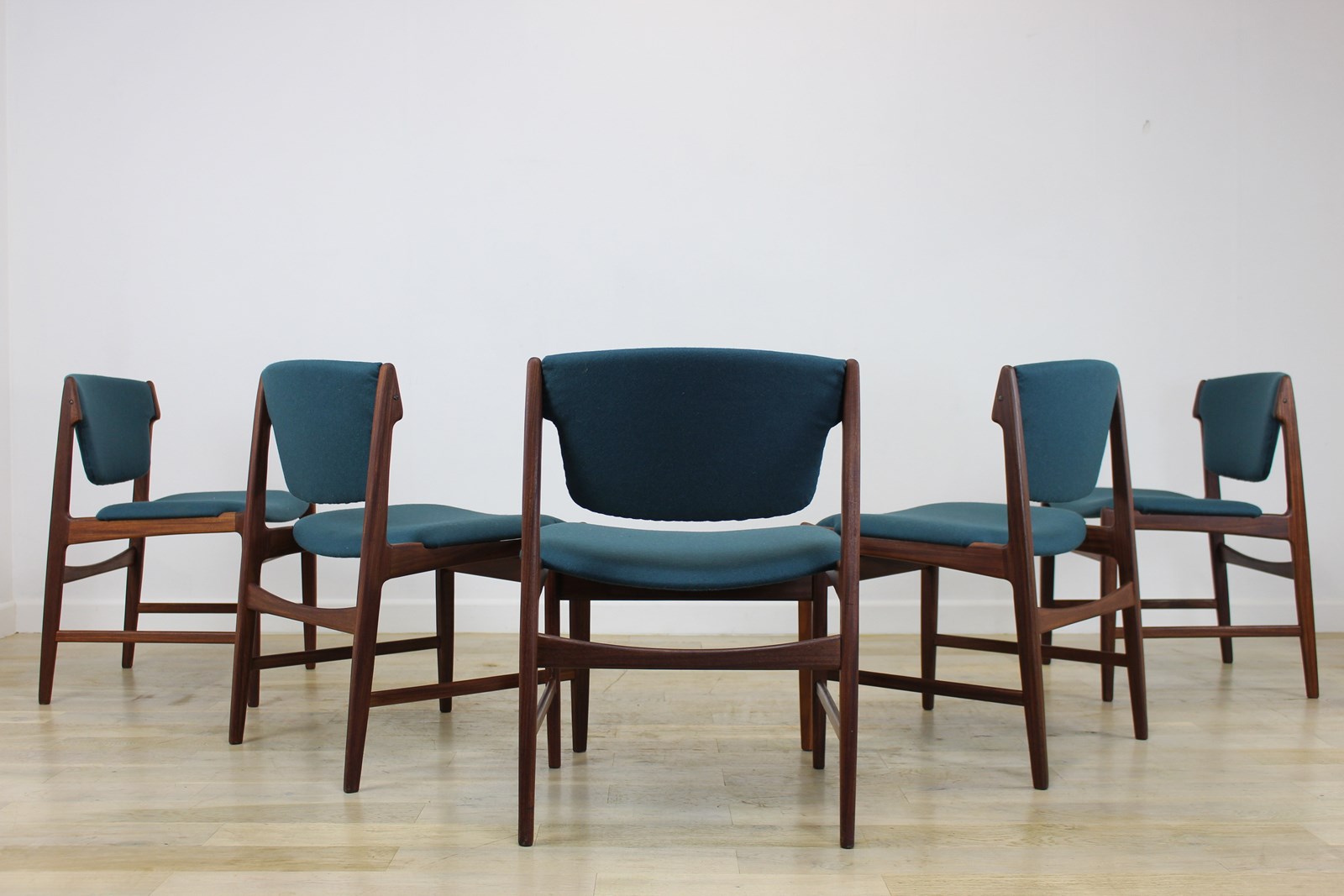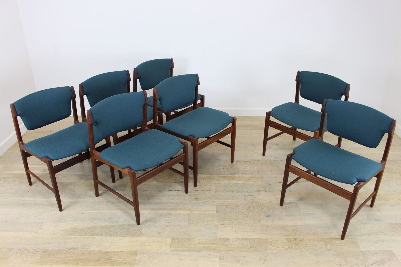 We actually have 7 of these plus 1 carver . We bought 2 sets of 4 from families of original owners who both bought them new in around 1963 . They were all upholstered in their original black vinyl which doesn’t meet current UK fire regulations so we’ve had them fully re-upholstered by our in-house upholsterer in a lovely petrol ( Blue/green ) felted wool .