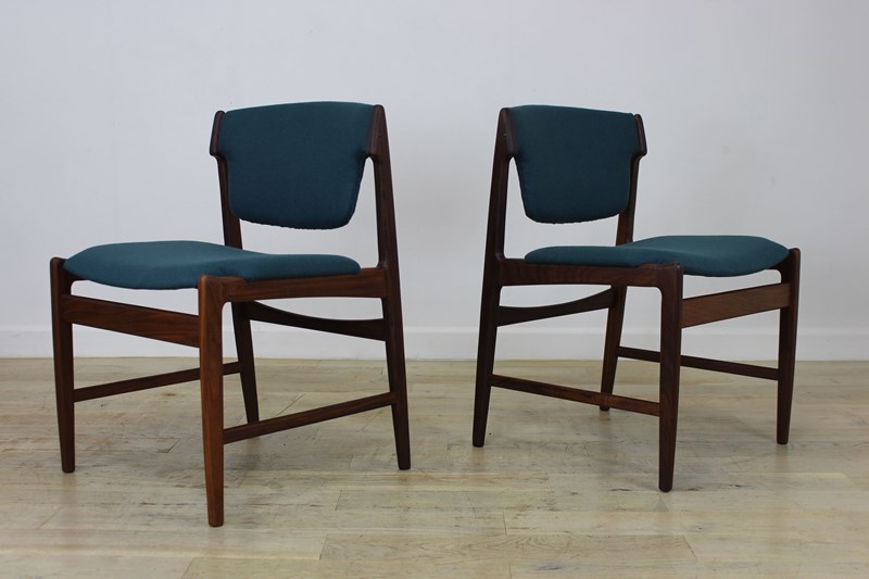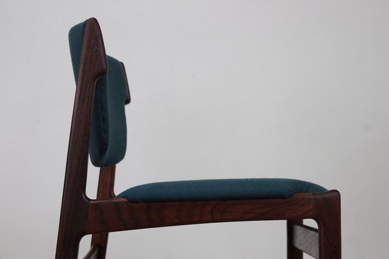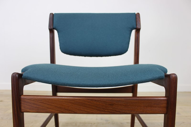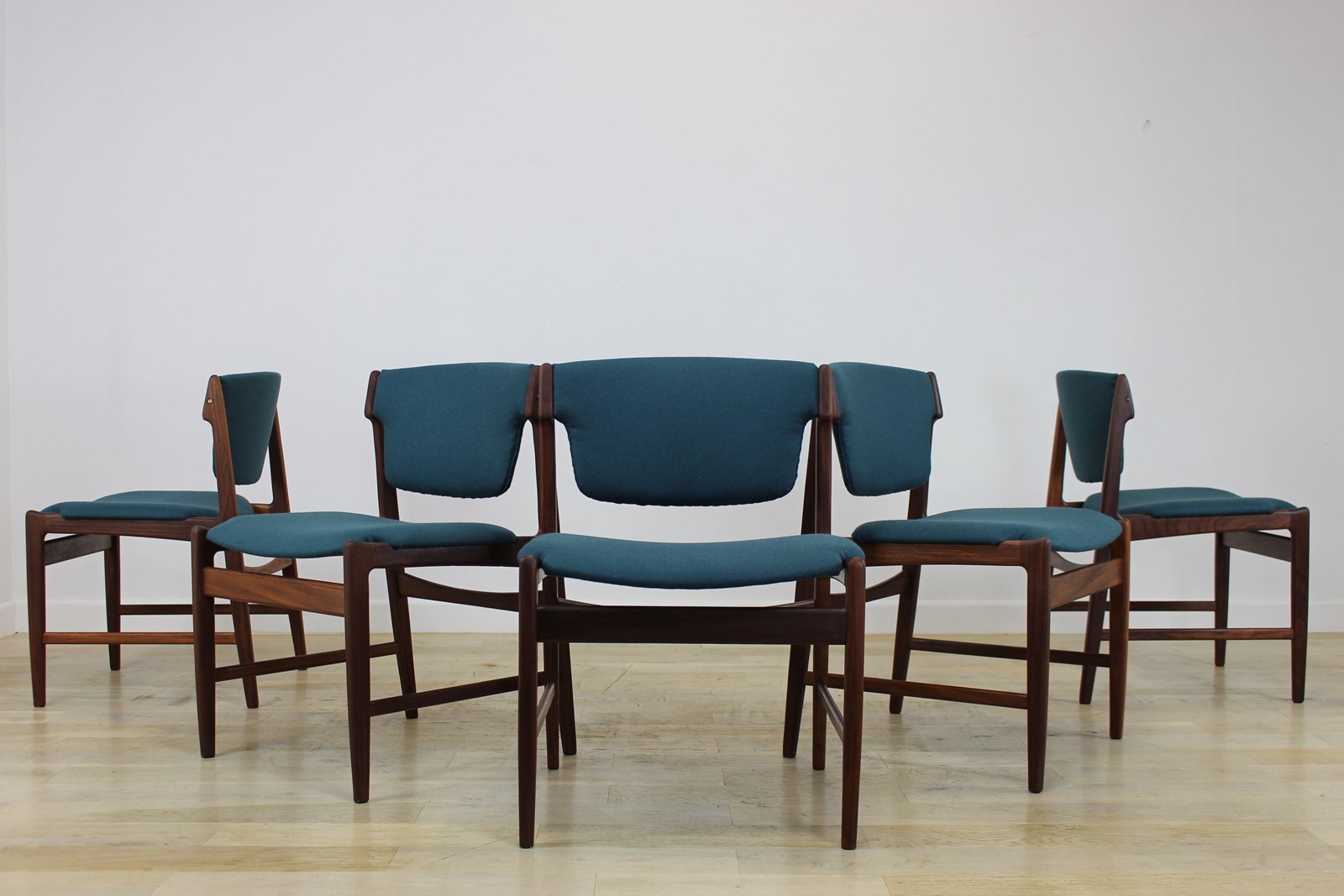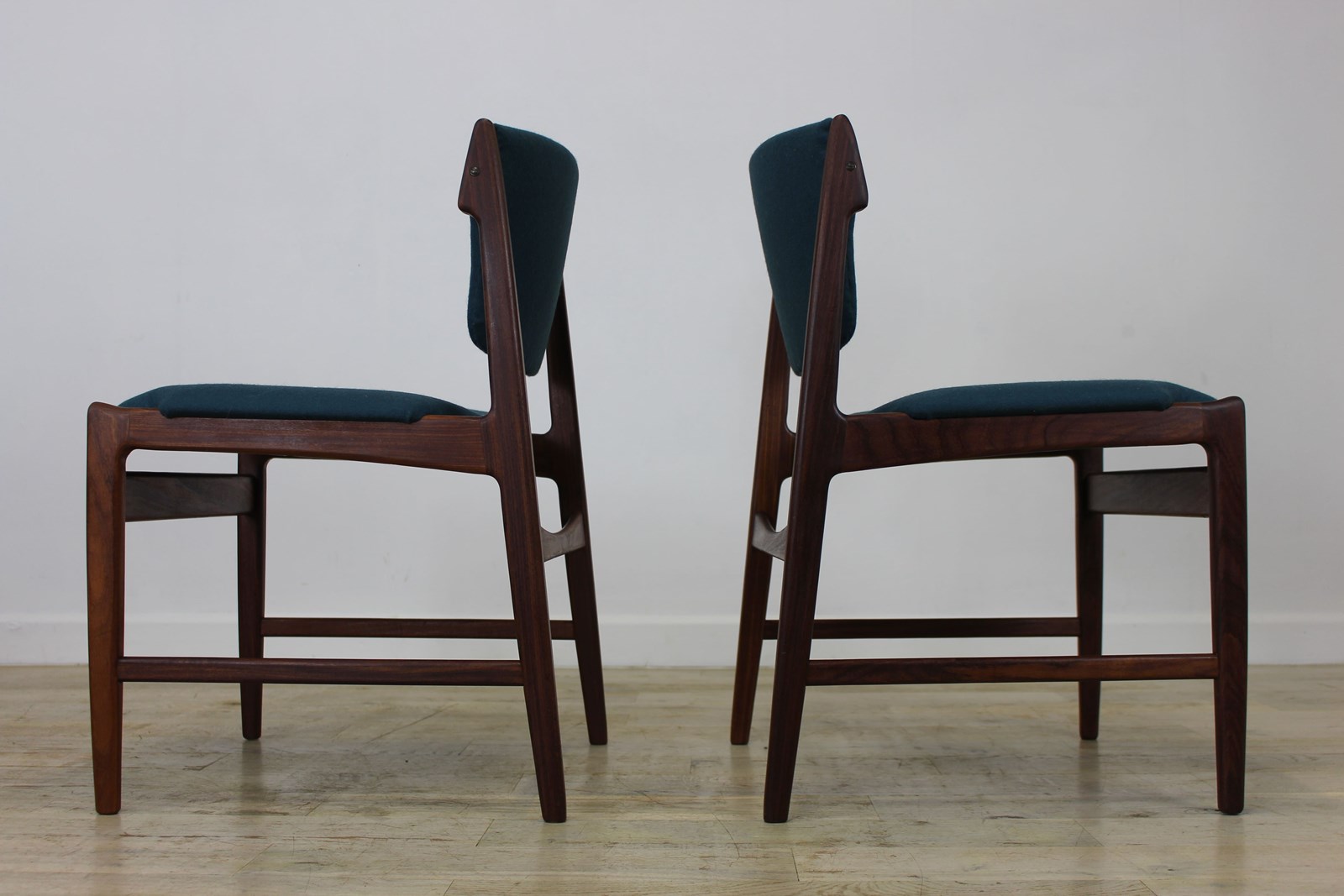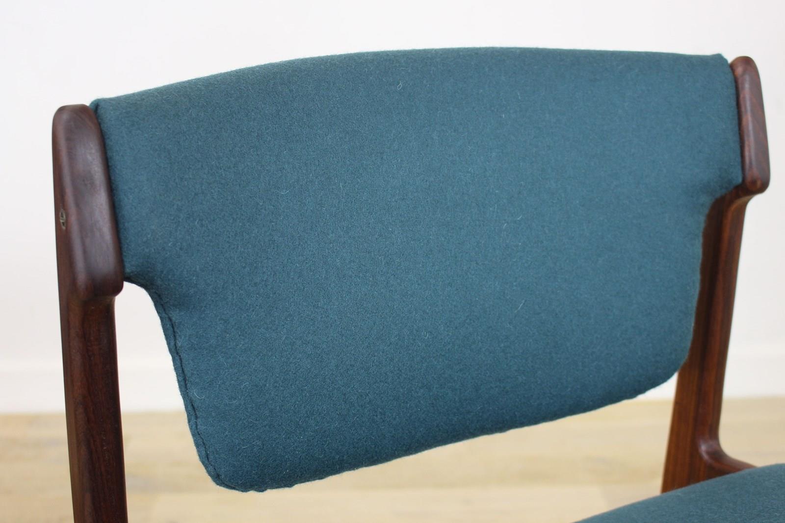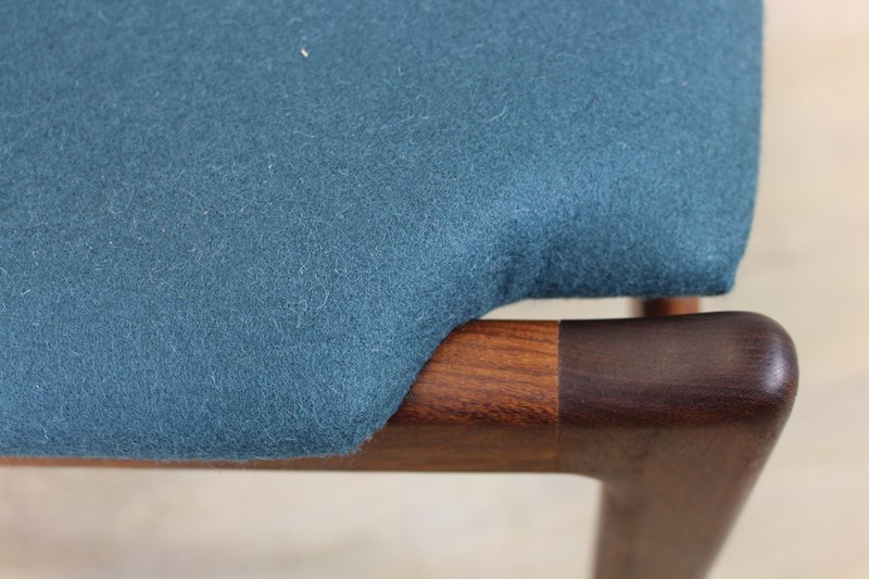 The teak frames have been fully cleaned and oiled . The seats and backs have been newly upholstered in a lovely petrol blue/green felted wool that we managed to source .