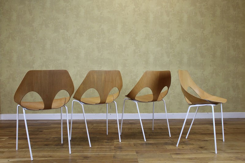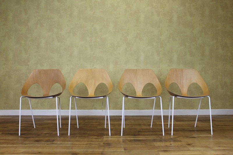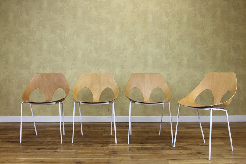 This iconic design from 1953 initially only came with wooden legs , but they soon started making them with the option of metal legs. We bought this set from the family of the original ( spinster ) owner who at some stage had them badly painted in white. We’ve had them stripped and taken back to the original beech laminate. The metal frames have been professionally sandblasted and re-sprayed.