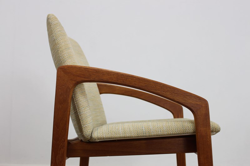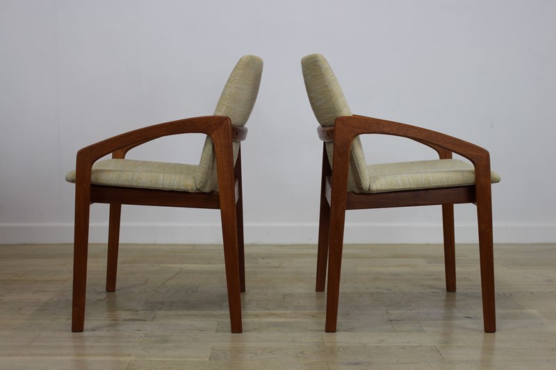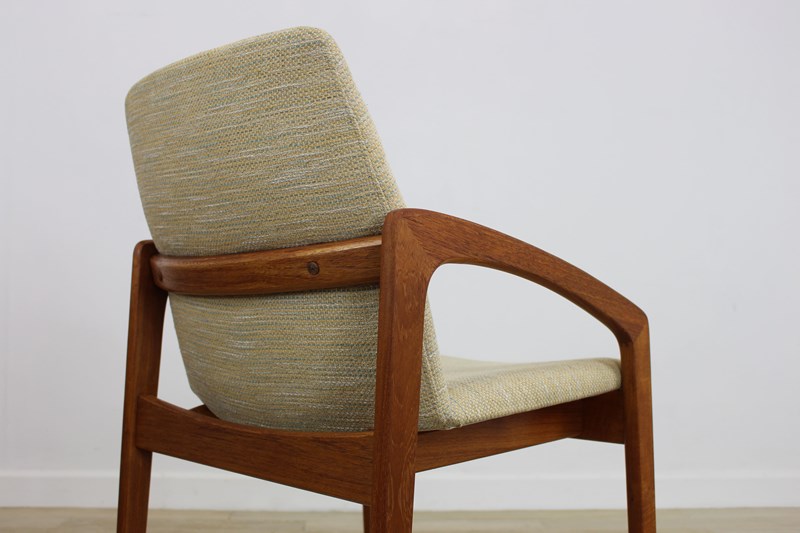 We’ve sold 4 or 5 sets of these lovely chairs in the last few years . A lovely simple design by a good Danish maker they’re very comfortable and have nice generous seats . Henning Kjernulf was a very successful prolific Danish designer who is best known today for his hunting chairs , but was also responsible for a good number of other designs .