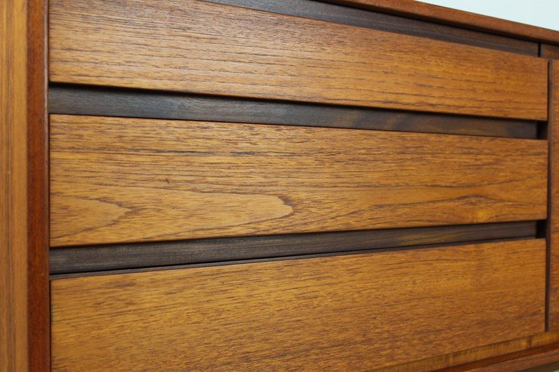 We have the original catalogue from c 1970 where it was described as ” in teak finish , clean and finely proportioned with extensive use of solid teak ”. It was designed in the mid 1960s, and was made into the early 1970s. It has it’s original lift-out melamine small drinks tray.
