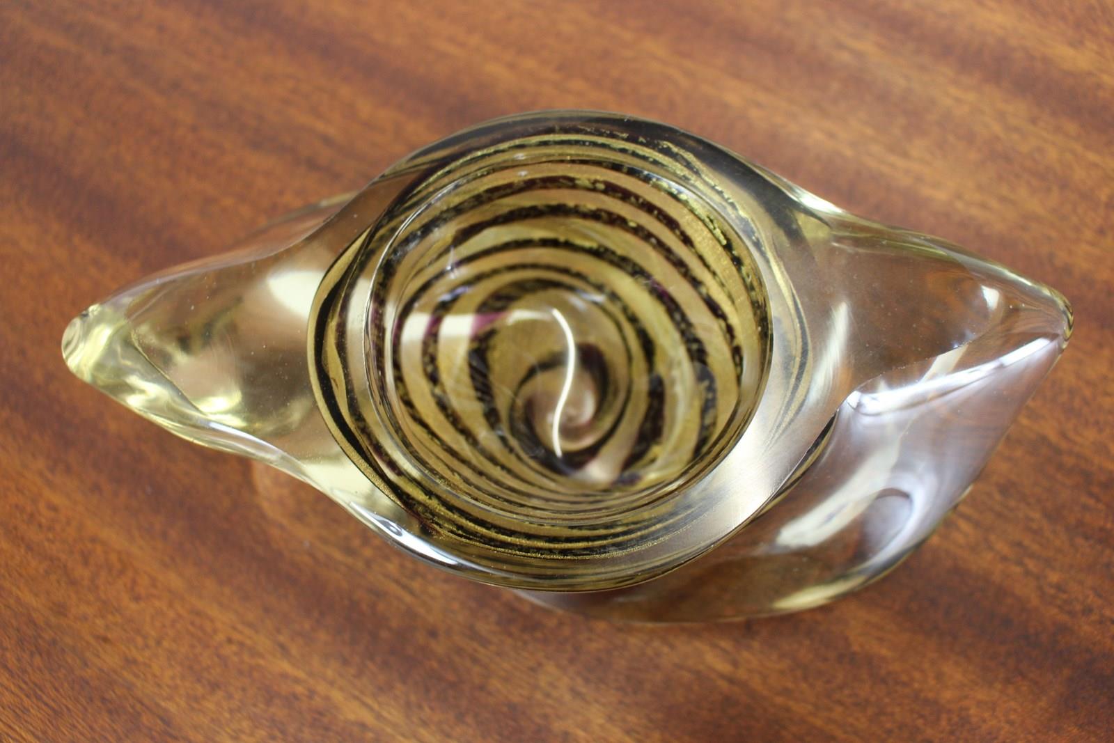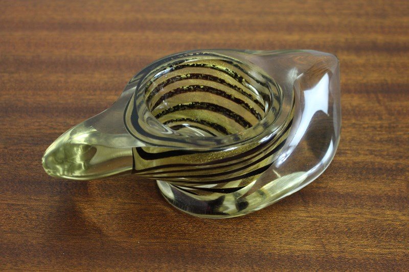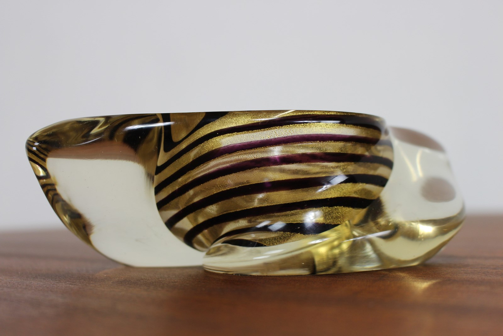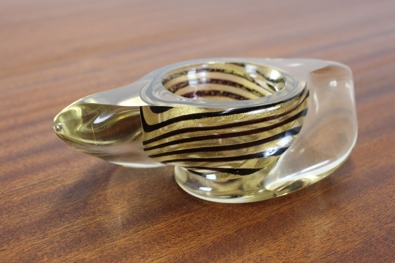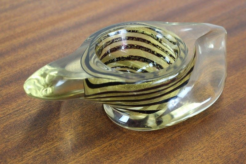 Zebrati glass is named after the striped animal with gold leaf and dark purple bands of colour cased in heavy clear glass. The base is polished as you’d expect. If you look online you should find other pieces from this rarely seen range with original Barovier and Toso label, but none seemed to have been signed.