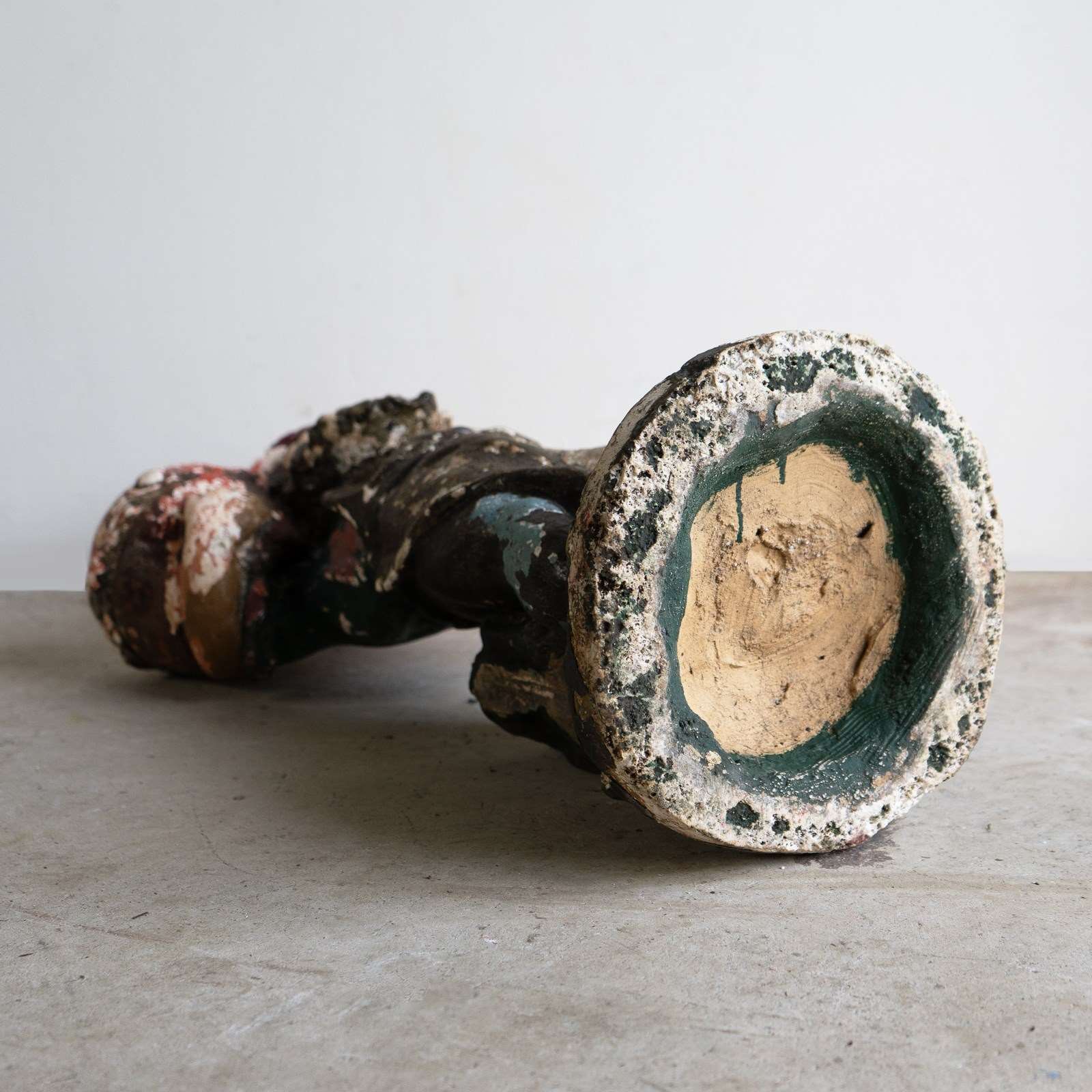 Looking under the base, it appears to be made from terracotta with some form of plaster layer and then hand-painted with polychrome decoration.