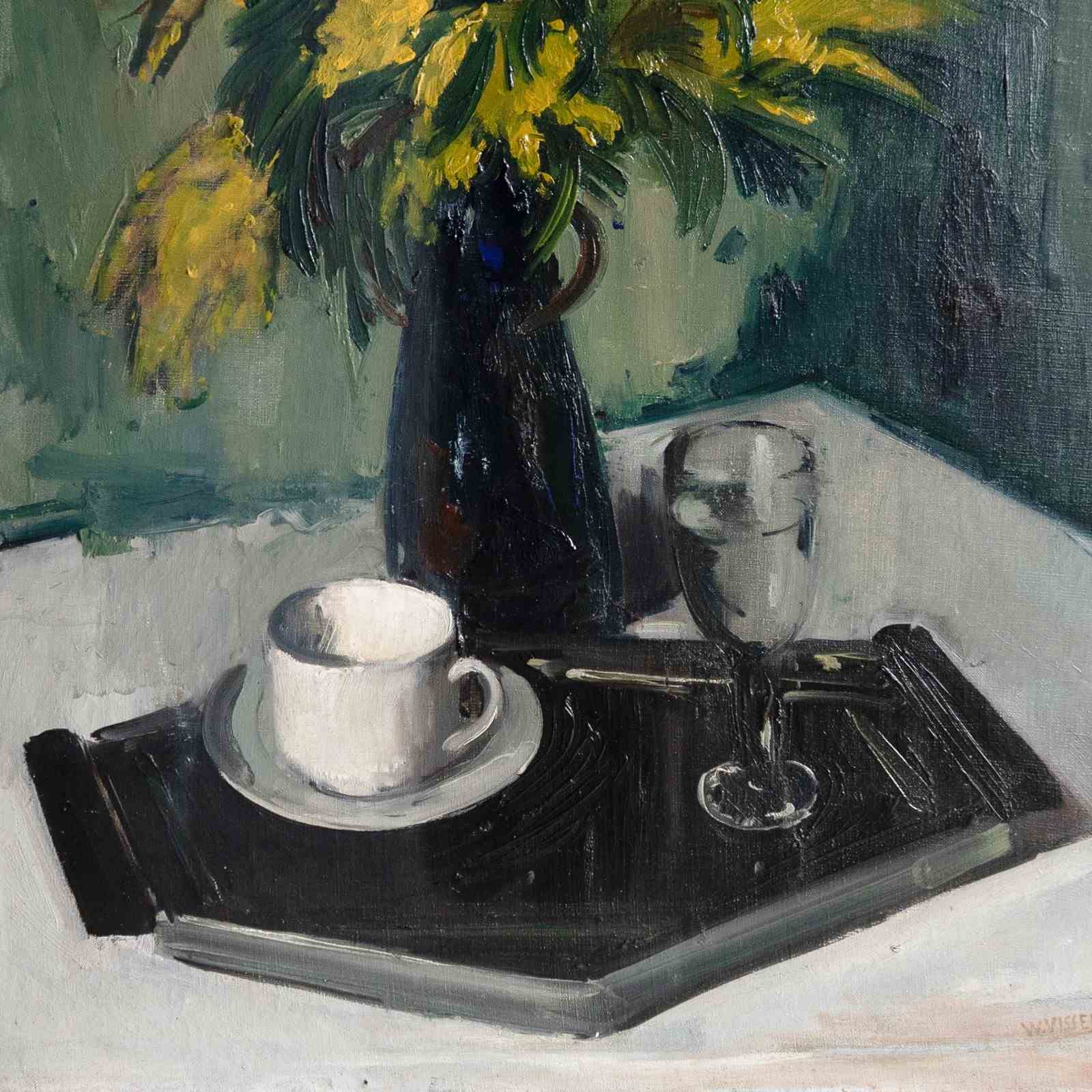 A stylish scene, a simple white porcelain coffee cup, saucer and a glass goblet of water sit on a hexagonal ebonised tray. A large spray of yellow flowers is displayed in a cobalt blue glass vase on a light grey table, with a teal coloured background. There is a distinct Art Deco feel to the scene. If I had to guess, the setting would be an upmarket hotel or chic interior