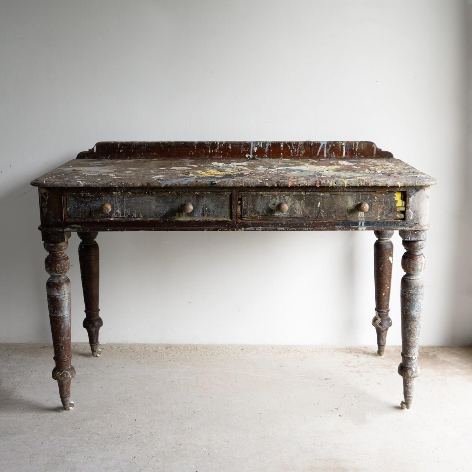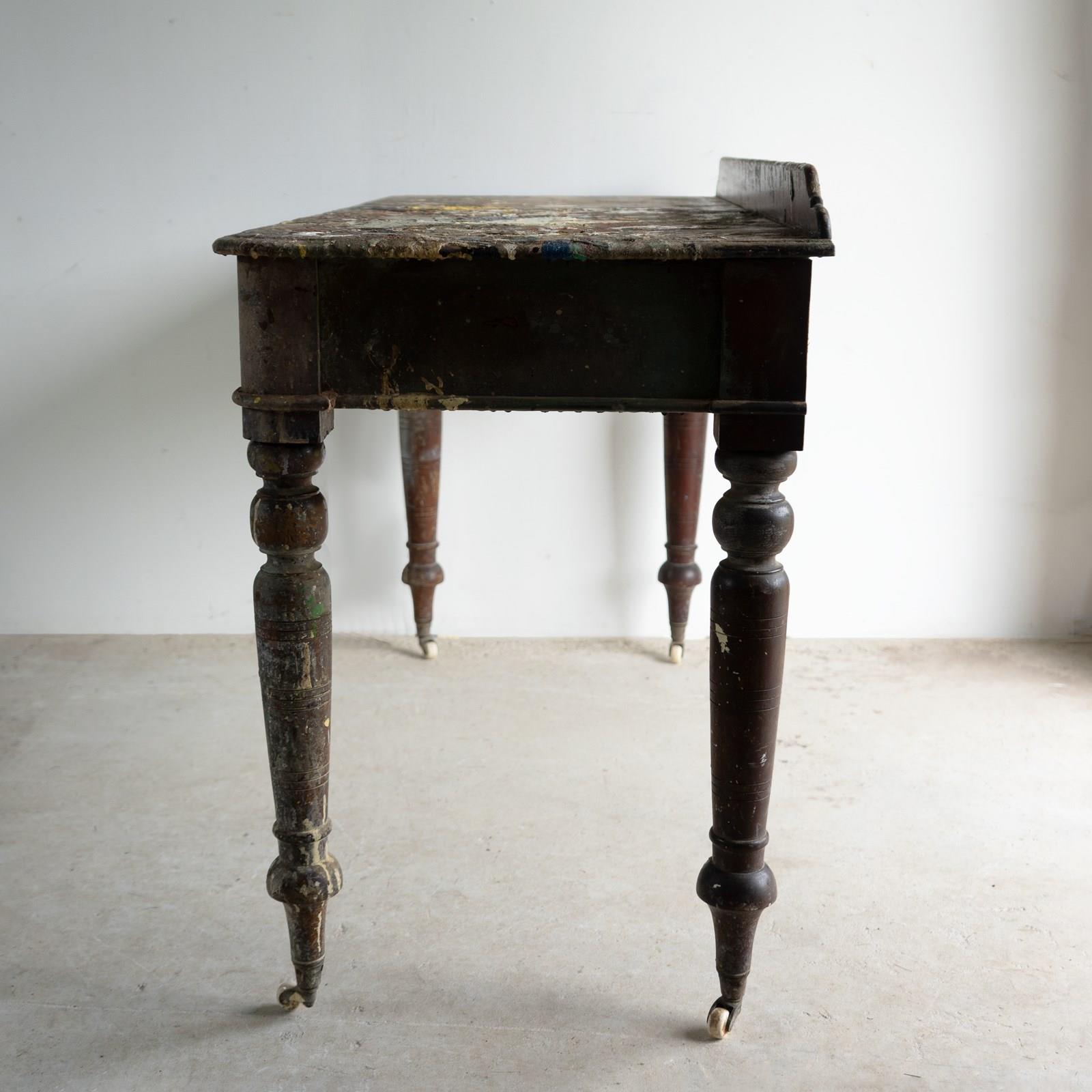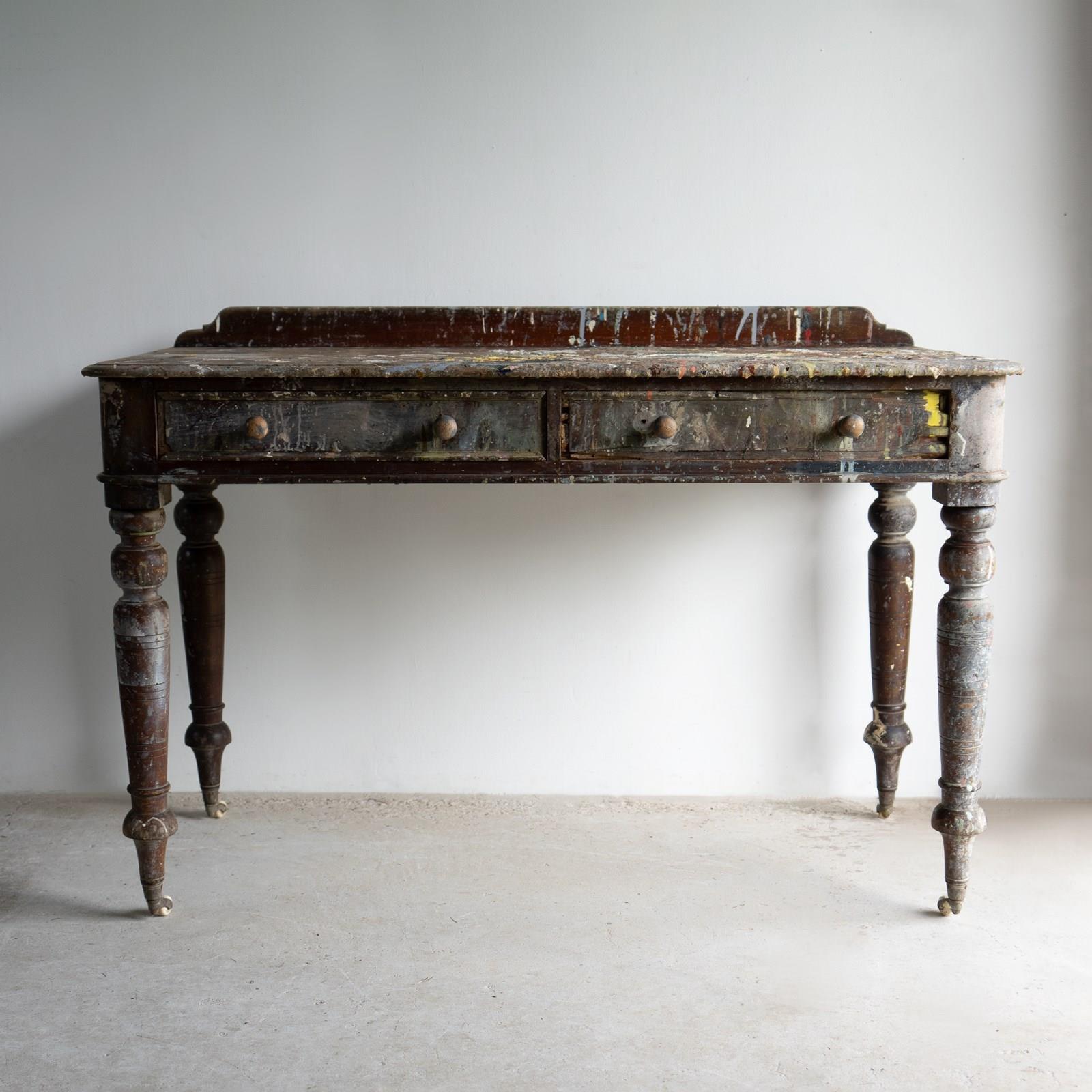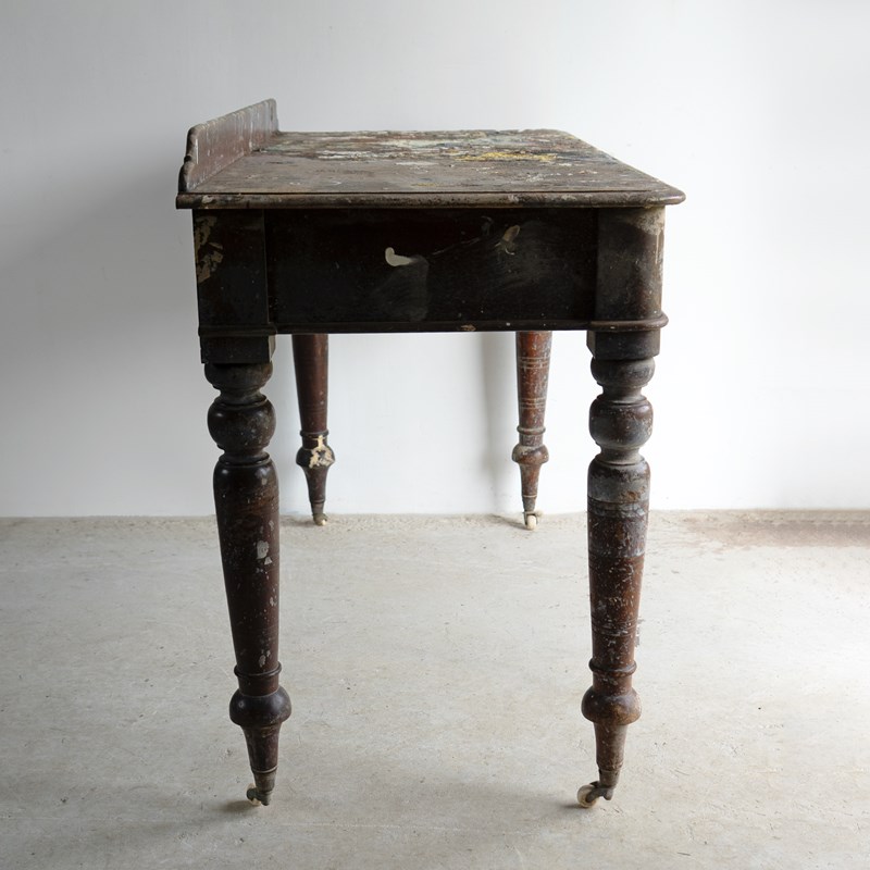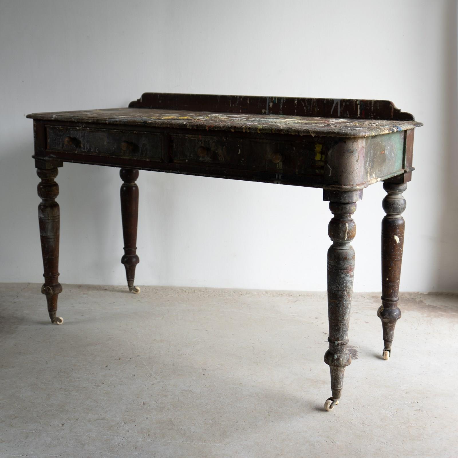A good quality Victorian writing table/desk which has been used in an artist’s studio for many years, with a natural build-up of layers of paint.