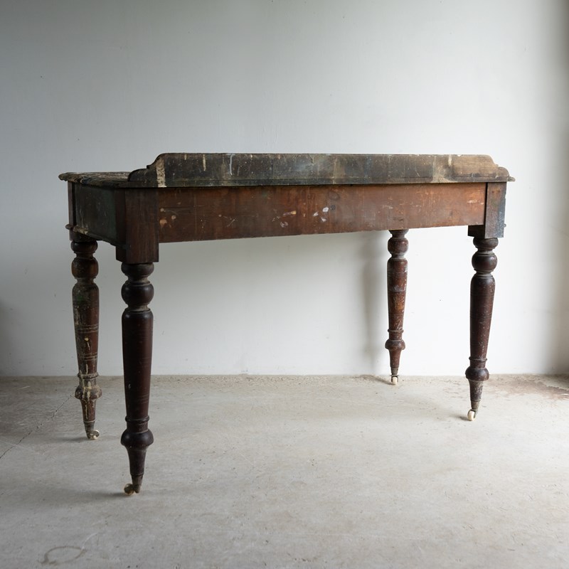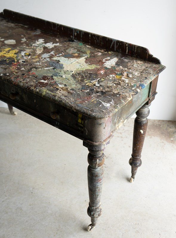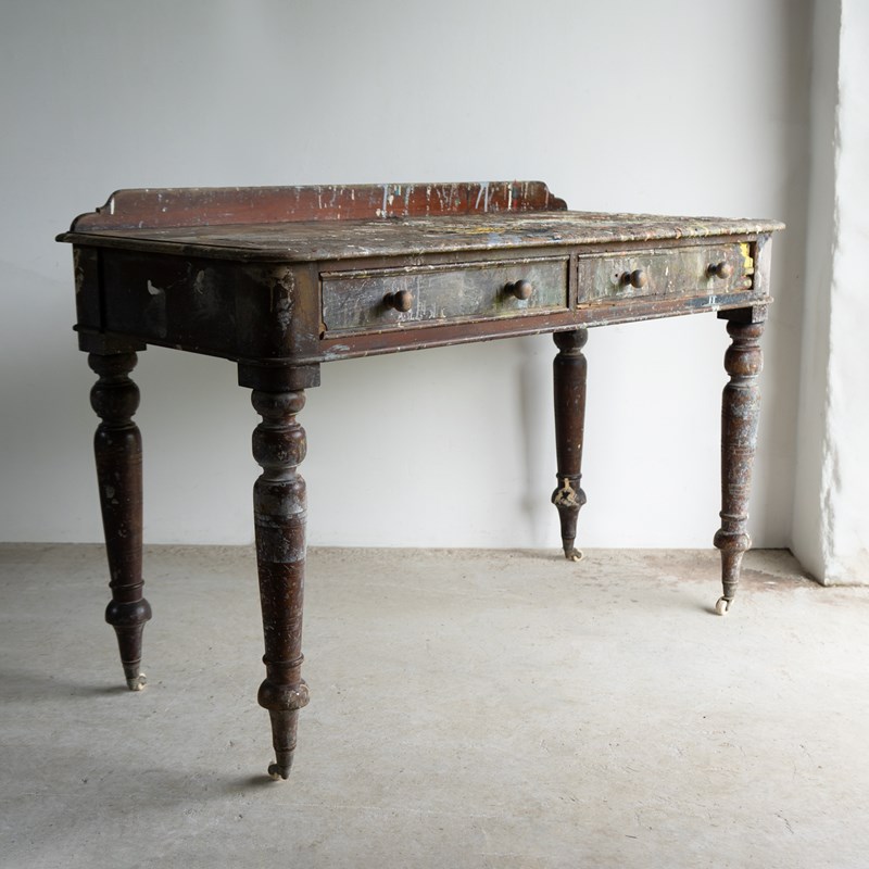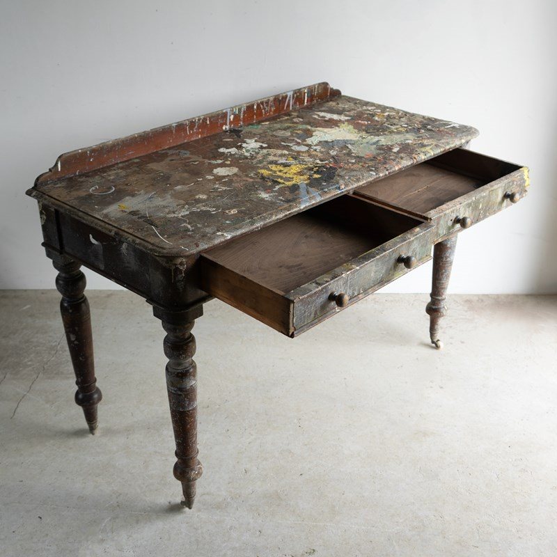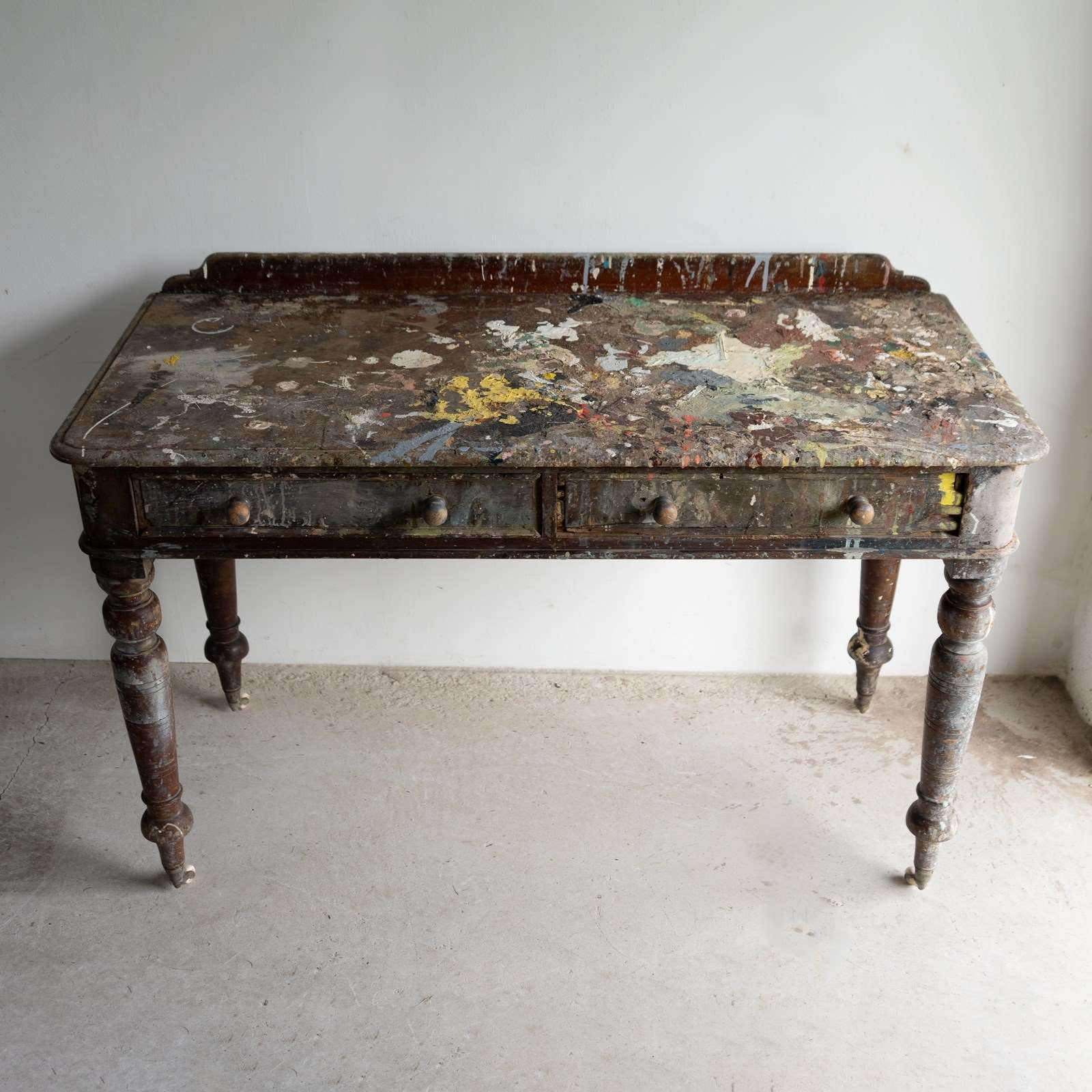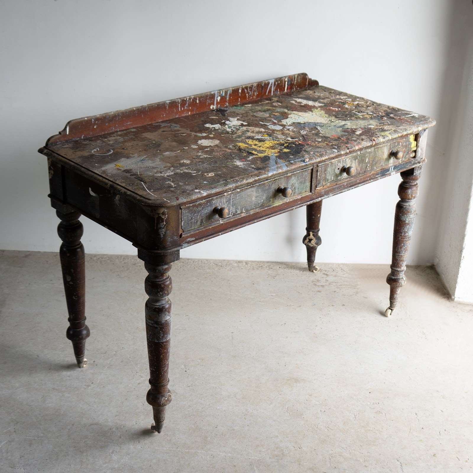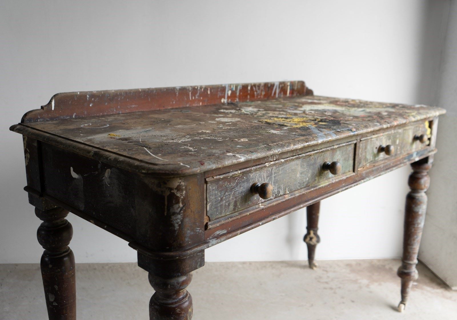 A good quality Victorian writing table/desk which has been used in an artist’s studio for many years, with a natural build-up of layers of paint.