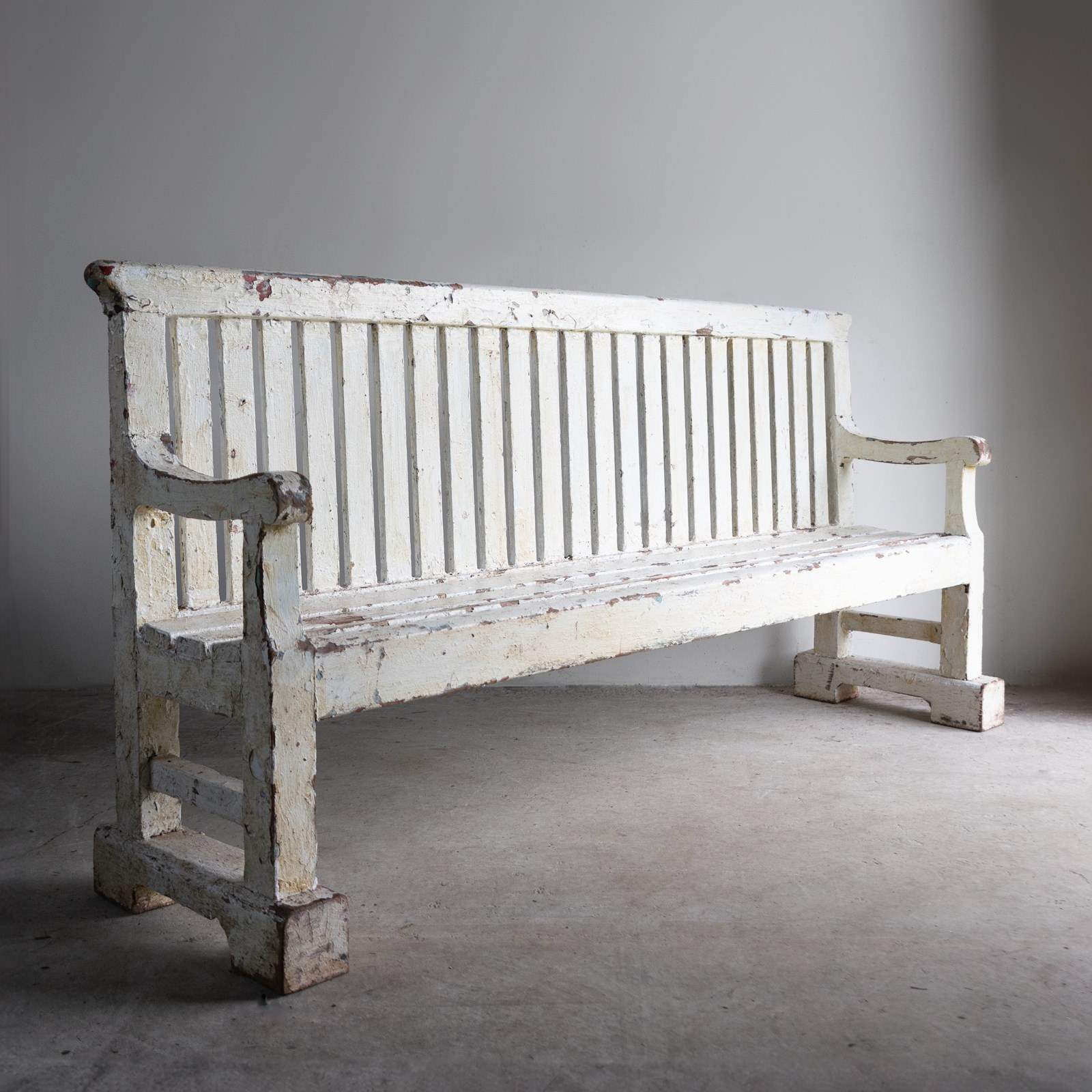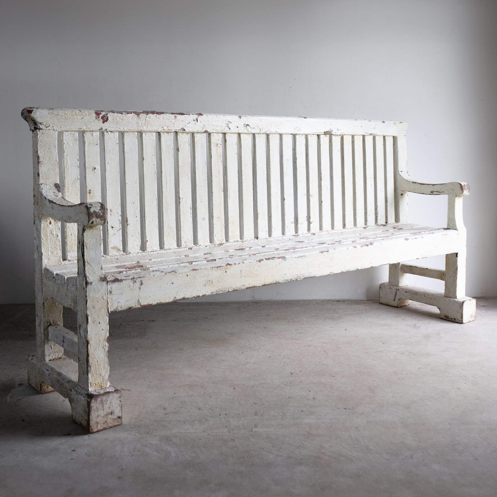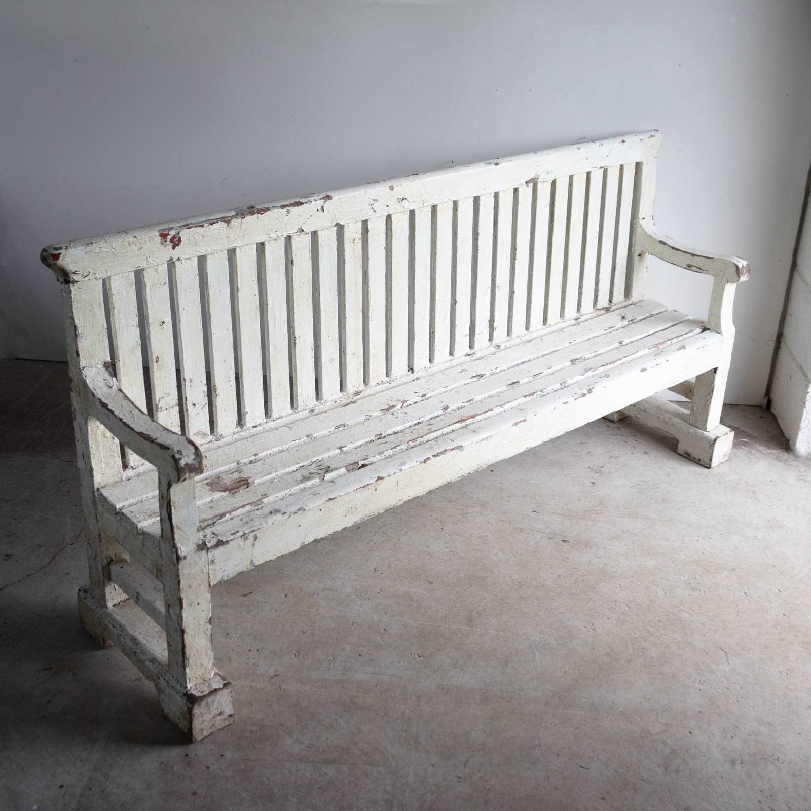 Overall, the bench is in good, solid vintage condition, and all the joints seem secure. There is wear commensurate with age throughout. The multiple layers of paint are naturally worn in places. We believe the blocks underneath the legs to be later additions.