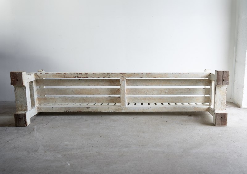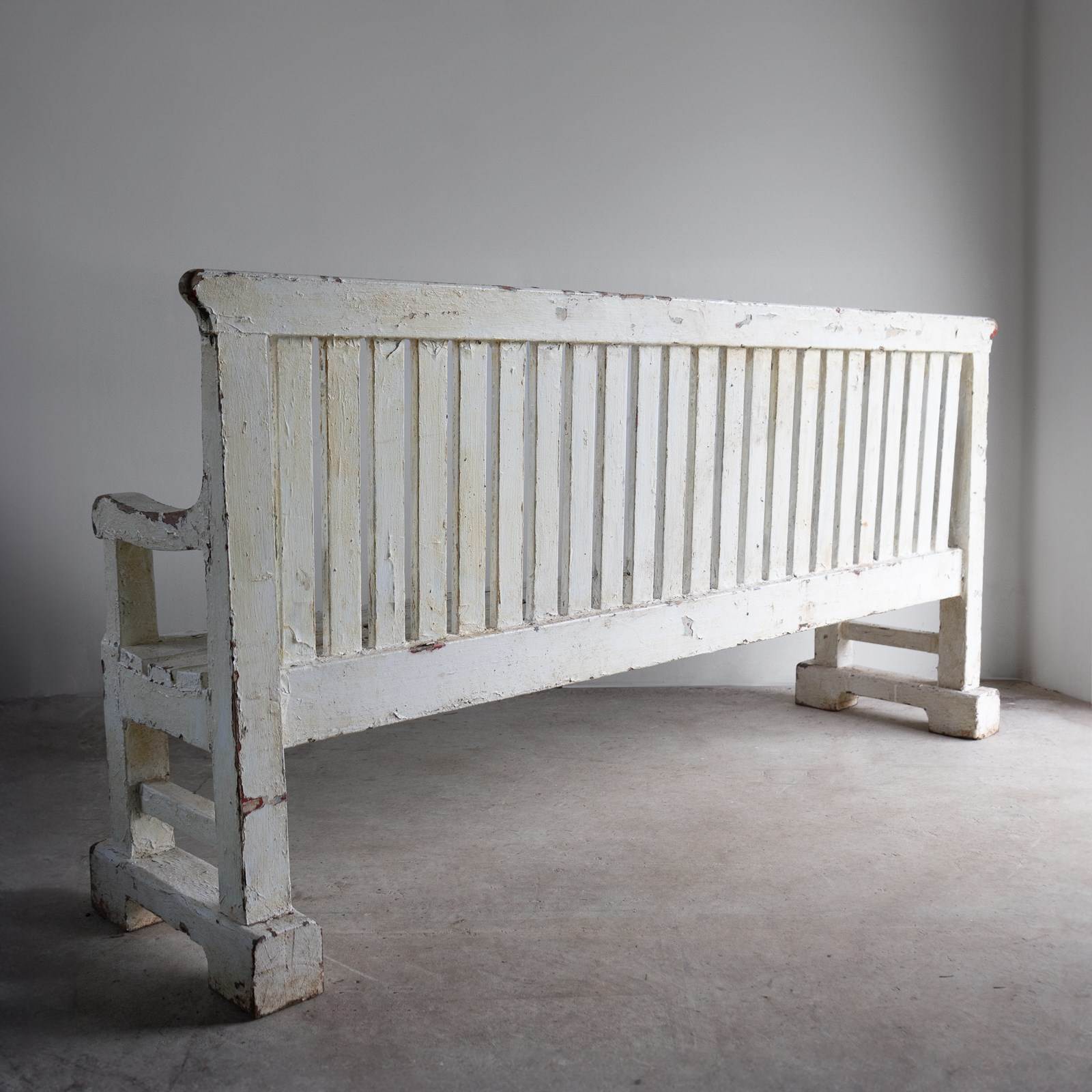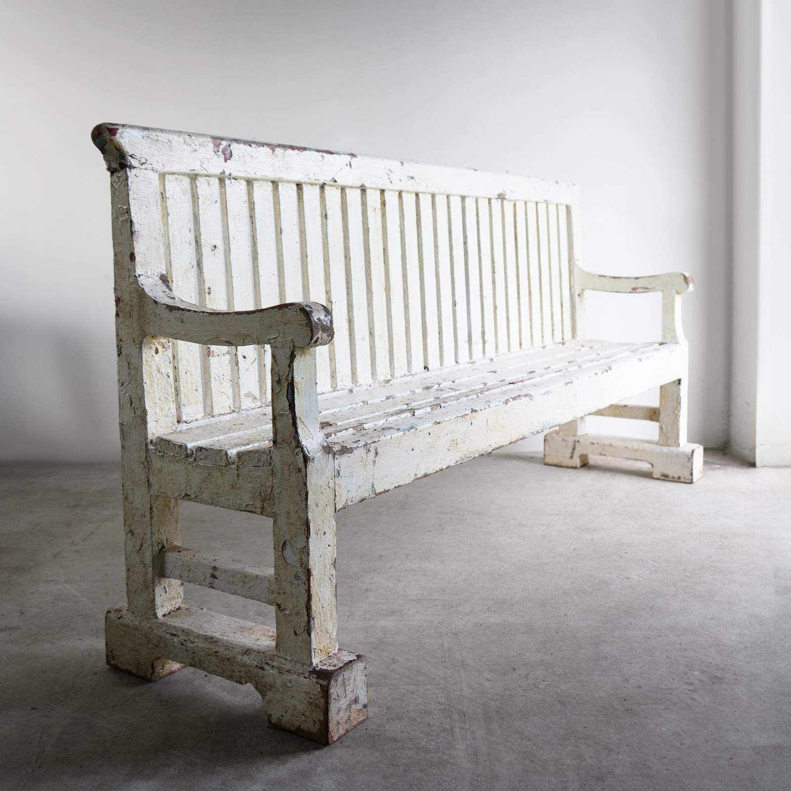 Overall, the bench is in good, solid vintage condition, and all the joints seem secure. There is wear commensurate with age throughout. The multiple layers of paint are naturally worn in places. We believe the blocks underneath the legs to be later additions.