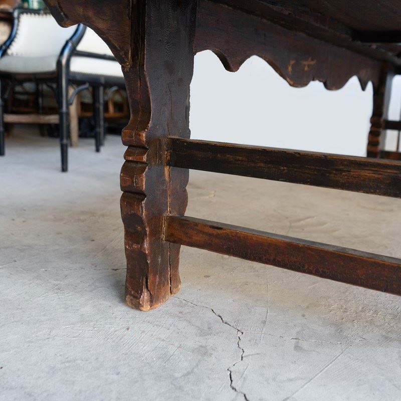 It is in good vintage condition with wear commensurate with age. The table feels sturdy and solid. The timber has been naturally worn over the years form use including some splits, repairs, some minor losses and there is an overall worn rustic feel to the piece.