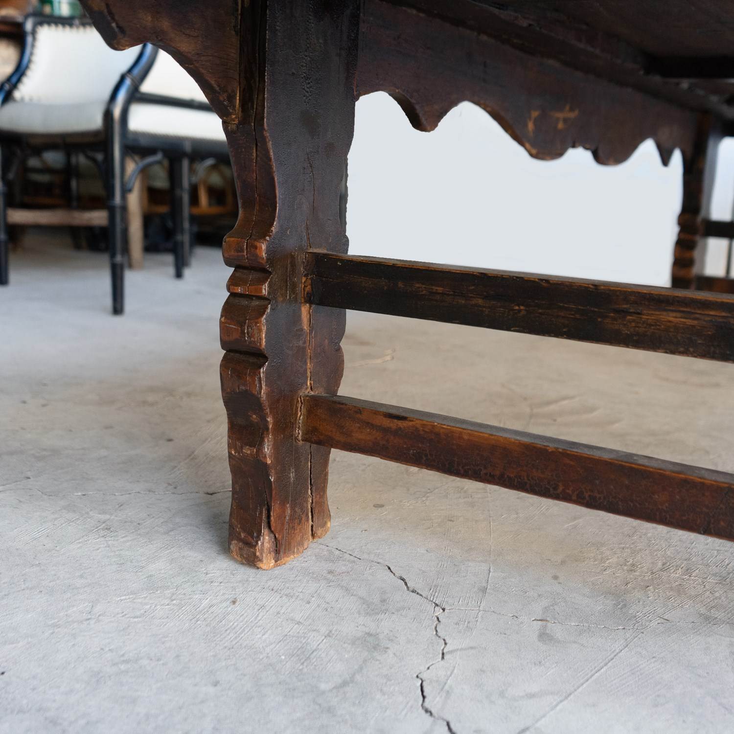 Constructed from Elm with an ornately carved apron on each side and 'sword' legs supported by double stretchers.
