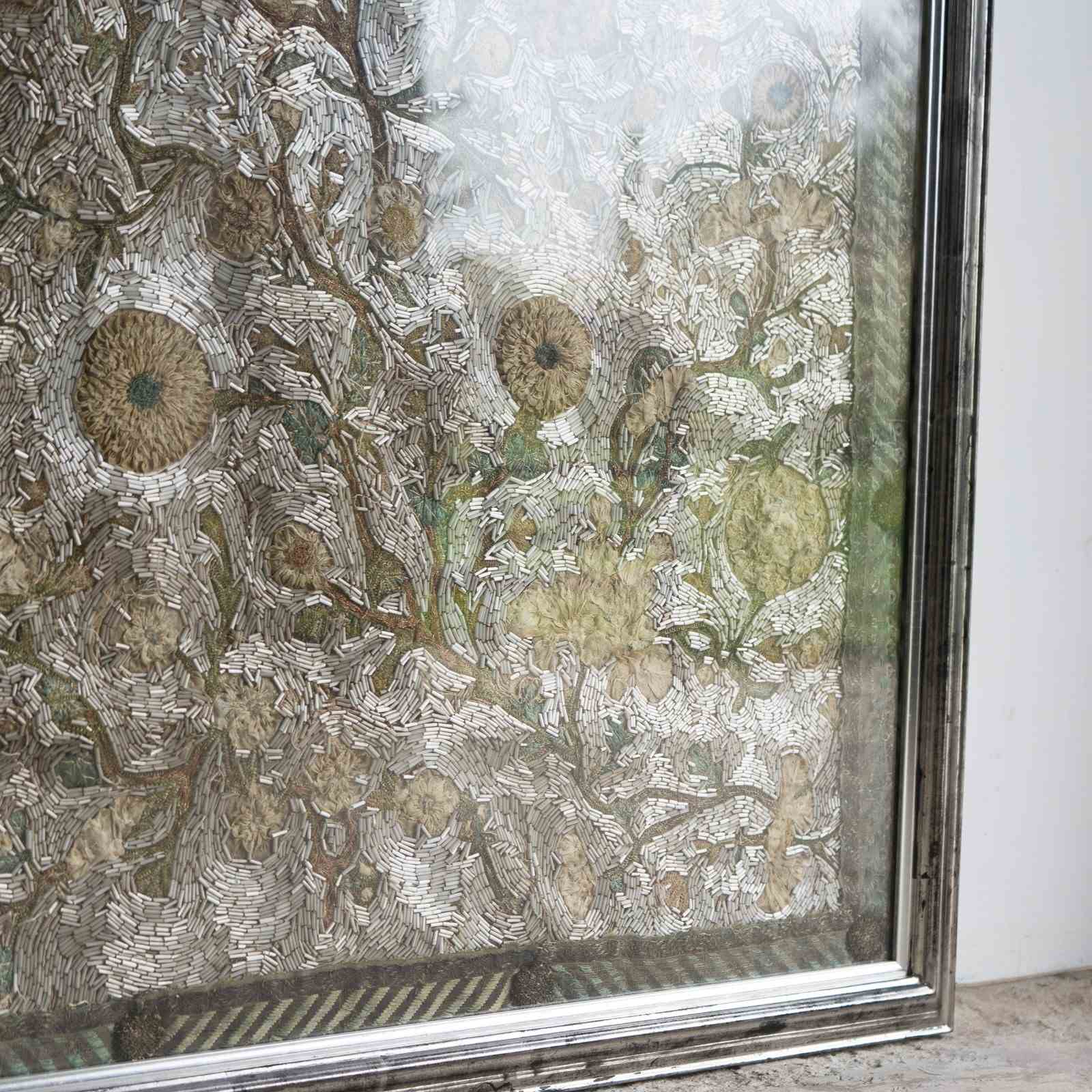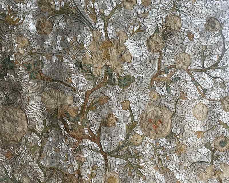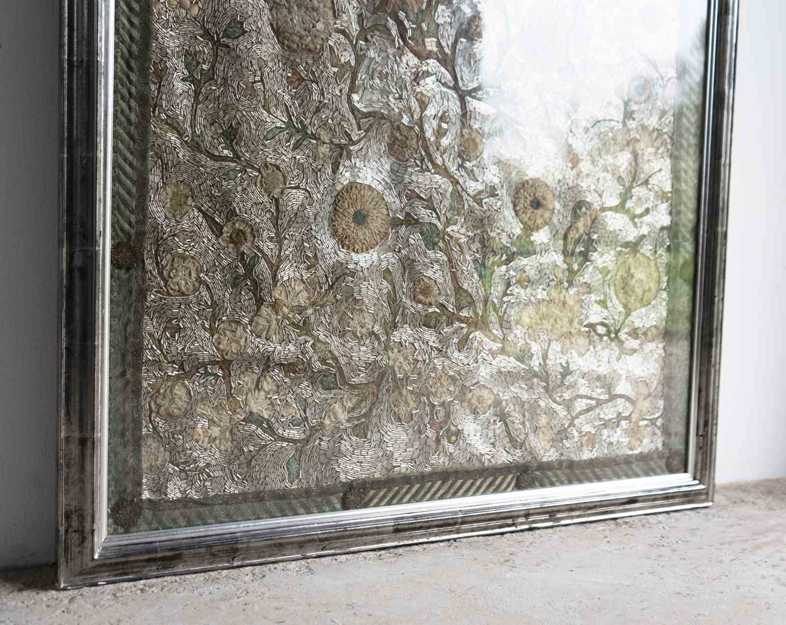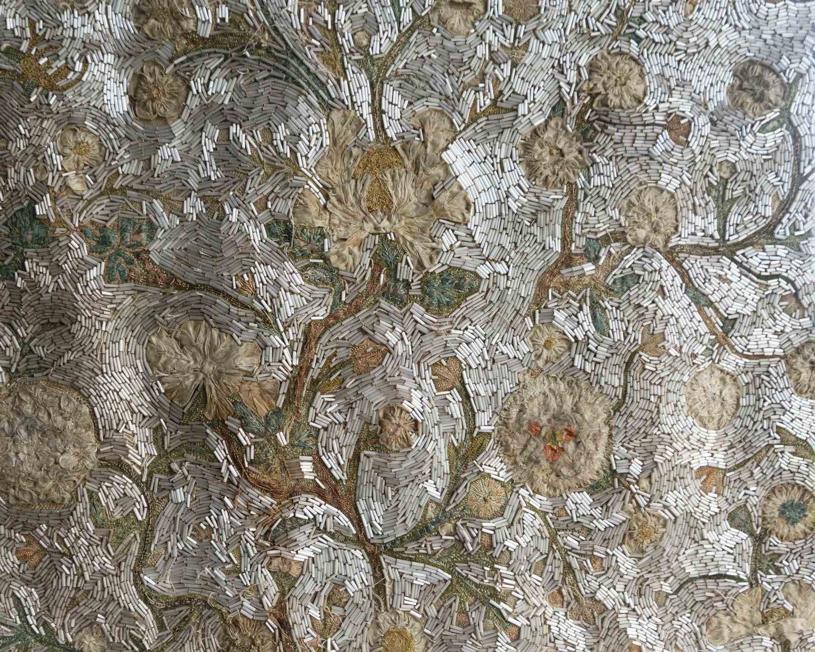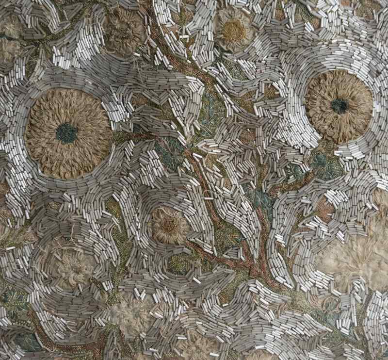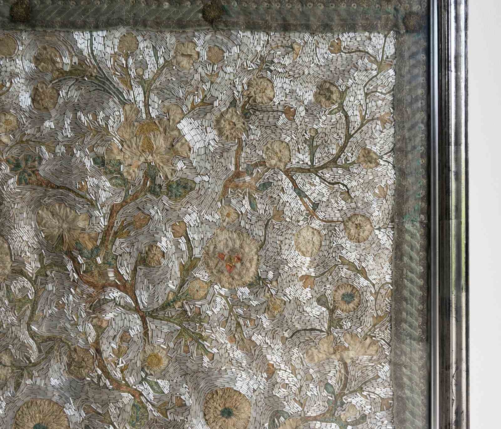 A hugely decorative piece depicting branches of a tree with different types of flowers and foliage. There is a somewhat timeless, almost abstract feel to the piece, and on close inspection, you can see the sheer amount of work it must have taken to complete, with many different techniques and materials used for each individual section. including raised stumpwork flowers, wirework, applied beadwork, as well as traditional embroidery techniques.