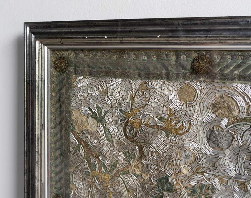 Overall, the panel is in good vintage order. The majority of the beadwork survives well with minor losses and wear commensurate with age. Some of the natural dyes on the flowers have faded somewhat, as you would expect from a piece of this period. Overall, it is our opinion that this adds to its overall decorative appeal. The frame is also in good vintage condition with only minor wear commensurate with age.