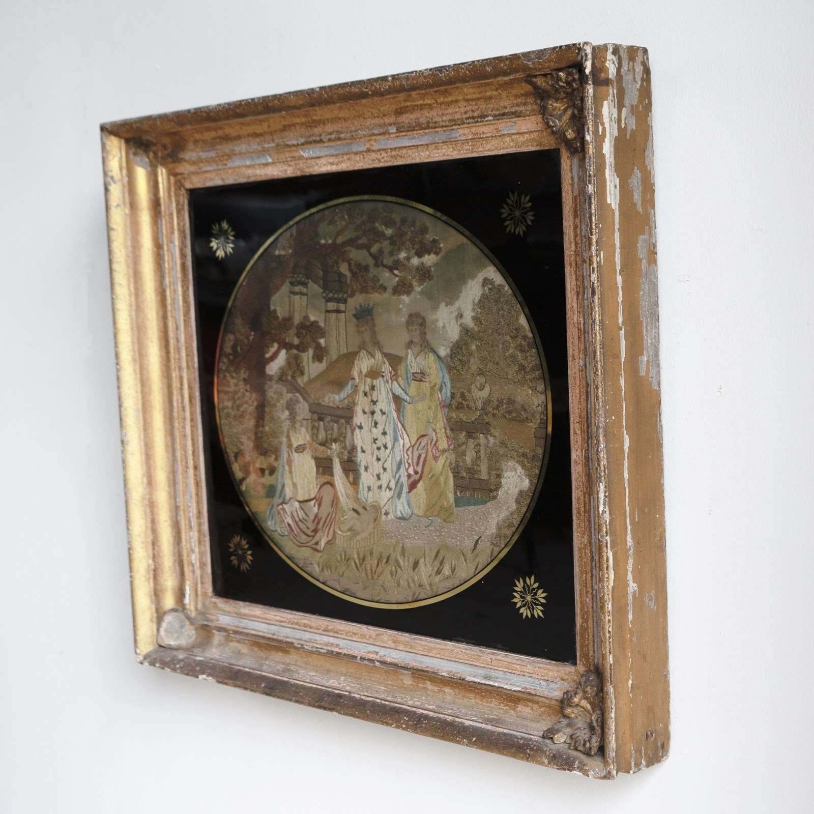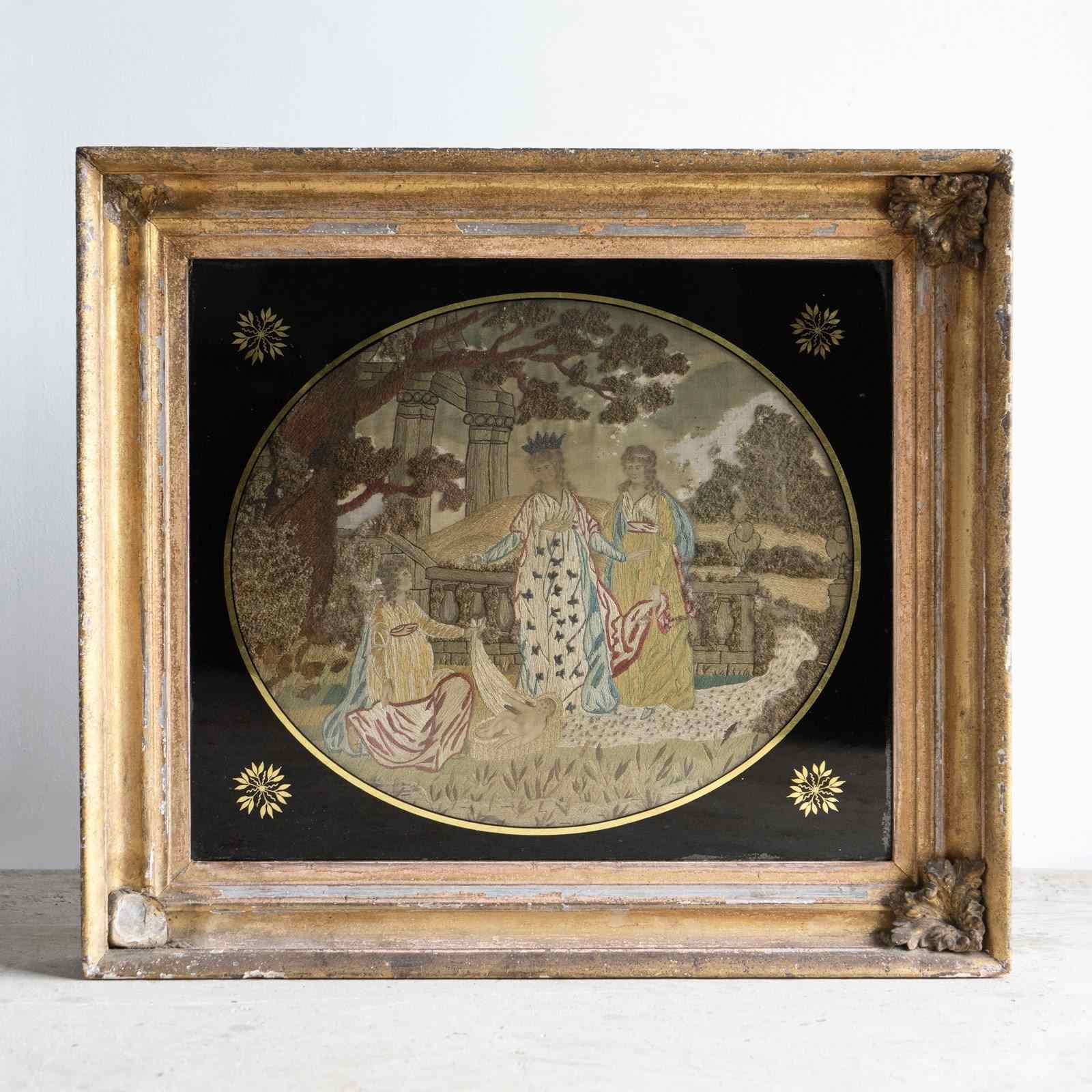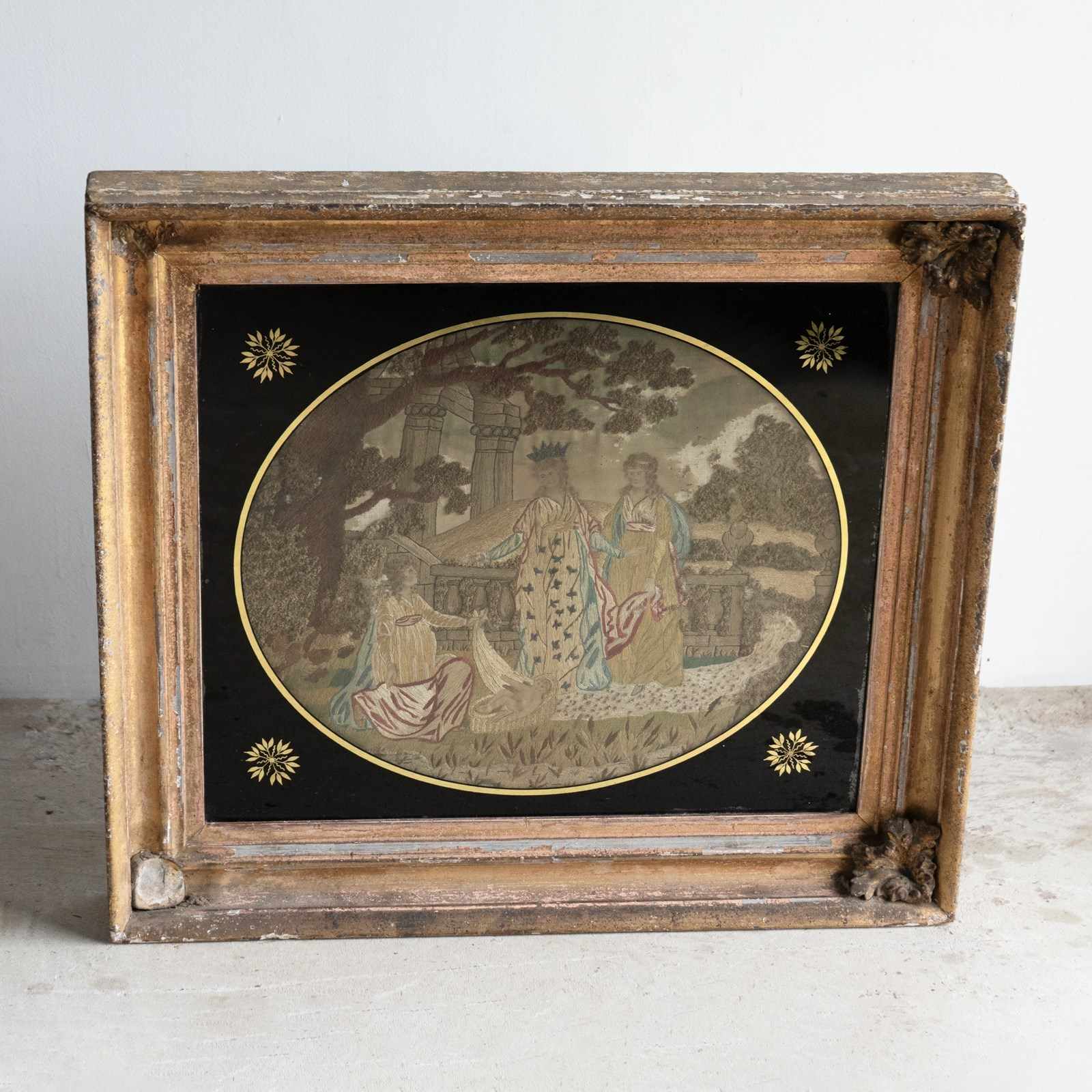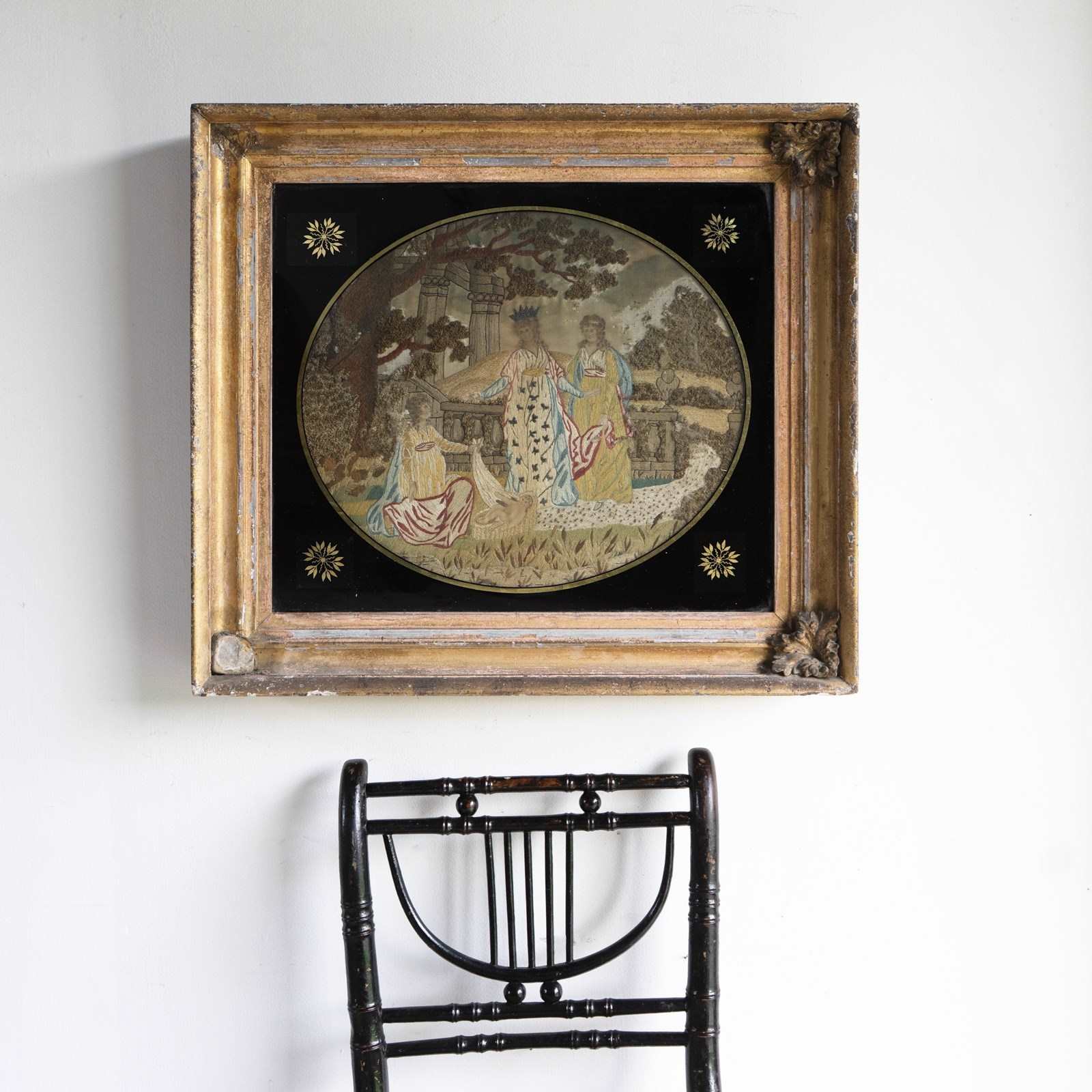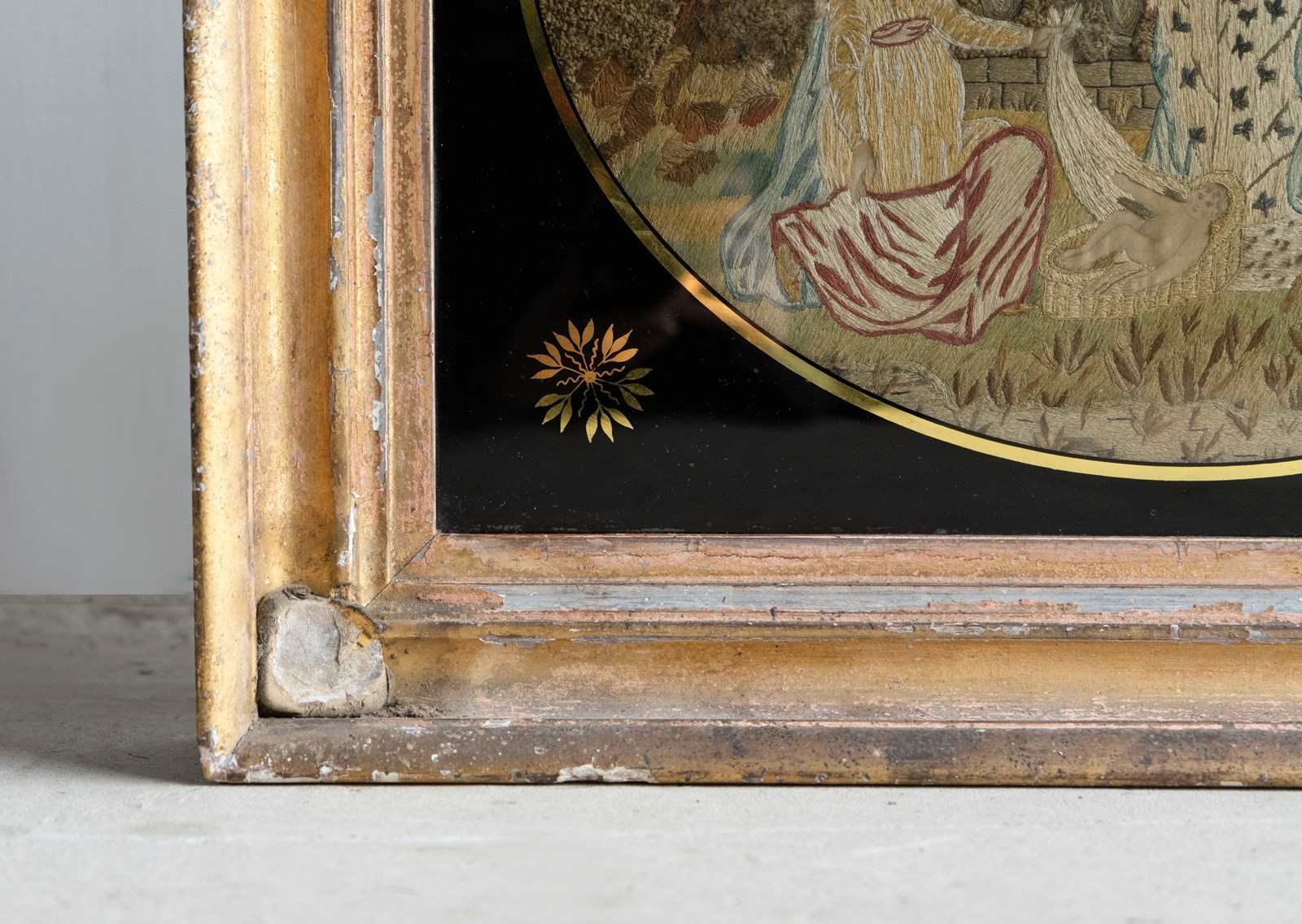 Antique Georgian Silkwork Embroidery, Moses In The Bullrushes, Verre Eglomise