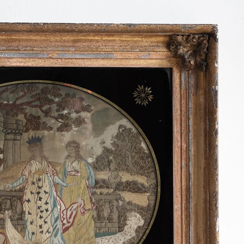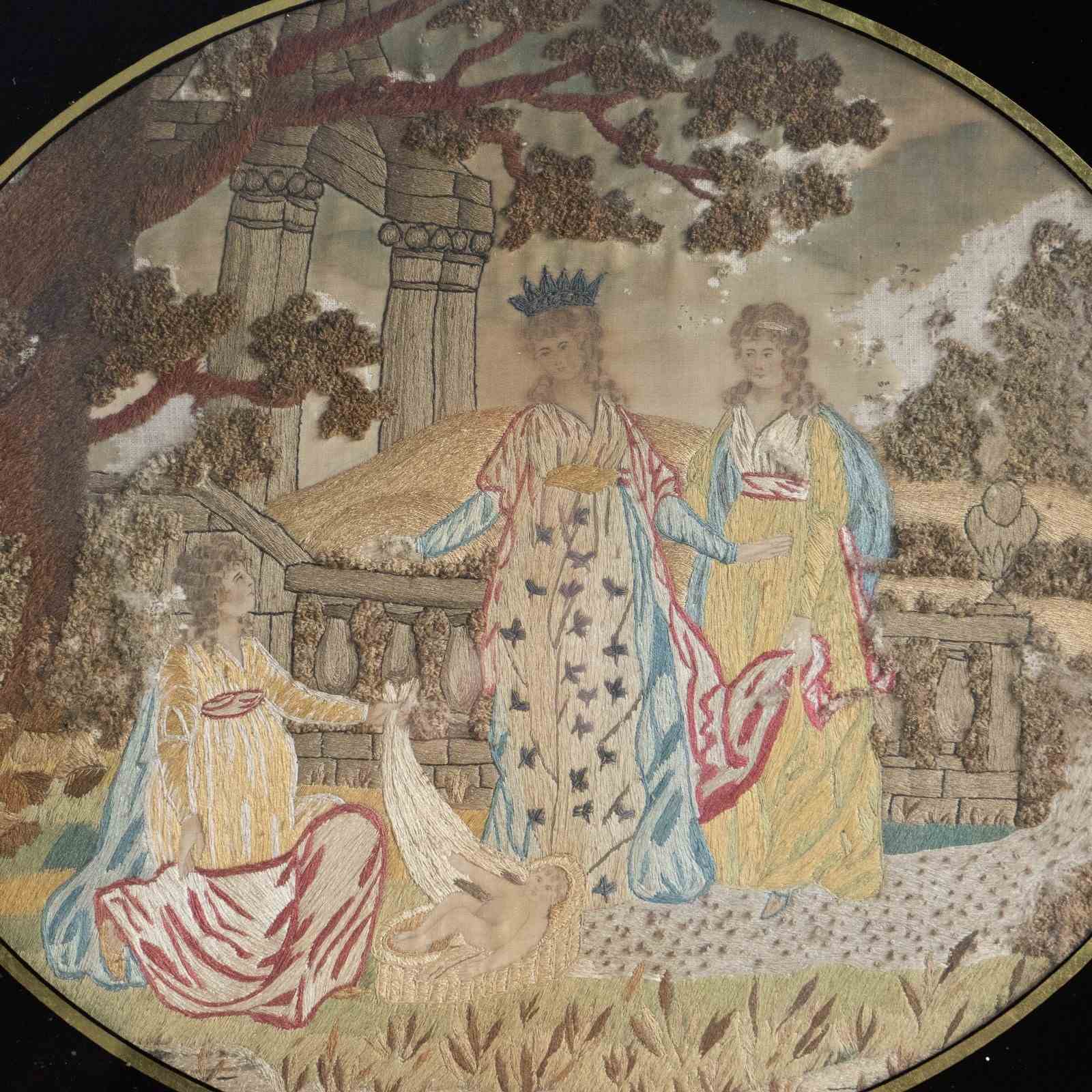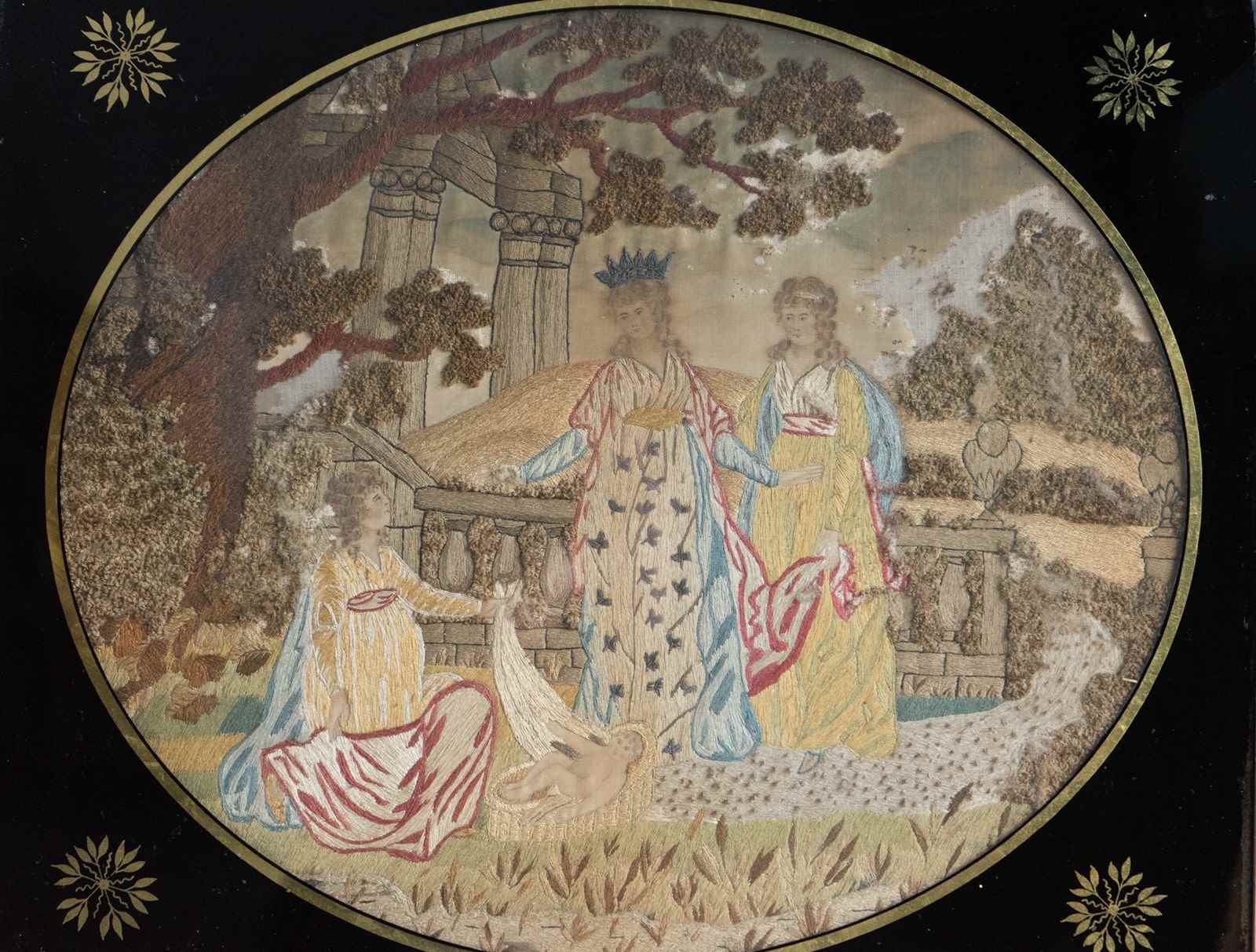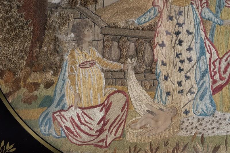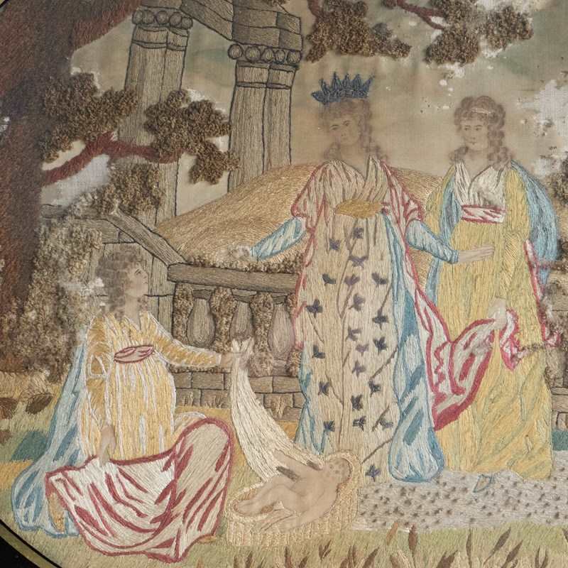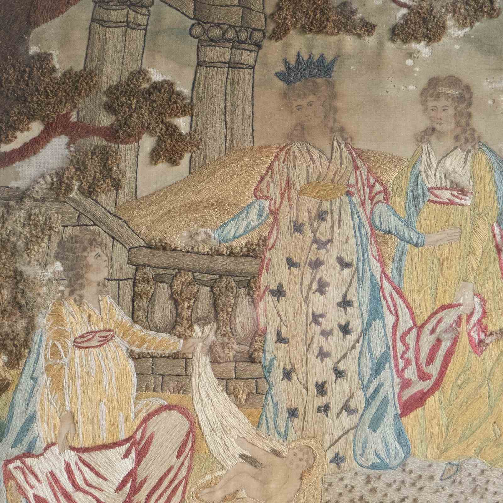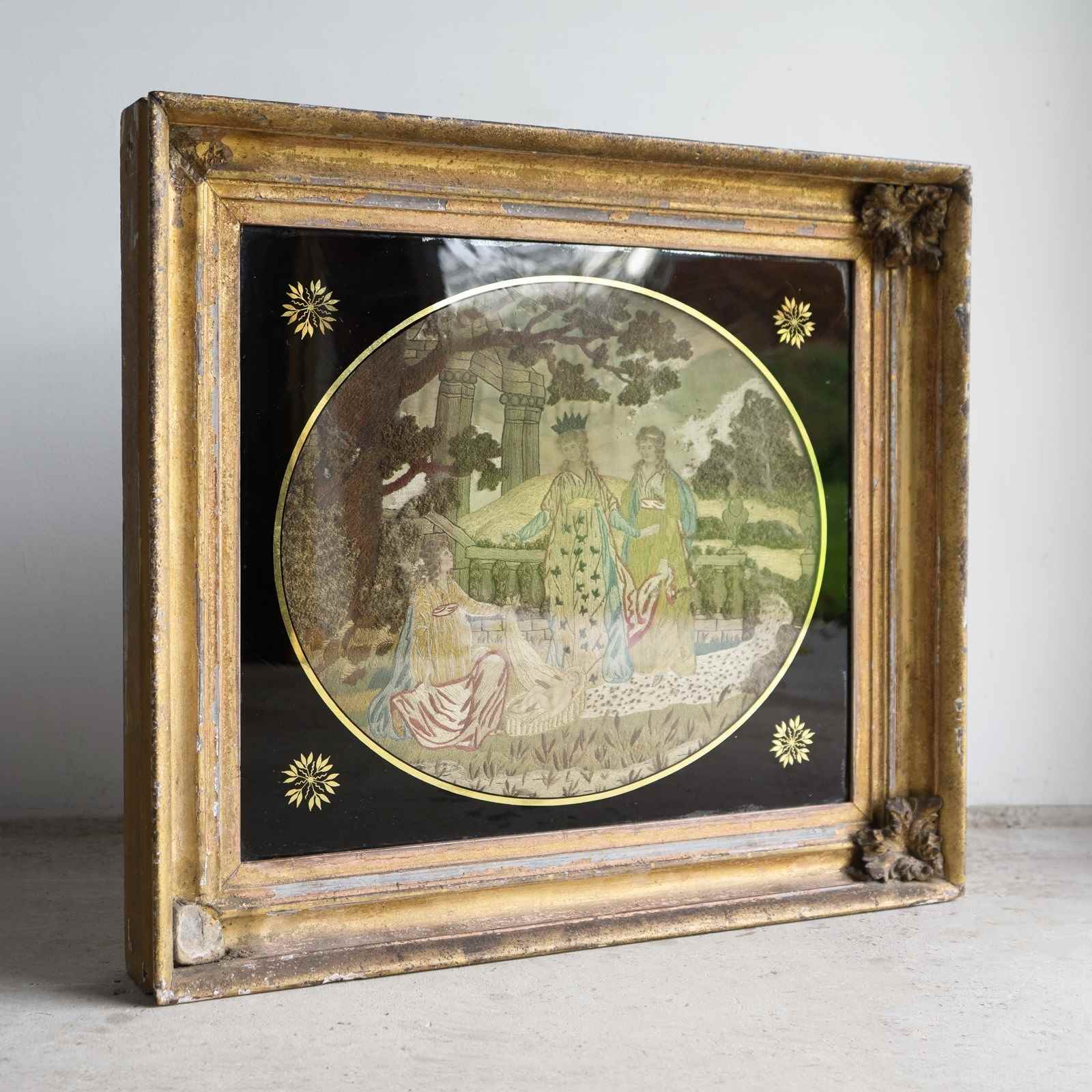 Antique Georgian Silkwork Embroidery, Moses In The Bullrushes, Verre Eglomise
