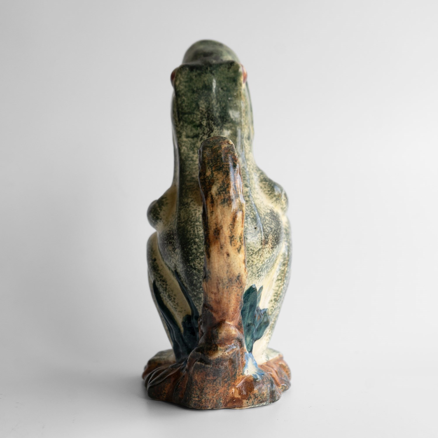 A decorative and characterful jug in the form of a frog with his mouth wide open to be used as the spout and stood on a naturalistic base with pretty blue flowers and a ‘faux bois’ handle.