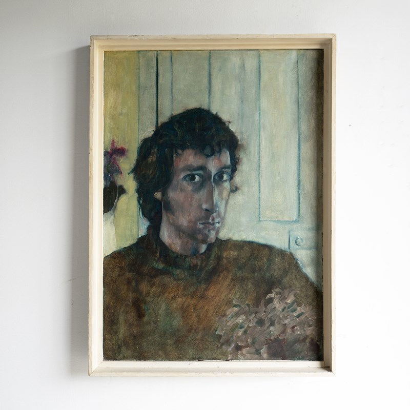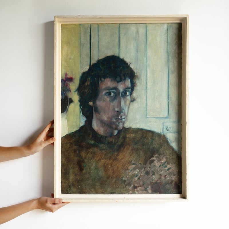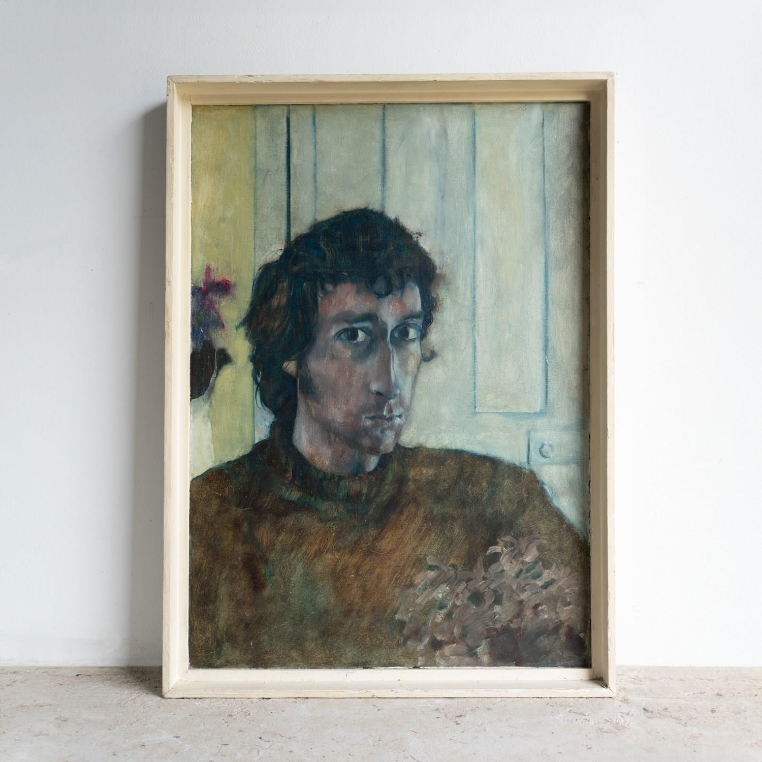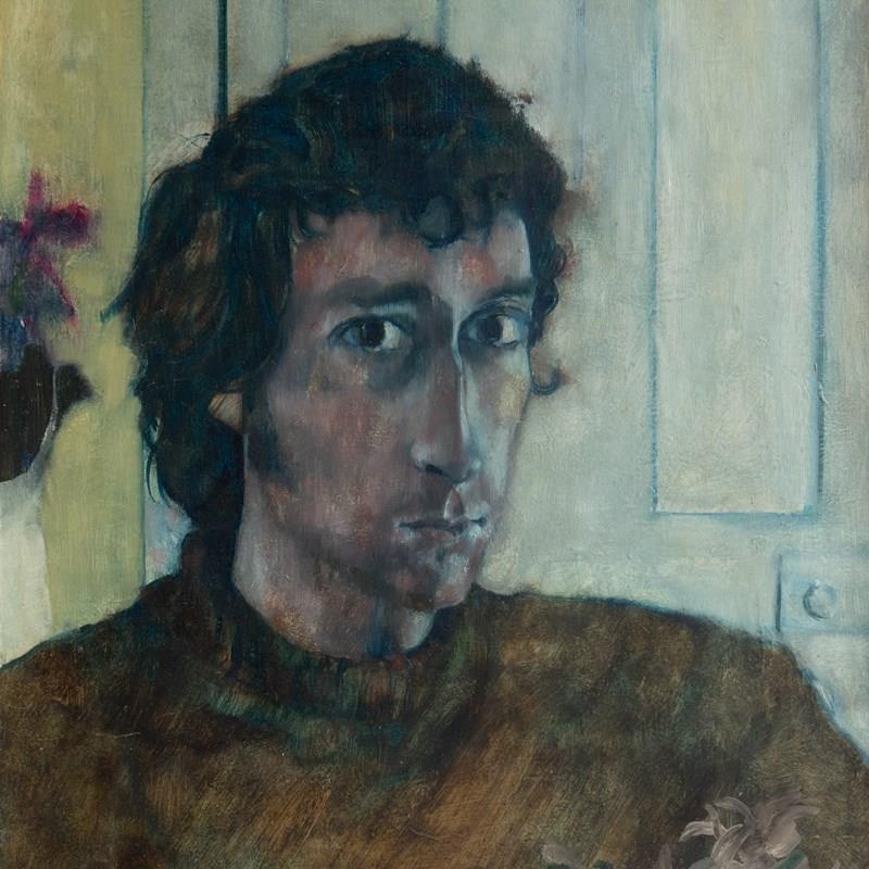 Ian Hunter (1939-2017) was a figurative artist who mainly painted in oils. During his career he exhibited at the Barbican Centre, Hayward Gallery and the Royal Academy of Arts, London and had a major solo exhibition in 1983 at the Newlyn Art Gallery, Cornwall. He was also a well-respected art teacher at many prestigious art schools and institutions, rising to become Dean of Art at Central Saint Martin’s in the 1980s. Prior to that, he was head of fine art at Cheltenham School of Art in the 1970s, which would tie in with the address on the exhibition label verso. The address on the framing label is prior to 1974, so I would imagine the portrait dates from the early 1970s or possibly the late 1960s period.