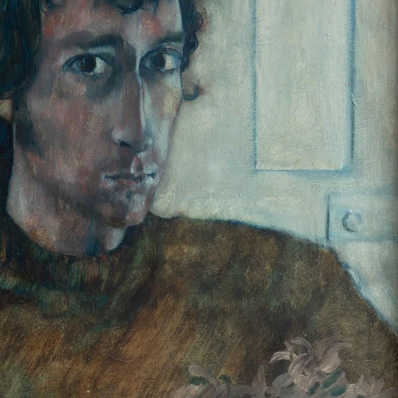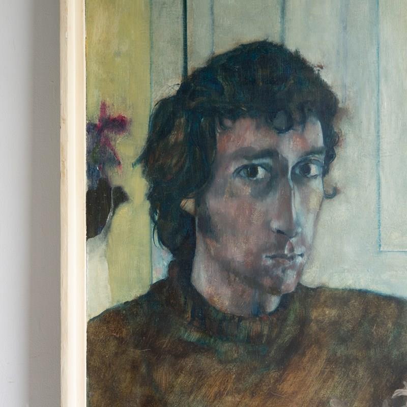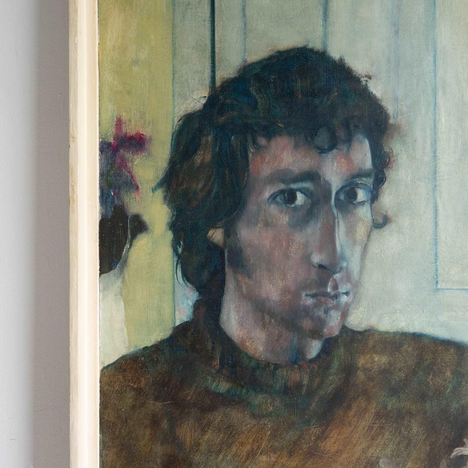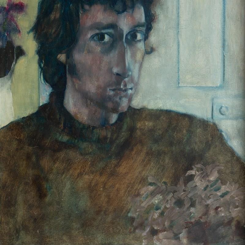 Ian Hunter (1939-2017) was a figurative artist who mainly painted in oils. During his career he exhibited at the Barbican Centre, Hayward Gallery and the Royal Academy of Arts, London and had a major solo exhibition in 1983 at the Newlyn Art Gallery, Cornwall. He was also a well-respected art teacher at many prestigious art schools and institutions, rising to become Dean of Art at Central Saint Martin’s in the 1980s. Prior to that, he was head of fine art at Cheltenham School of Art in the 1970s, which would tie in with the address on the exhibition label verso. The address on the framing label is prior to 1974, so I would imagine the portrait dates from the early 1970s or possibly the late 1960s period.