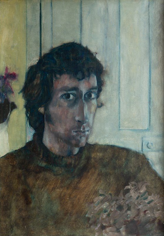 A captivating portrait depicting a man in a brown woollen jumper in an interior in front of a 19th-century panelled door and next to a pot plant.