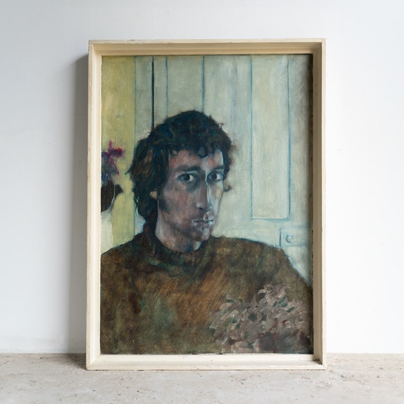Captivating Portrait Of A Man By A Door, Vintage Original Oil Painting, 1970S