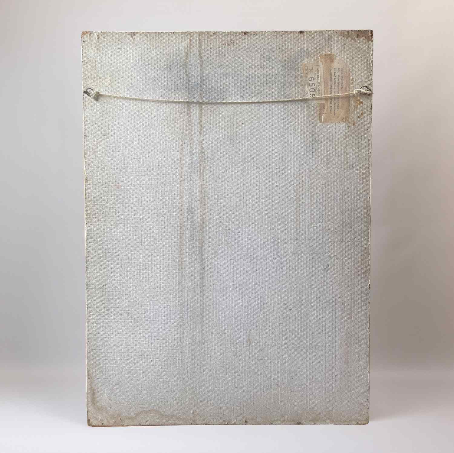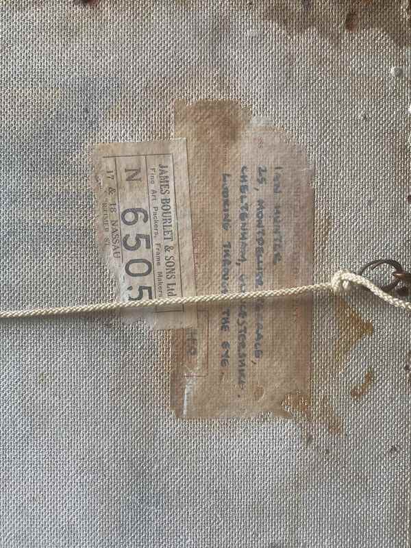 The work is unsigned, but there is an exhibition label verso for the United Society of Artists, with the artist’s name ‘Ian Hunter’, and address, ‘25 Montpelier Terrace, Cheltenham’. The work is also titled ‘Looking Through the Eye’ and priced at ‘40 Guineas’.