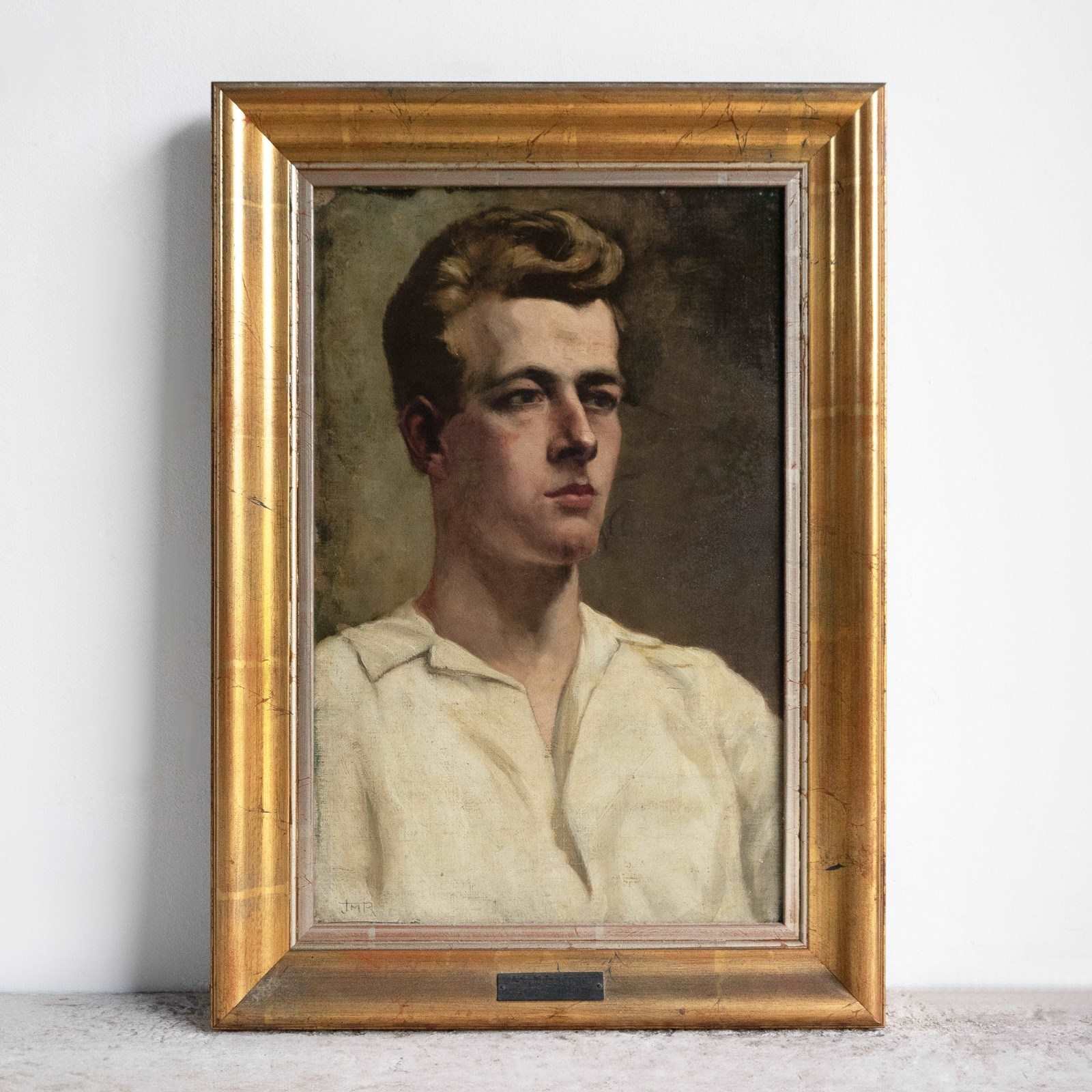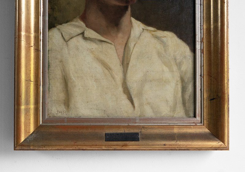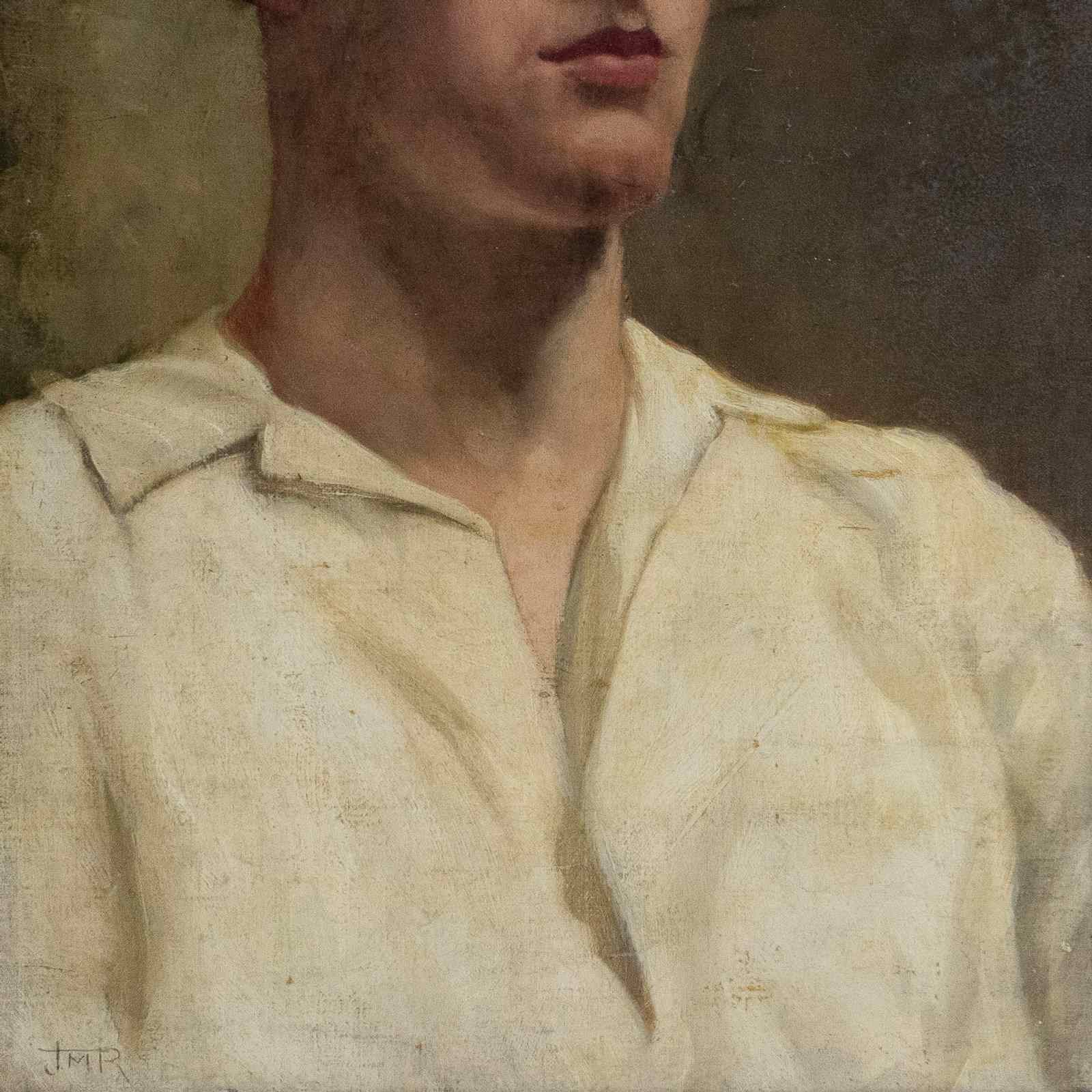 Captivating Portrait Of A Man In A White Shirt, Vintage Original Oil Painting