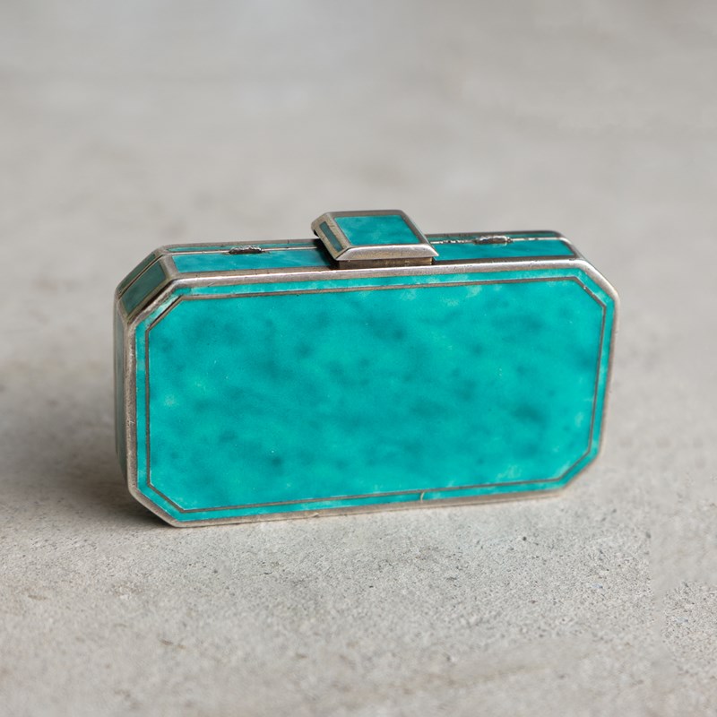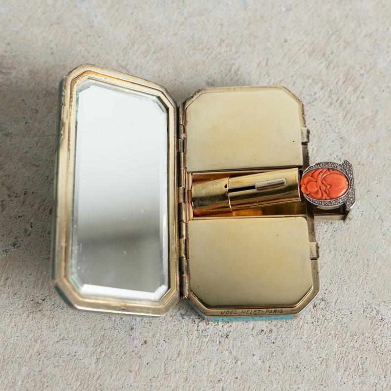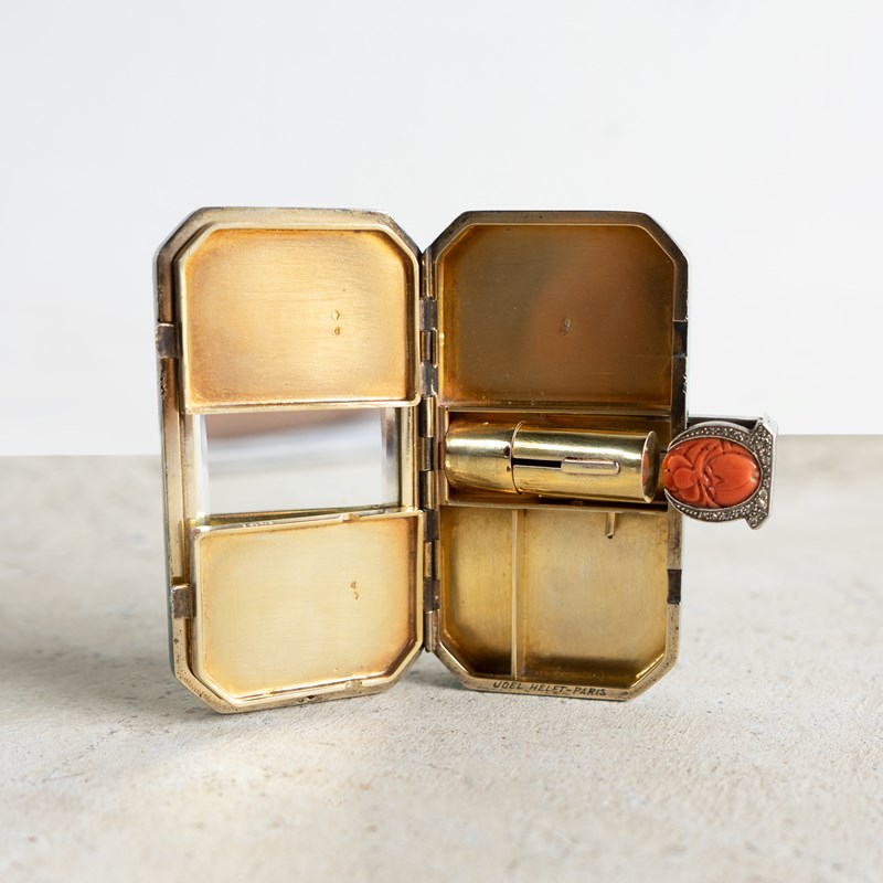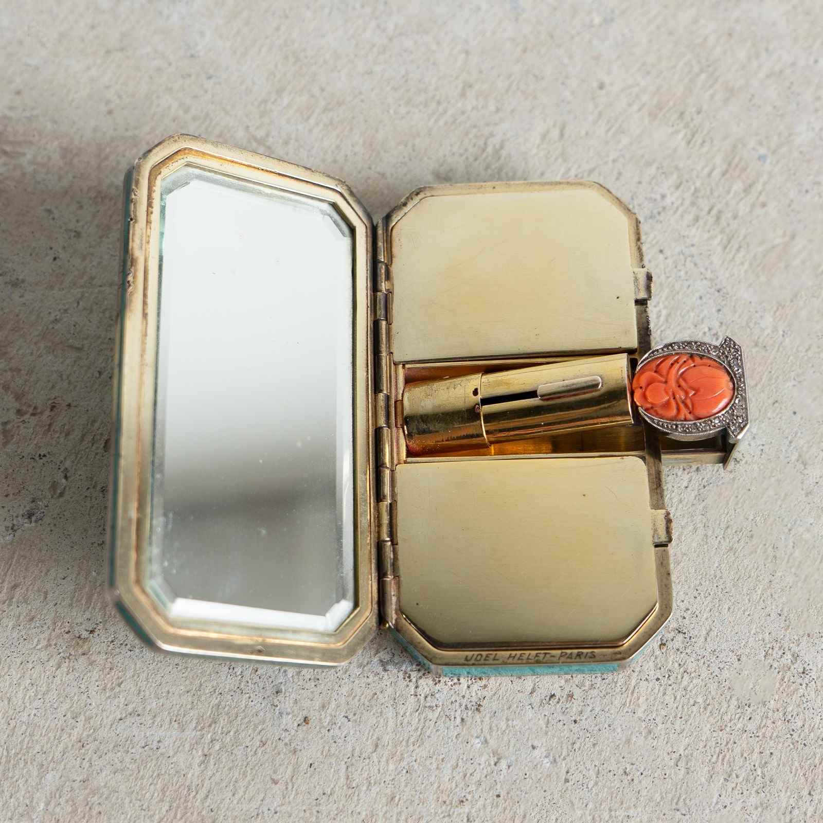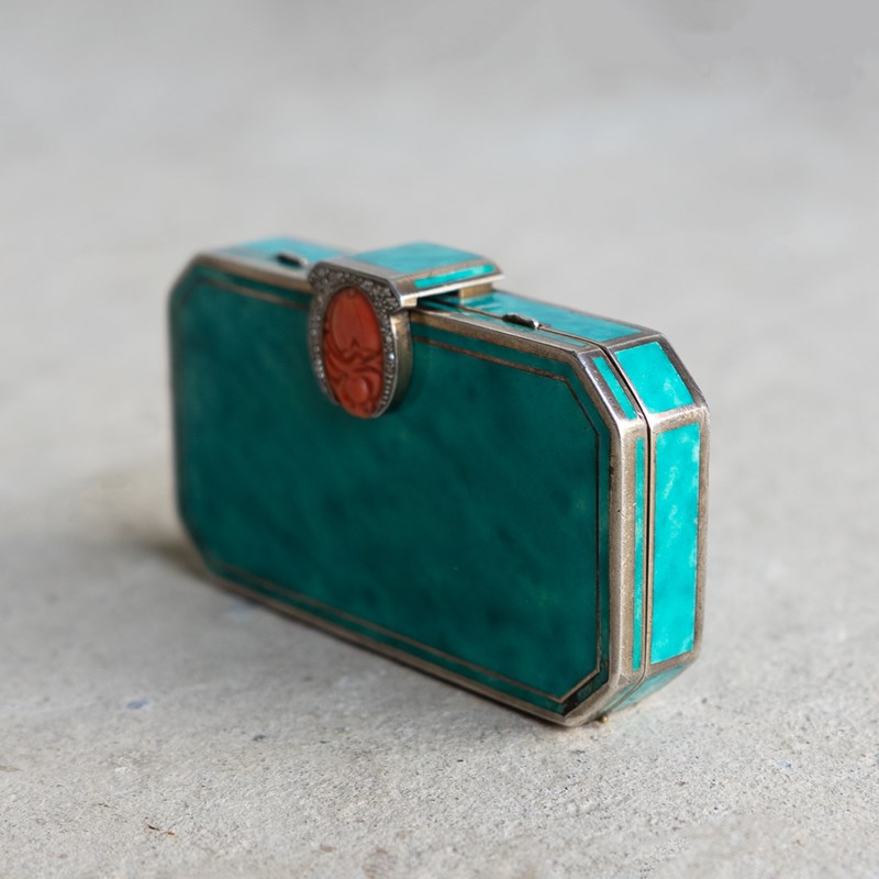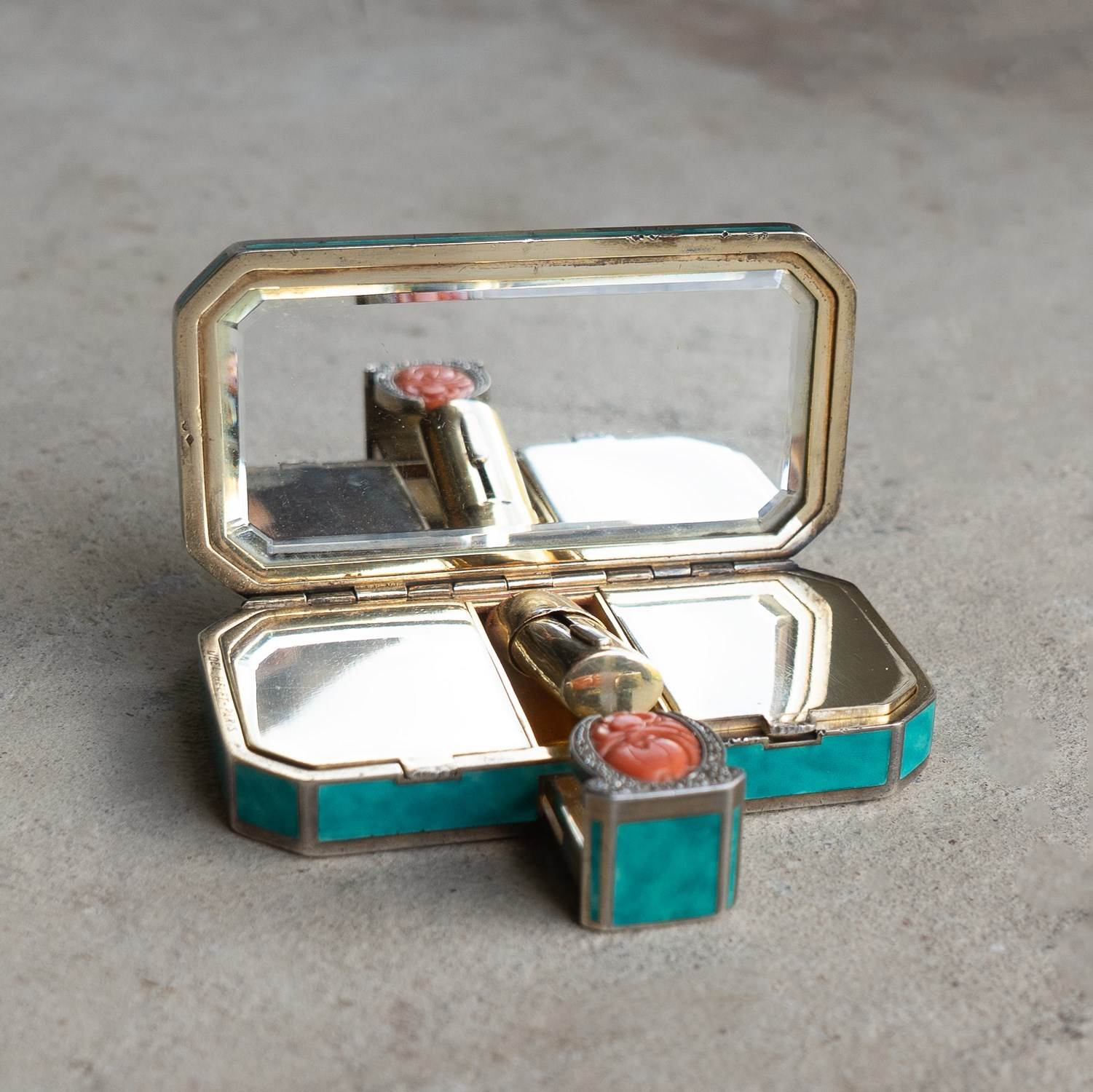 A beautiful and good-quality piece made from silver, which has been enamelled on the exterior to imitate malachite. The clasp features a stylised carved coral section depicting flowers surrounded by diamonds. The clasp opens to reveal a gilt interior with a bevelled mirror and two compartments flanking a central lipstick holder.