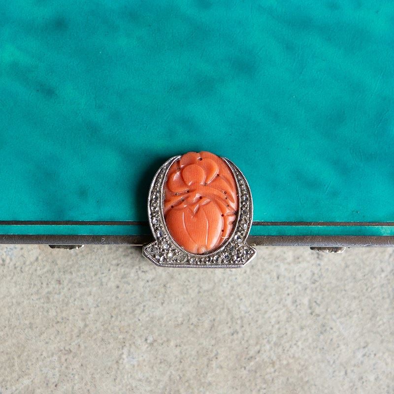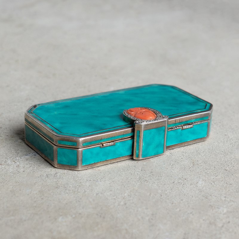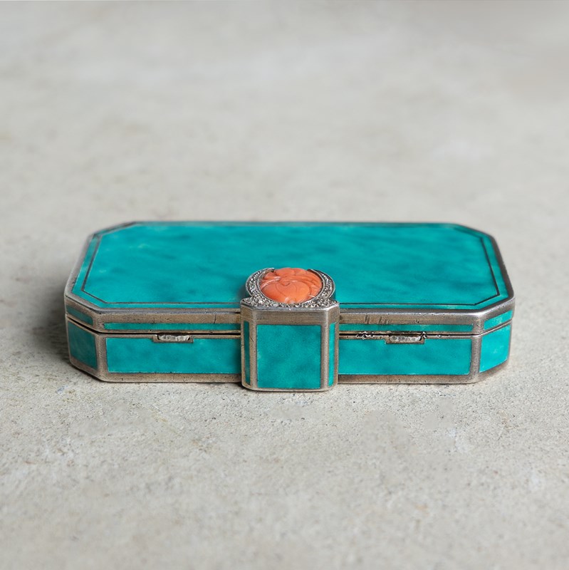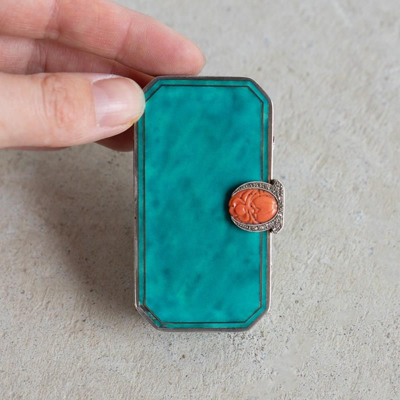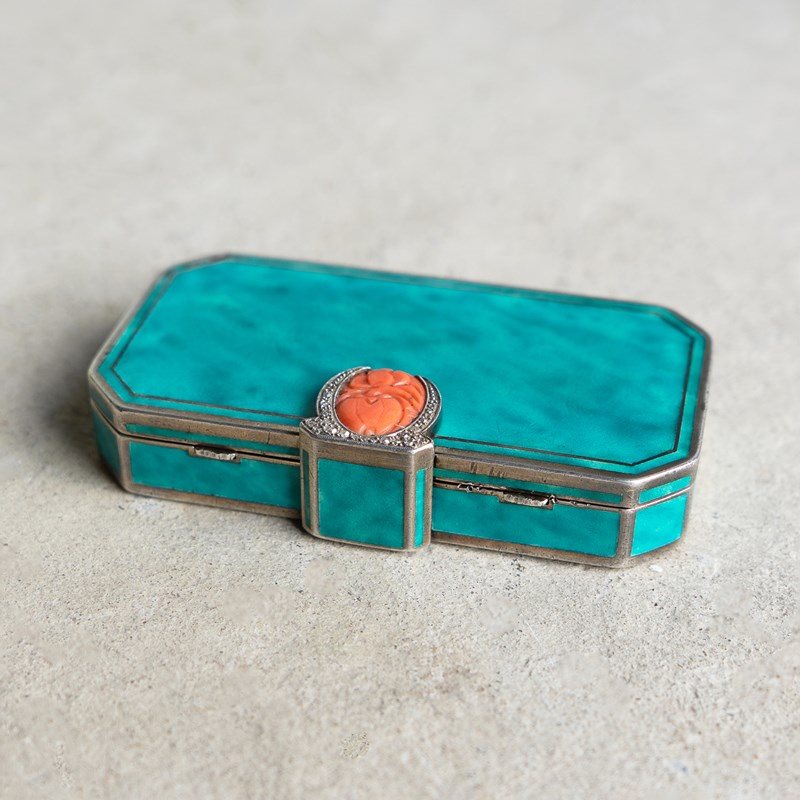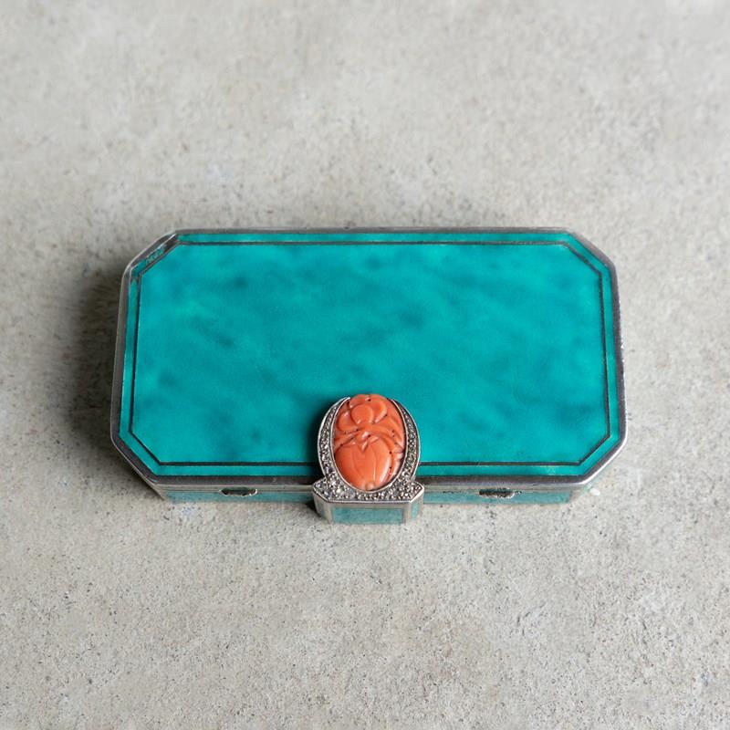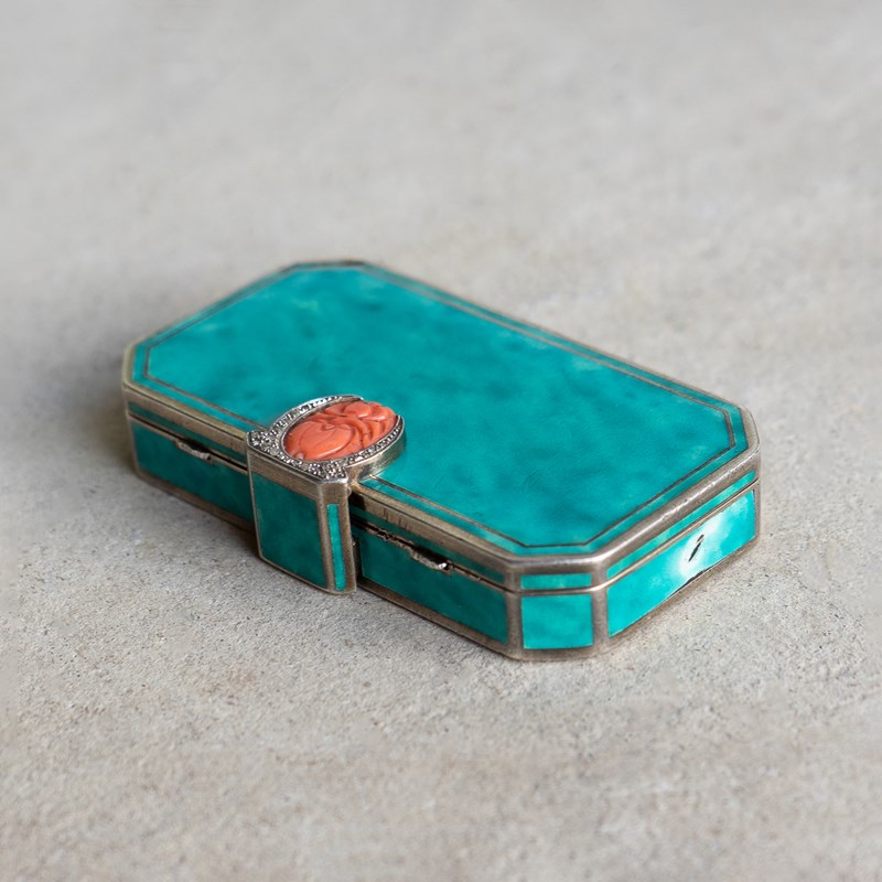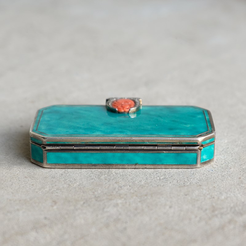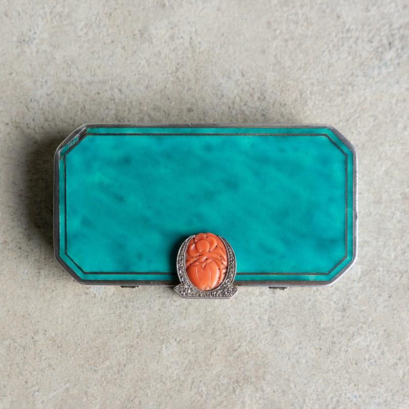 French Art Deco Silver, Enamel, Coral & Diamond Compact Box By Augusta Peyroula