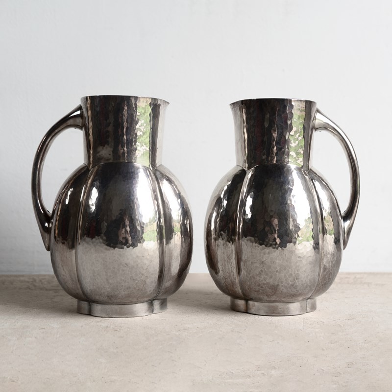 Known as the melone jug, a stylish, naturalistic form that was available in either plain or hammered finish metal. This is the hammered finish, and it really does emphasise the naturalistic form of the piece.