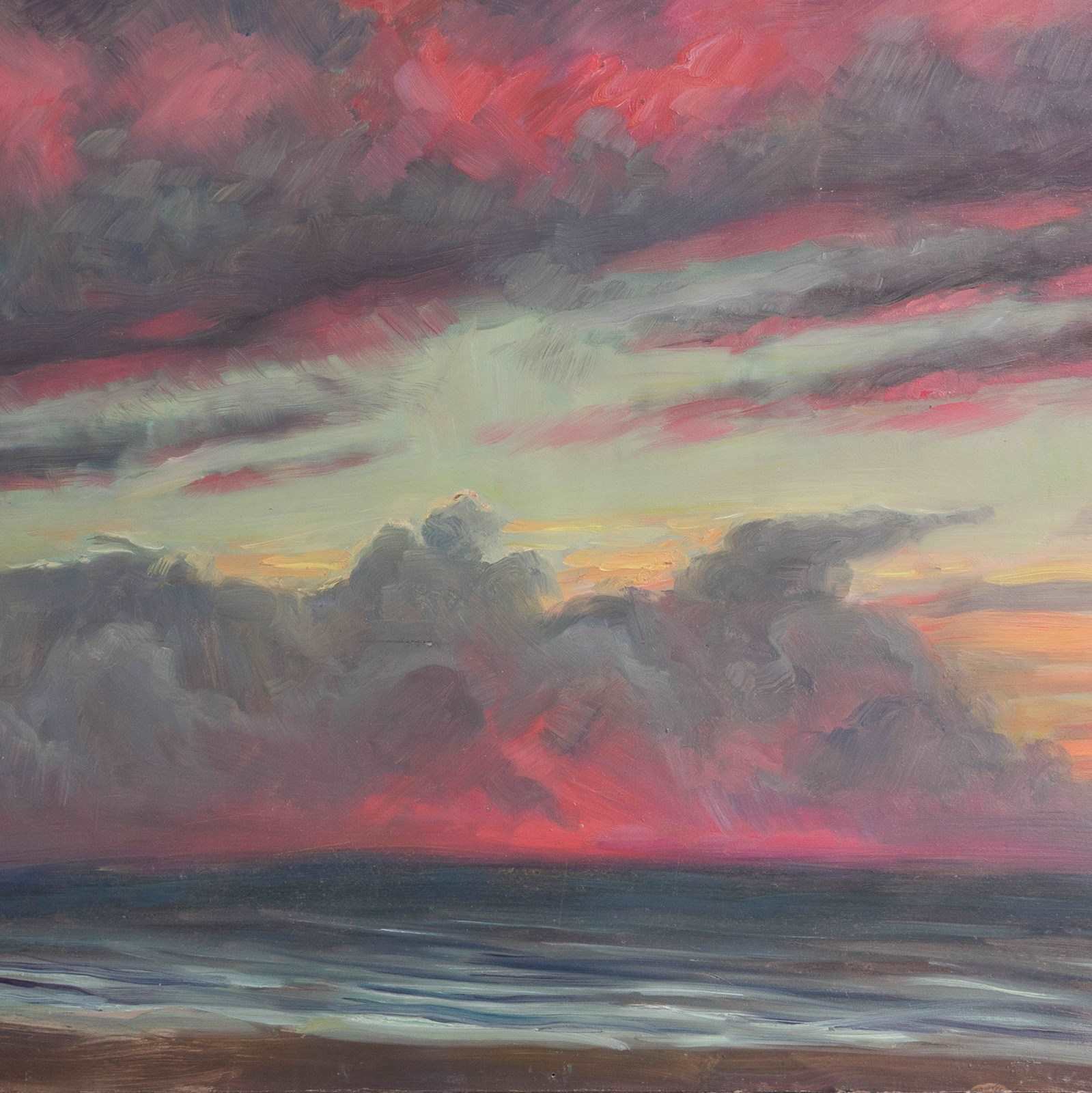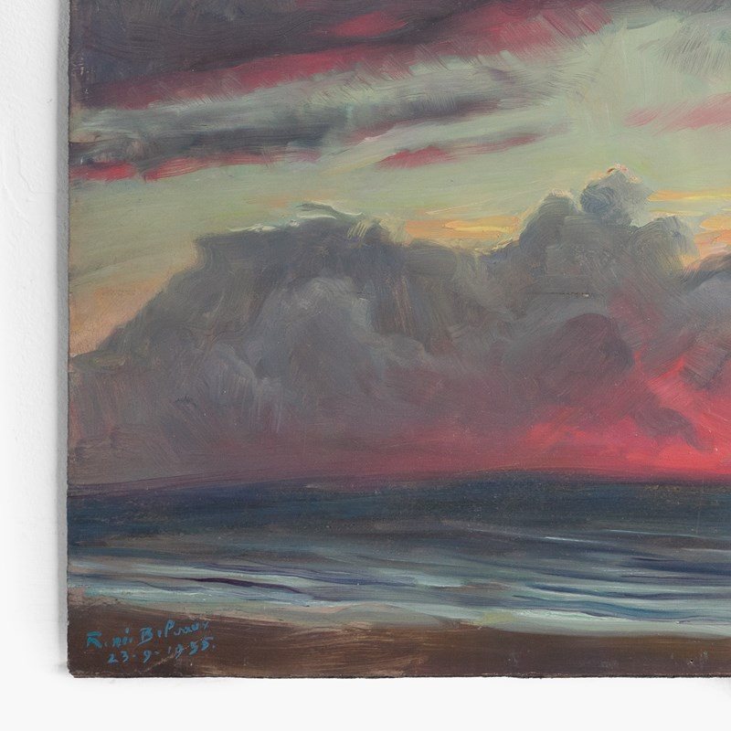 Antique original oil on wooden panel painting. Depicting a seascape at sunset with vivid colours, rippling waves and dramatic clouds.