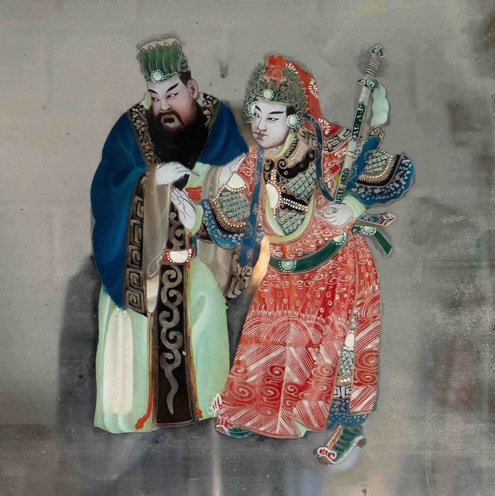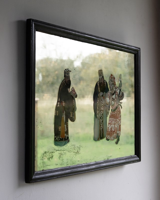 The figures are skillfully painted on the reverse of the glass, and due to their elaborate headdresses, robes and beards, probably depict high-ranking officials.