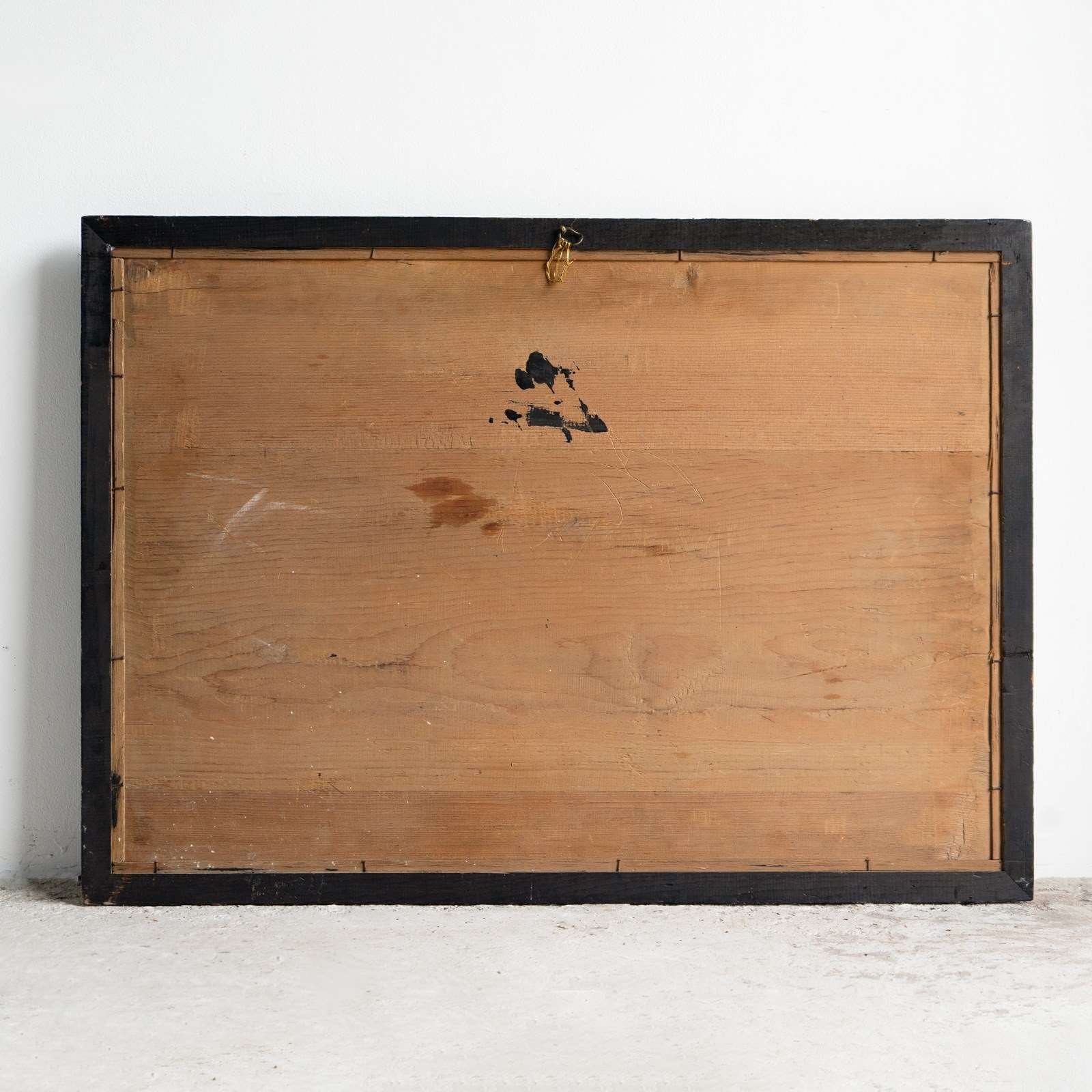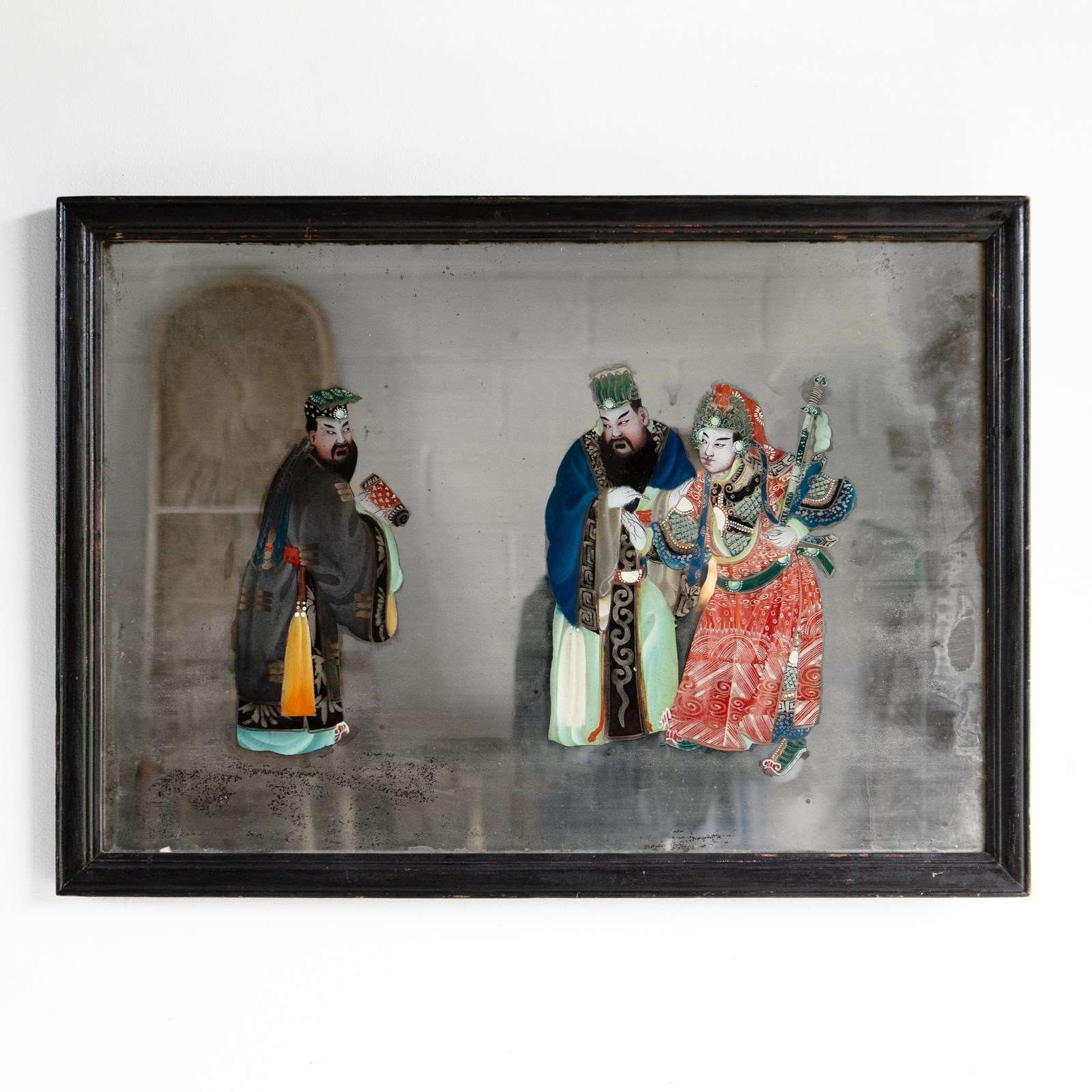 Overall, the piece is in great vintage condition. The glass is free from damage. The painted figures are bright and vibrant and have only very minor wear consistent with age. The original mirror plate is worn in places and, in our opinion, beautifully foxed and highly decorative. The frame is in good vintage order with only minor wear commensurate with age.