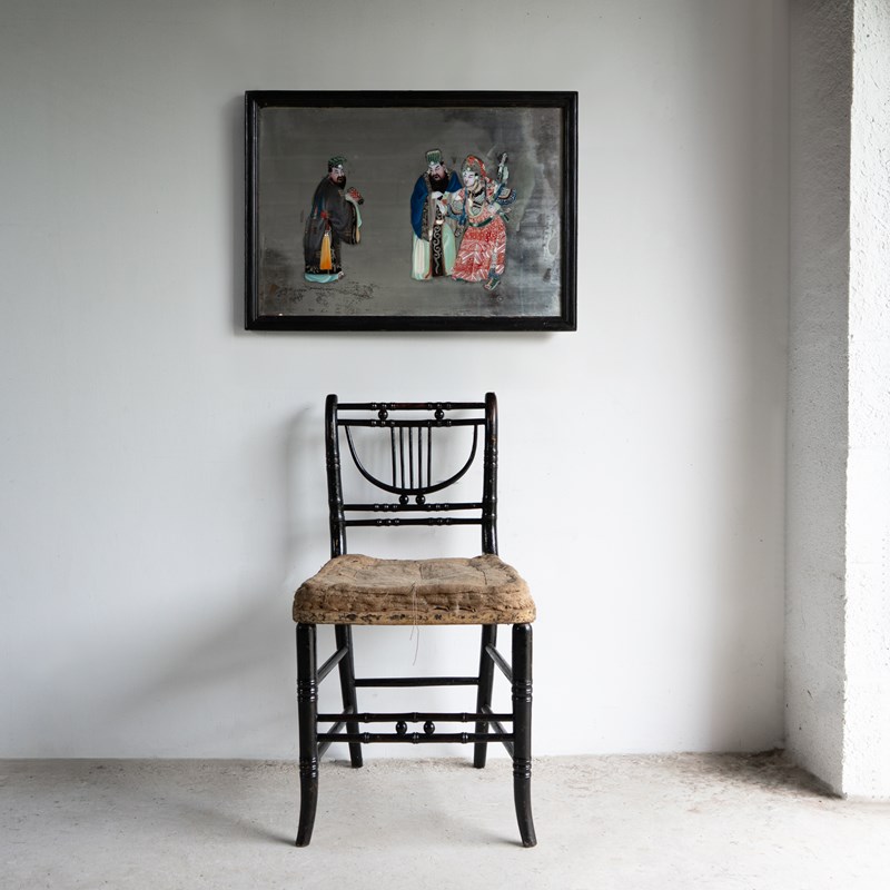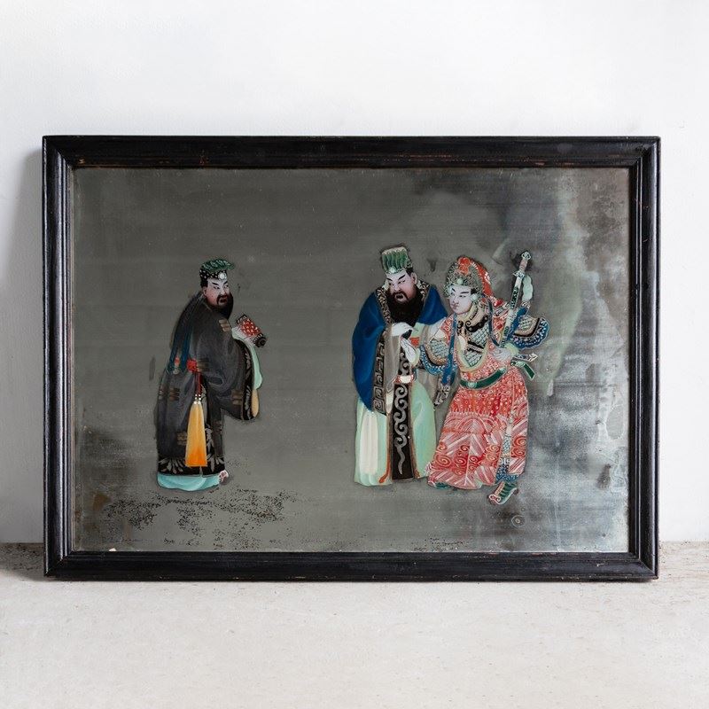 Large Antique Chinese Export Reverse Painted Mirror, Glass Painting 19Th Century