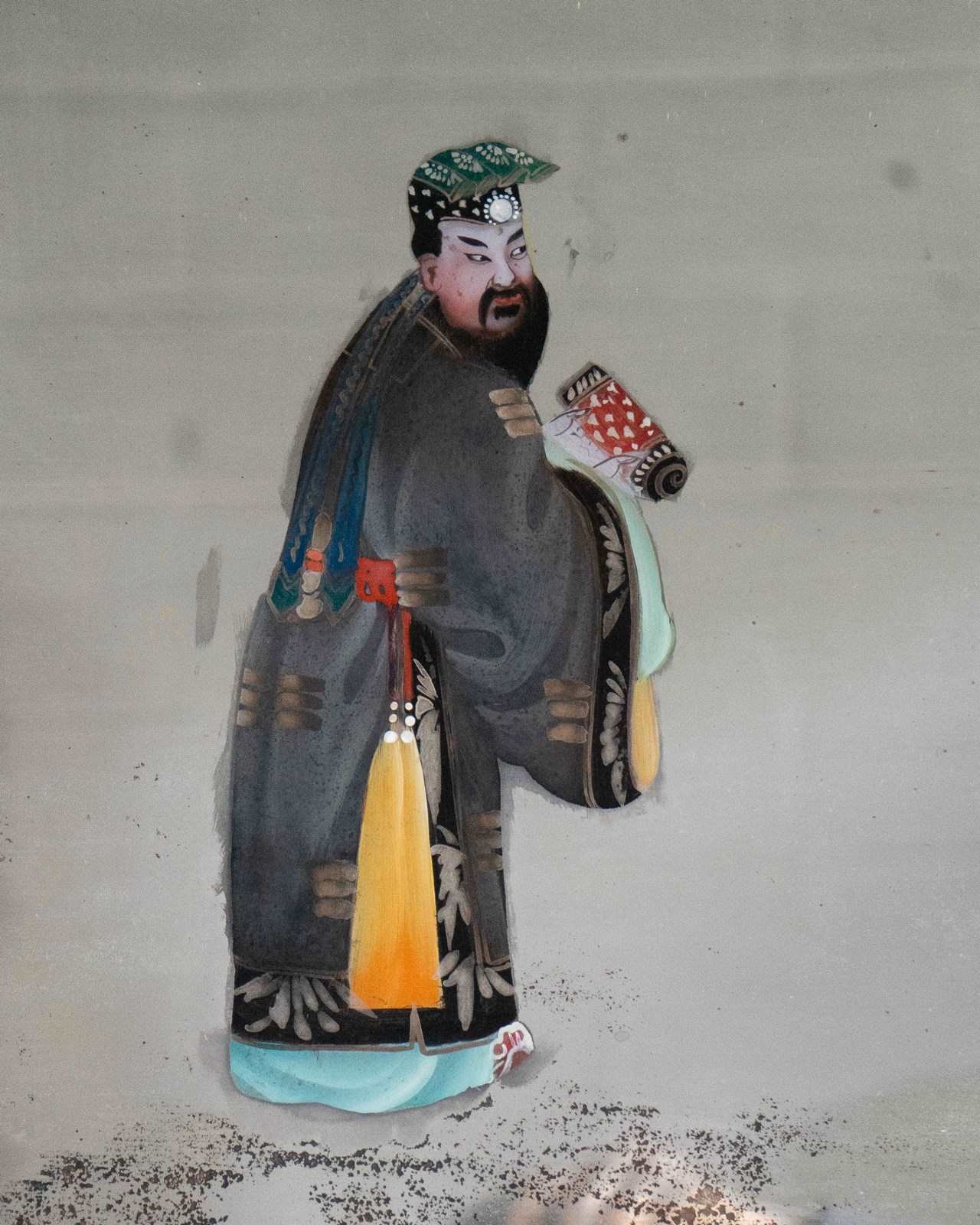 One figure is holding a scroll, which could represent a document, map or work of art; perhaps this is being presented to the two figures on the right, one of whom is holding a sword. Perhaps the figure on the left is presenting an important document to the emperor on the right, who is being protected by his bodyguard.